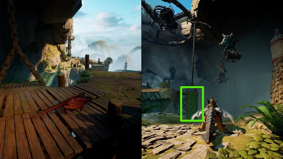 Когда лодка будет разрушена, зелёный игрок нажимает на клавишу действия и ждёт, пока напарник перепрыгнет через ущелье. С этого момента Мио может использовать крылья дракона, чтобы недалеко планировать. Используйте способность сейчас. Зои не удастся допрыгнуть до первого героя, но его спасёт собственный дракон — он может цепляться хвостом за плющ.