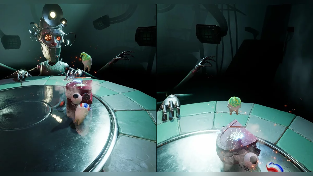 В этот момент появится босс «дантист». Он выберет одну жертву и начнёт сверлить зуб. Приятелю нужно успеть помочь другу и вытащить его, применяя рывок. Вскоре он выпустит на арену вставную челюсть. Можете попытаться сбросить её с арены или же дождаться, пока она перевернётся, чтобы нанести удары сверху.