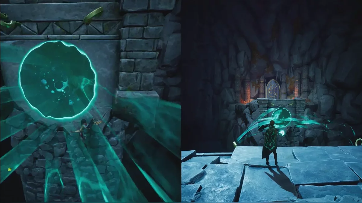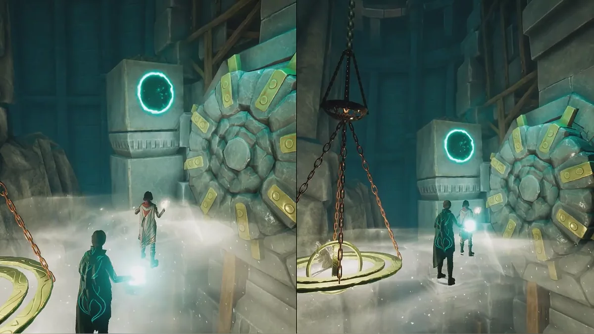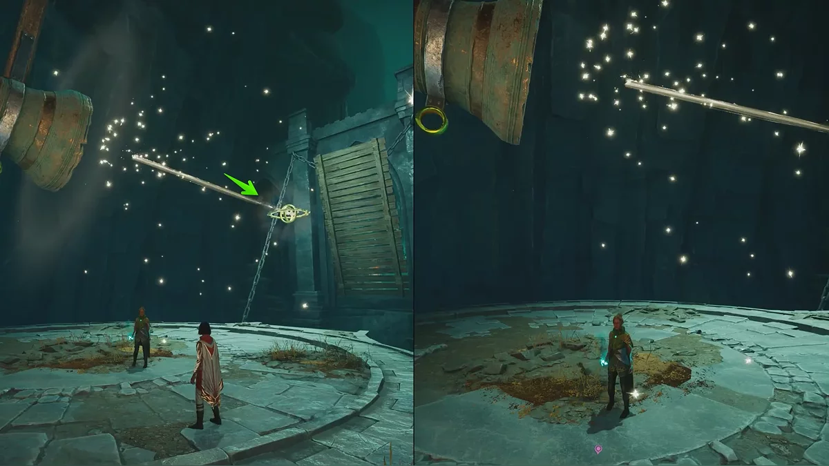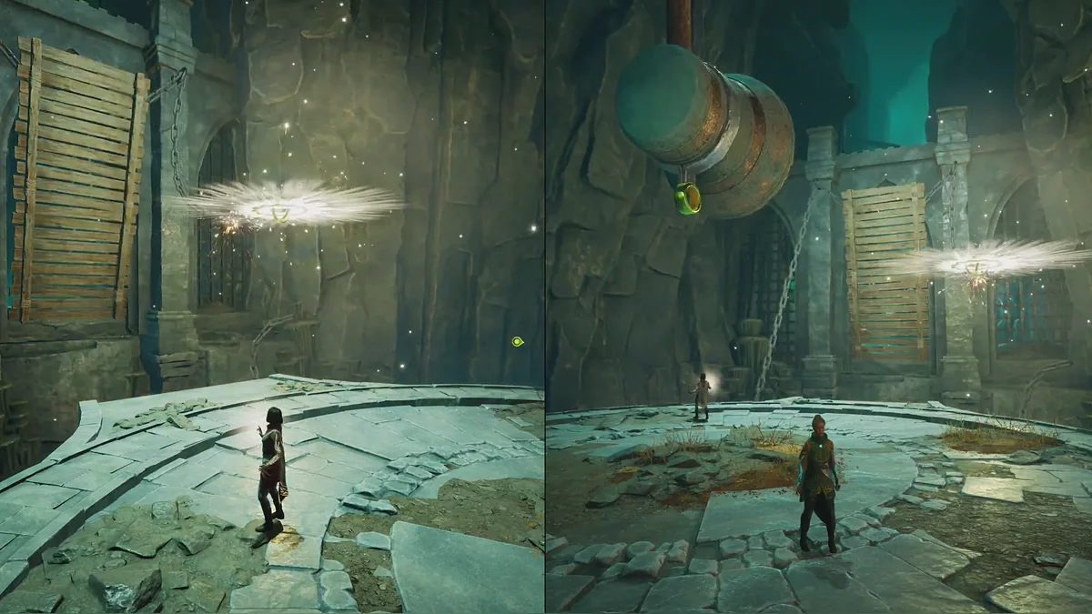 Следующая головоломка похожа на предыдущую, только сферу нужно притянуть вправо. Чтобы поднять тяжёлые каменные ворота, поднимайтесь на цепи по обе стороны прохода. После активации смотрите катсцену.