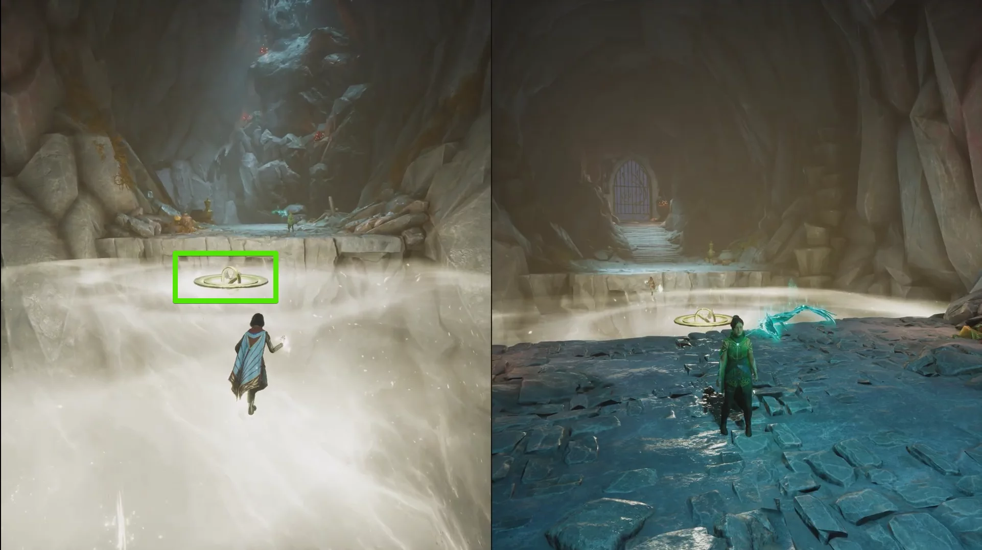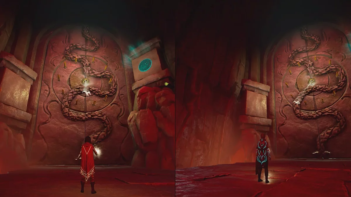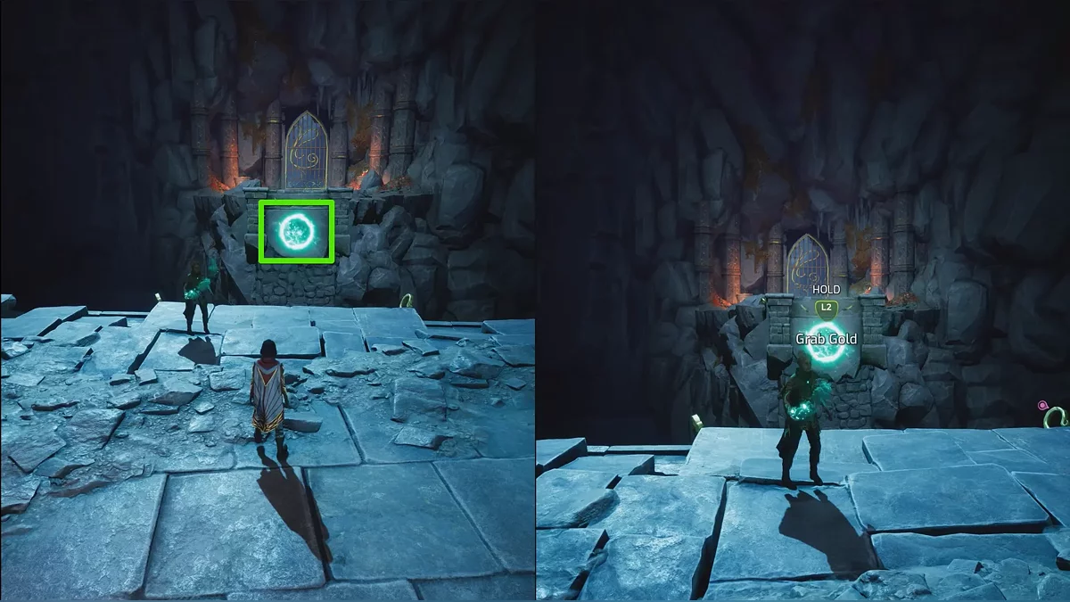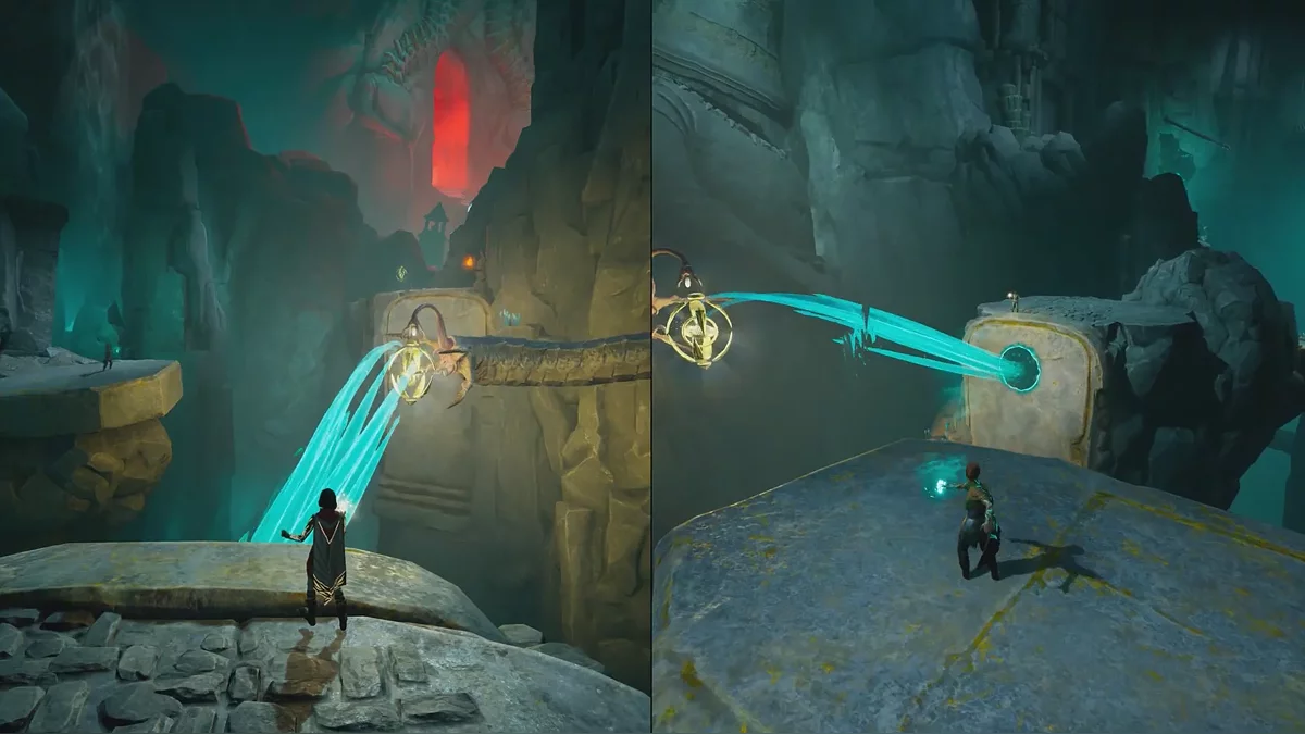 Следующая головоломка похожа на предыдущую, только сферу нужно притянуть вправо. Чтобы поднять тяжёлые каменные ворота, поднимайтесь на цепи по обе стороны прохода. После активации смотрите катсцену.