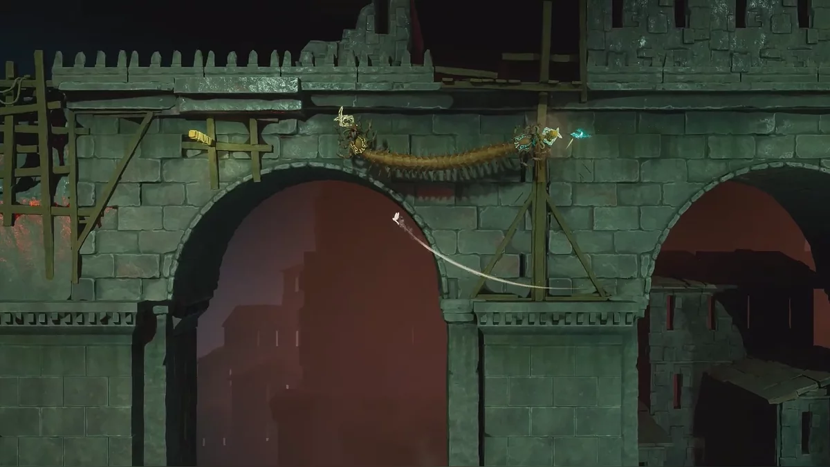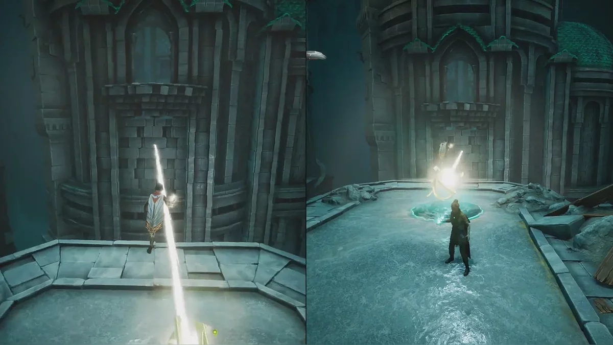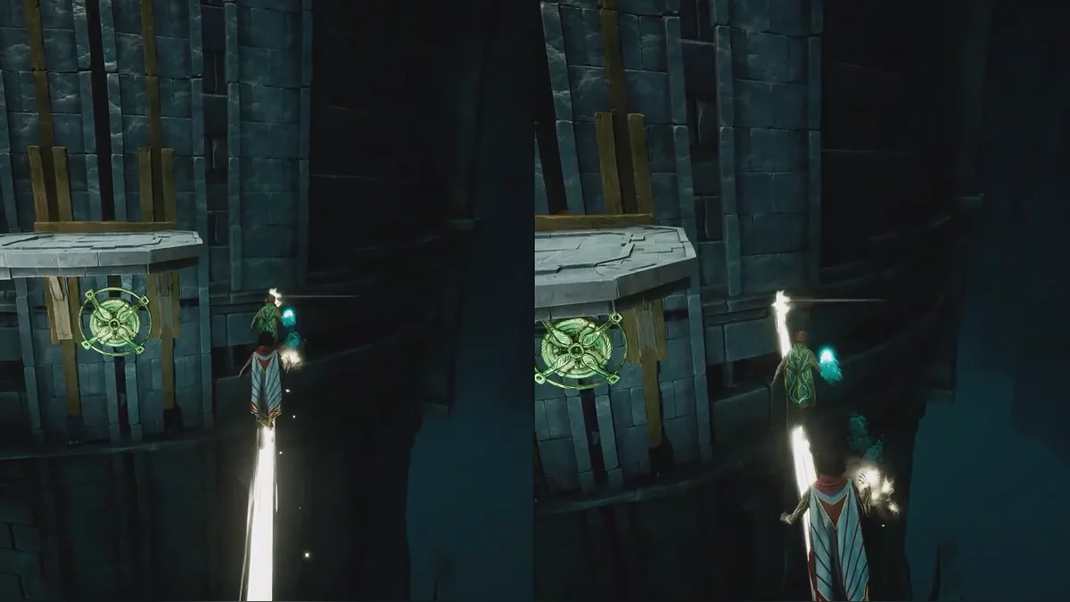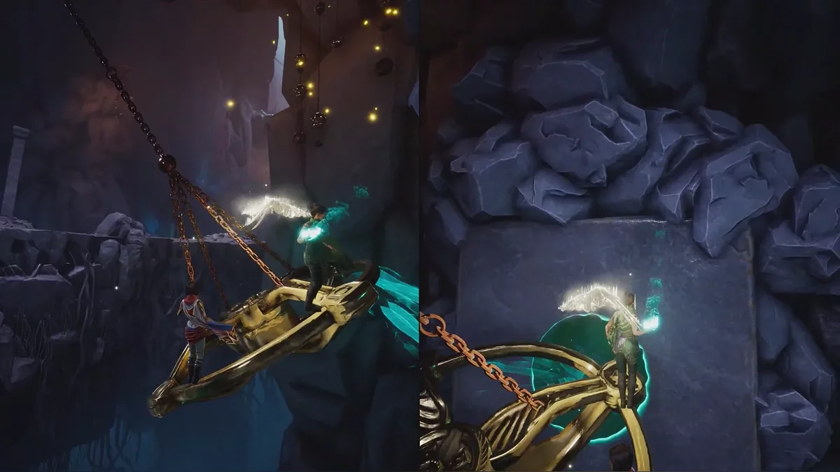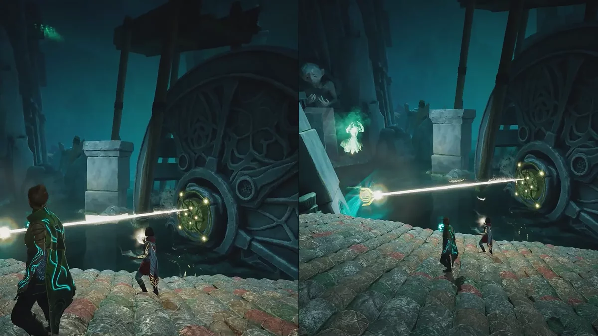 Теперь подтяните платформу к запертой решётке, затем поднимитесь по цепи справа и откройте её. После этого Зои перемещает платформу на противоположную сторону арки, а второй игрок может прыгнуть в воду, чтобы восстановиться рядом с напарником. Пока Зои управляет платформой, рядом начнут появляться духи — Мио должен уничтожать их с помощью совы.