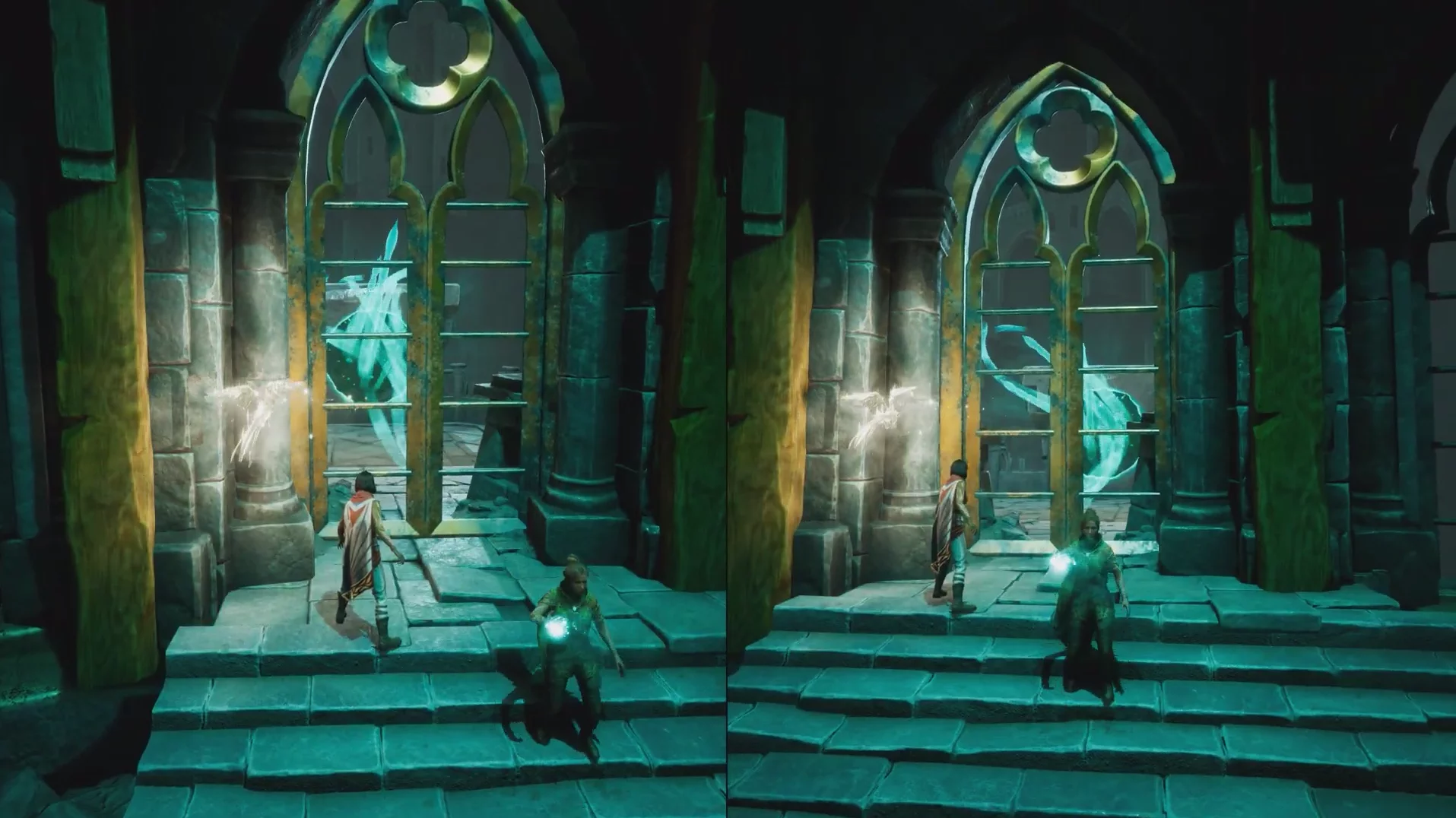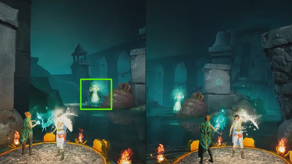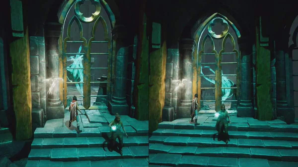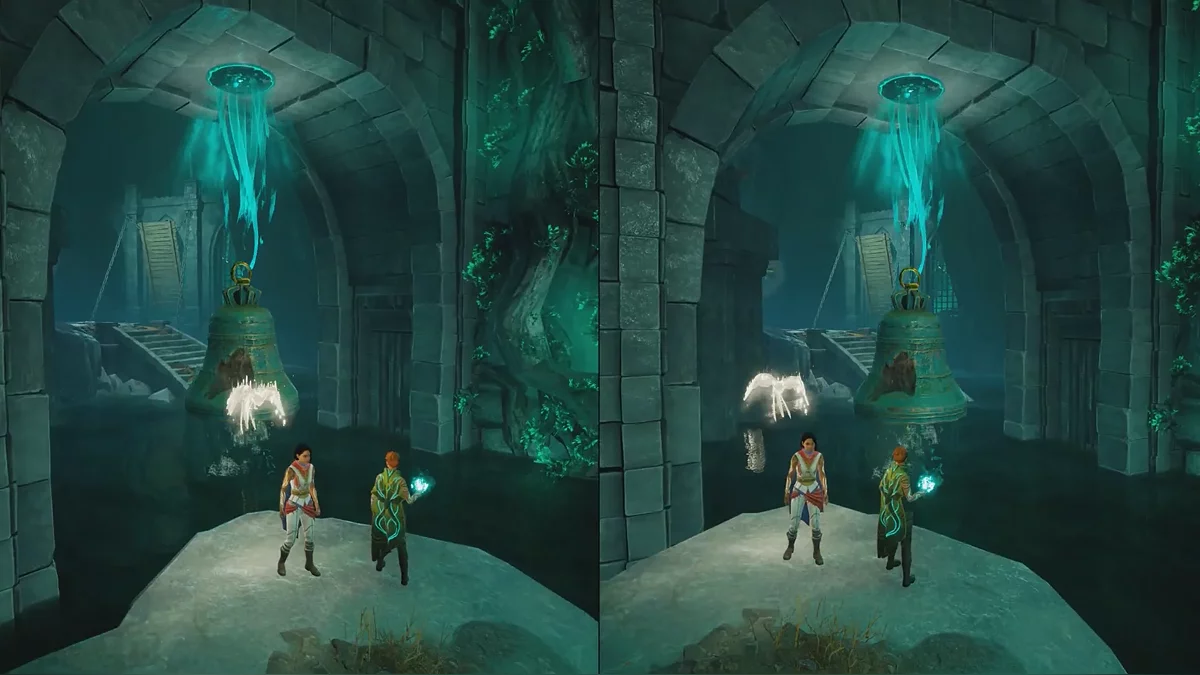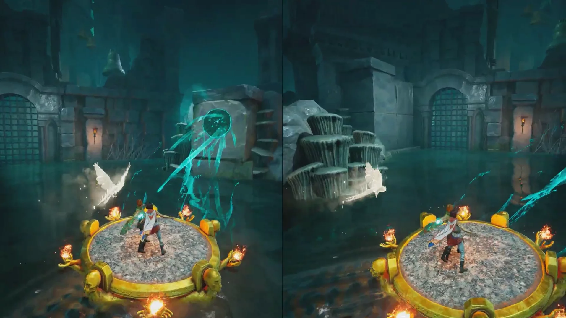 Теперь подтяните платформу к запертой решётке, затем поднимитесь по цепи справа и откройте её. После этого Зои перемещает платформу на противоположную сторону арки, а второй игрок может прыгнуть в воду, чтобы восстановиться рядом с напарником. Пока Зои управляет платформой, рядом начнут появляться духи — Мио должен уничтожать их с помощью совы.