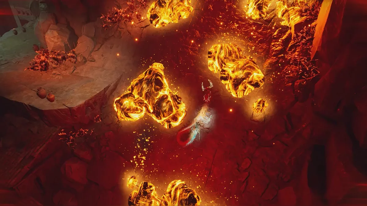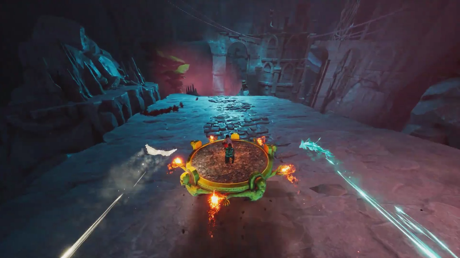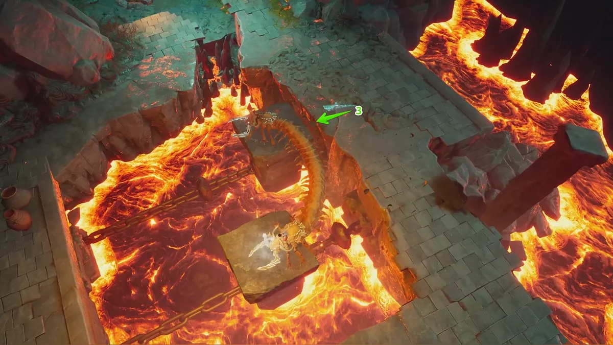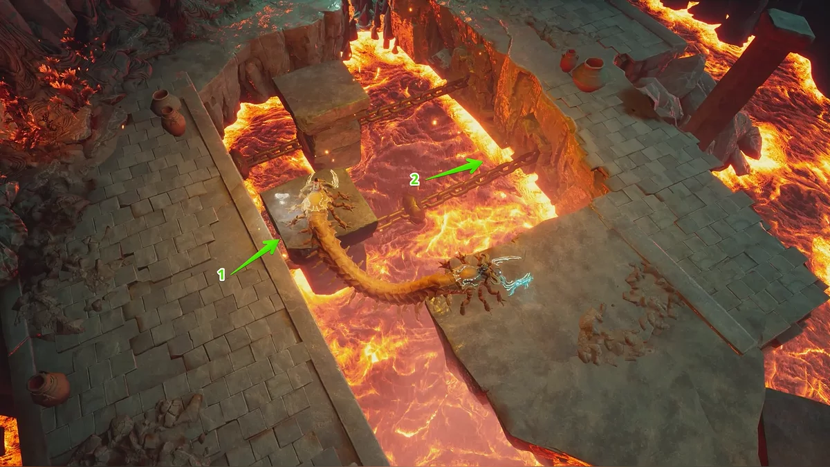 С этого момента вы будете управлять тем самым ранее окаменелым существом. Используйте клавиши действия, чтобы разрушать предметы. Одними из первых ключевых объектов станут цепи, удерживающие каменную платформу в реке магмы. Затем хватайтесь за крюки цепей справа и слева от решётки и тяните их вниз.