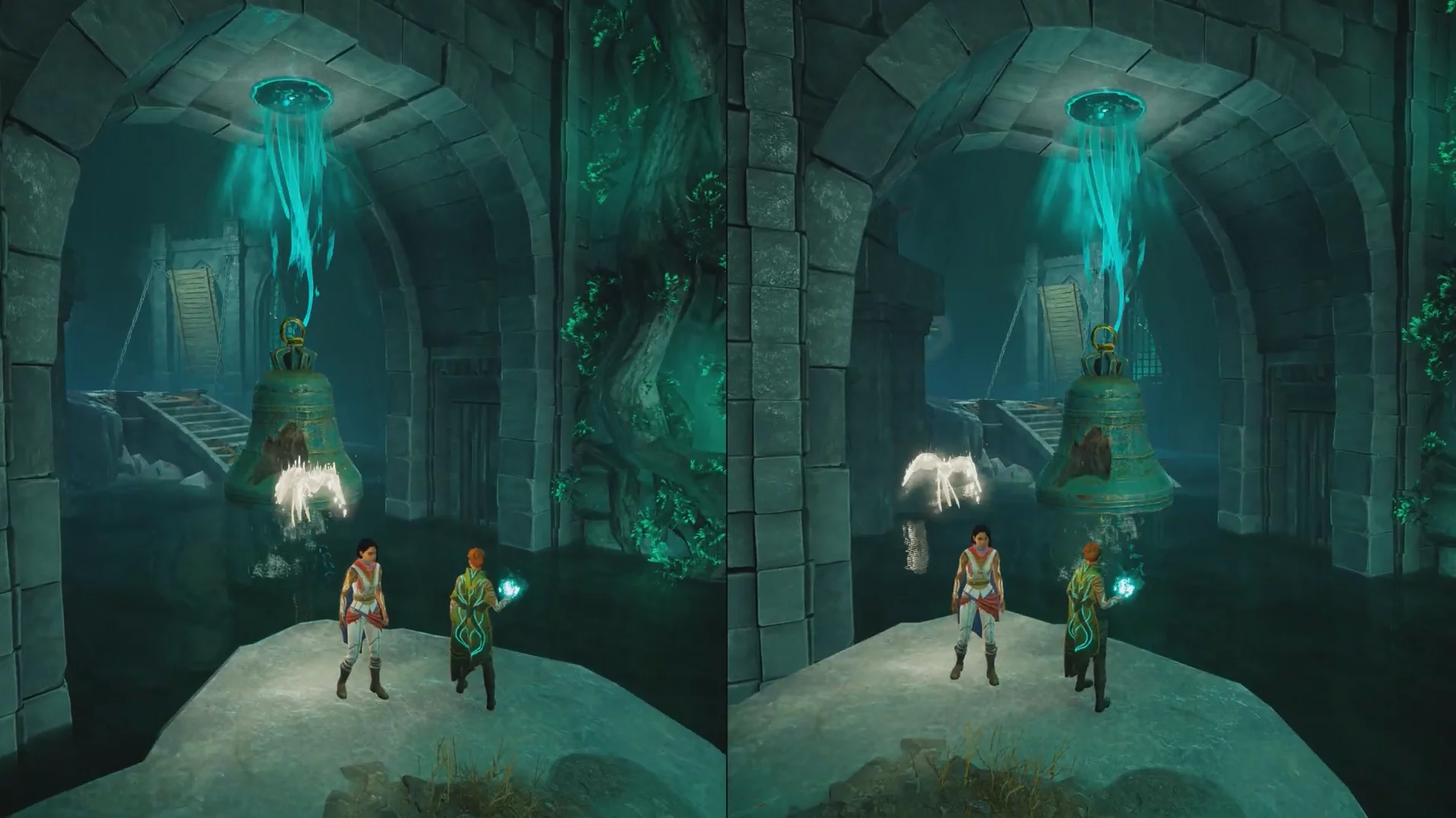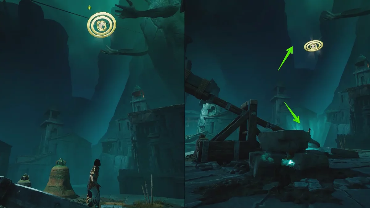 Поднимайтесь на крышу здания, а с неё — при помощи колокола — на разрушенный мост. Впереди будет тупик: в воде видна лишь верхушка другого колокола. Поднимите его навыком Зои и зацепитесь за него крюком.