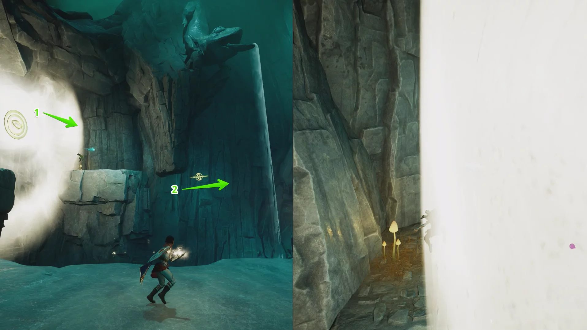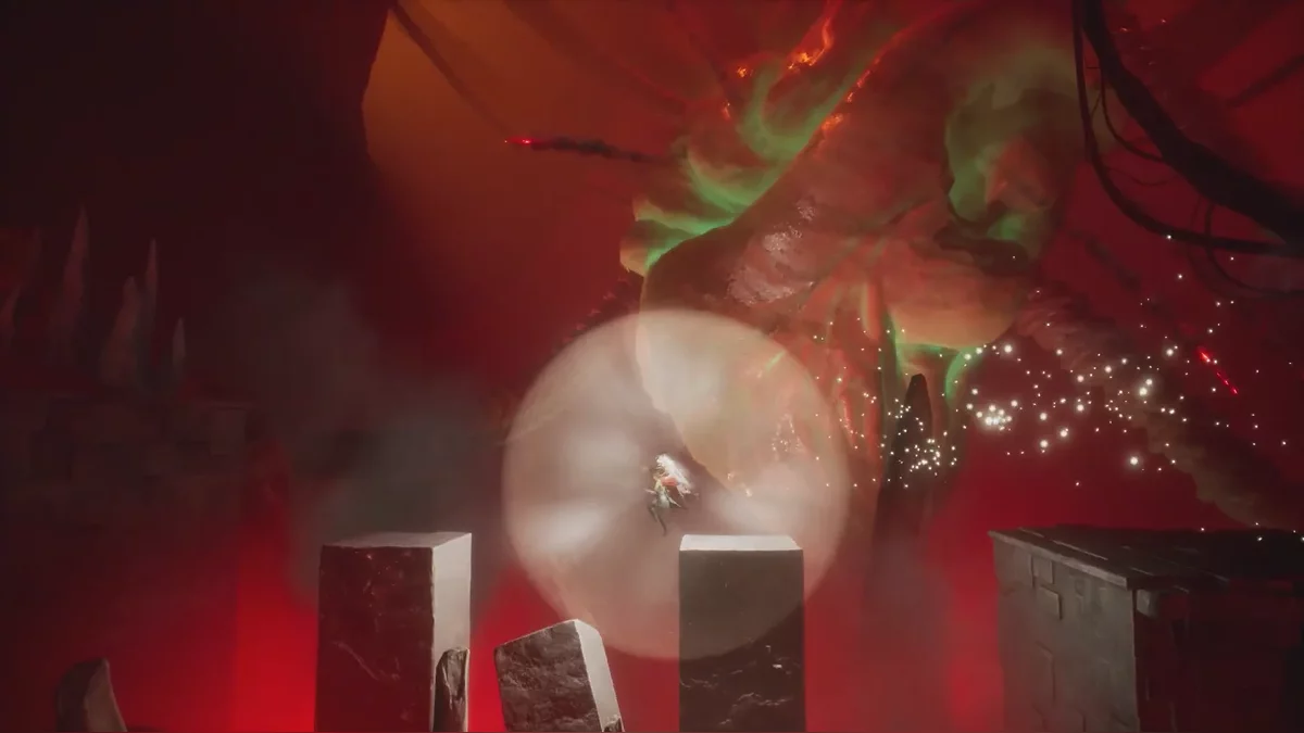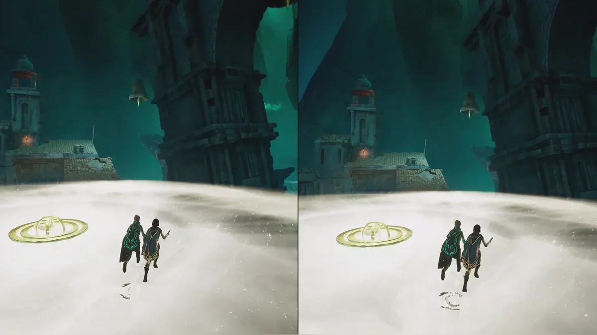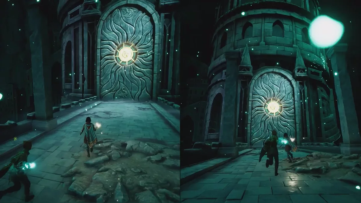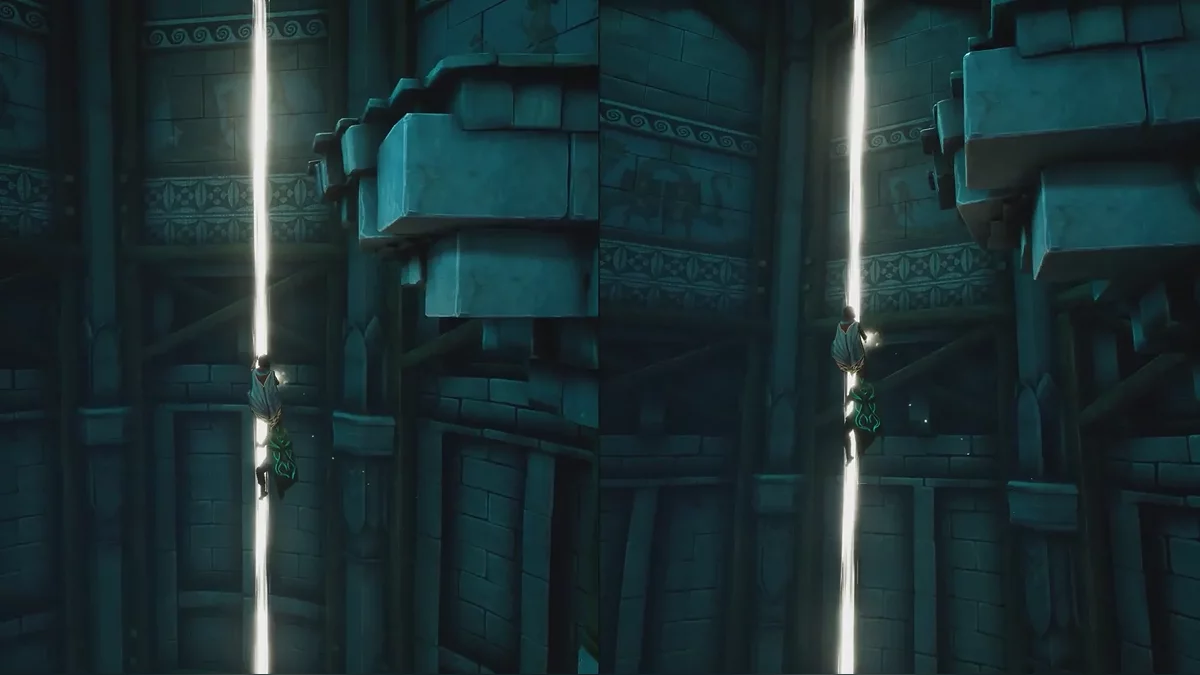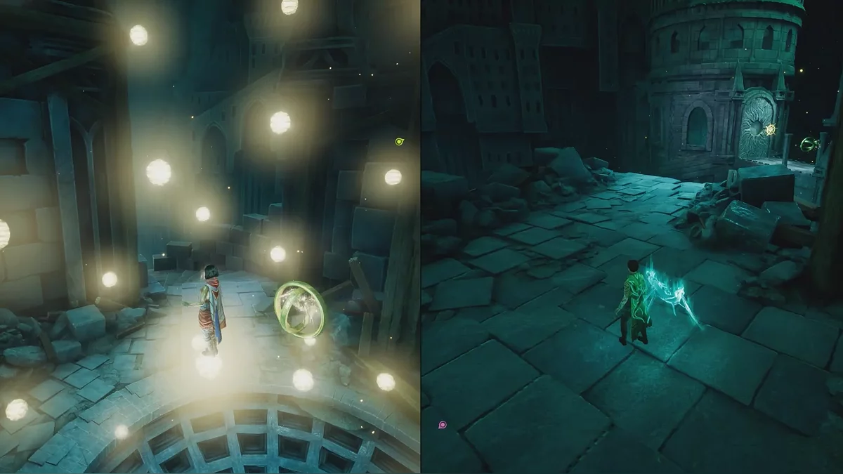 Теперь начинается самое интересное. Если использовать способность Мио на сфере в центре разрушенной башни, появятся небольшие светящиеся точки, по которым можно перемещаться. Задача — найти правильную траекторию наверх, так как часть путей окажется тупиковыми. После подъёма останется добраться до каменных ворот и активировать их.