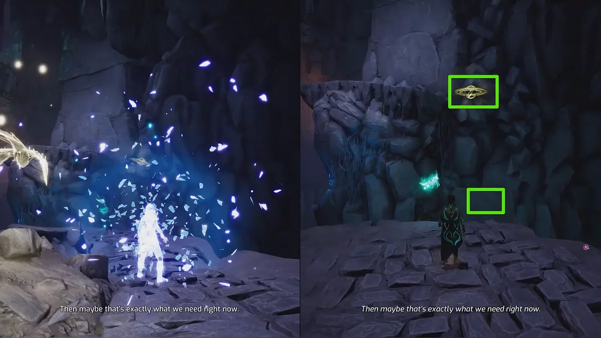 Спускайтесь по единственной тропе вниз, пока не запустится катсцена. В этот момент Зои получает способность создавать небольшие сферы на отмеченных платформах и притягивать их к себе. Попробуйте применить навык сразу — как показано на скриншоте. Затем отправьте духа на противоположный край и снова передвиньте платформу.