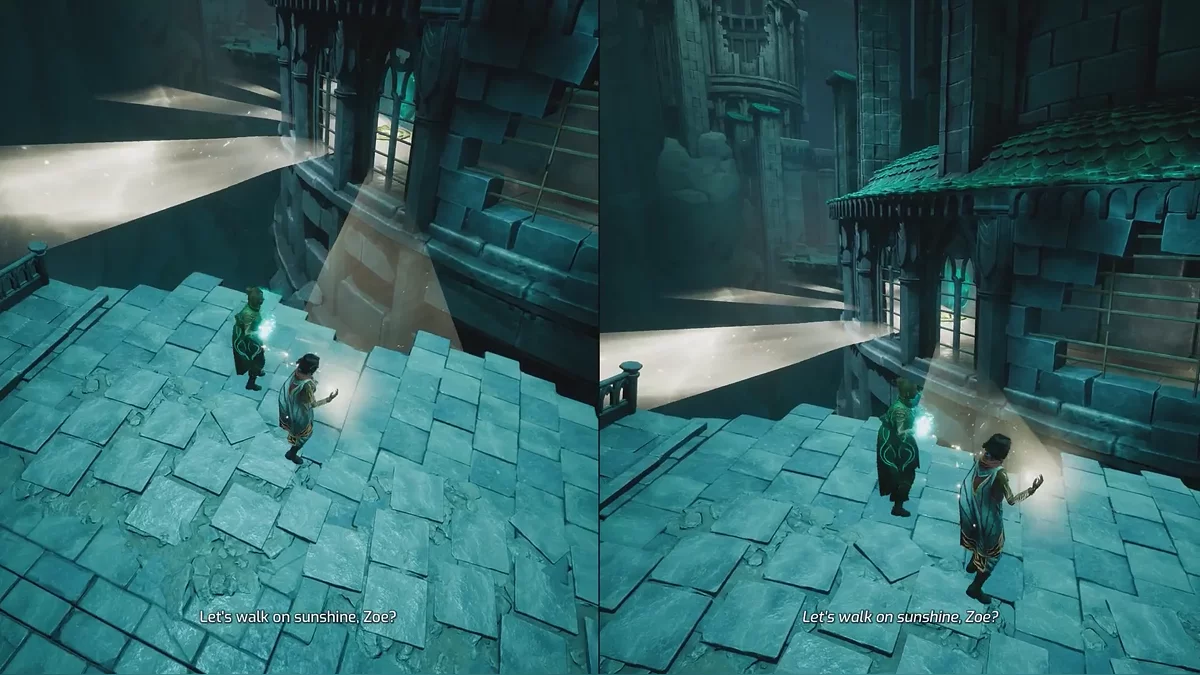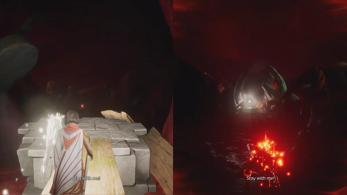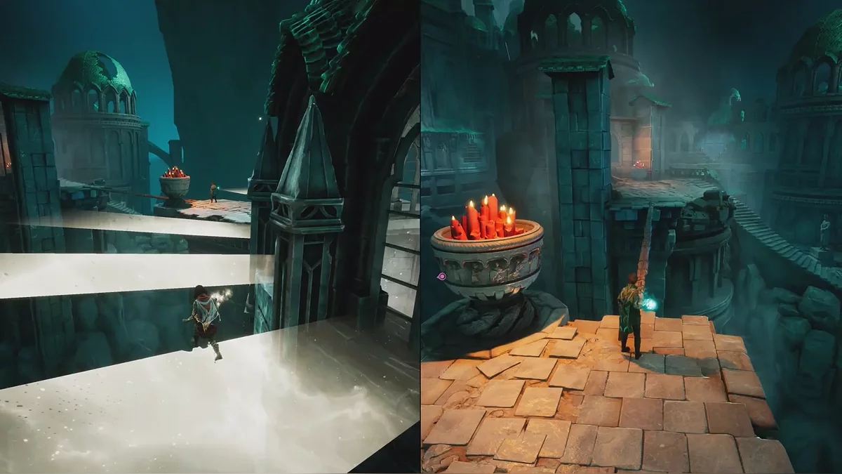 В конечном итоге герои окажутся в воде. Чтобы двигать платформу, игрок за Зои должен использовать свою способность и притягивать подсвечник к стенам.