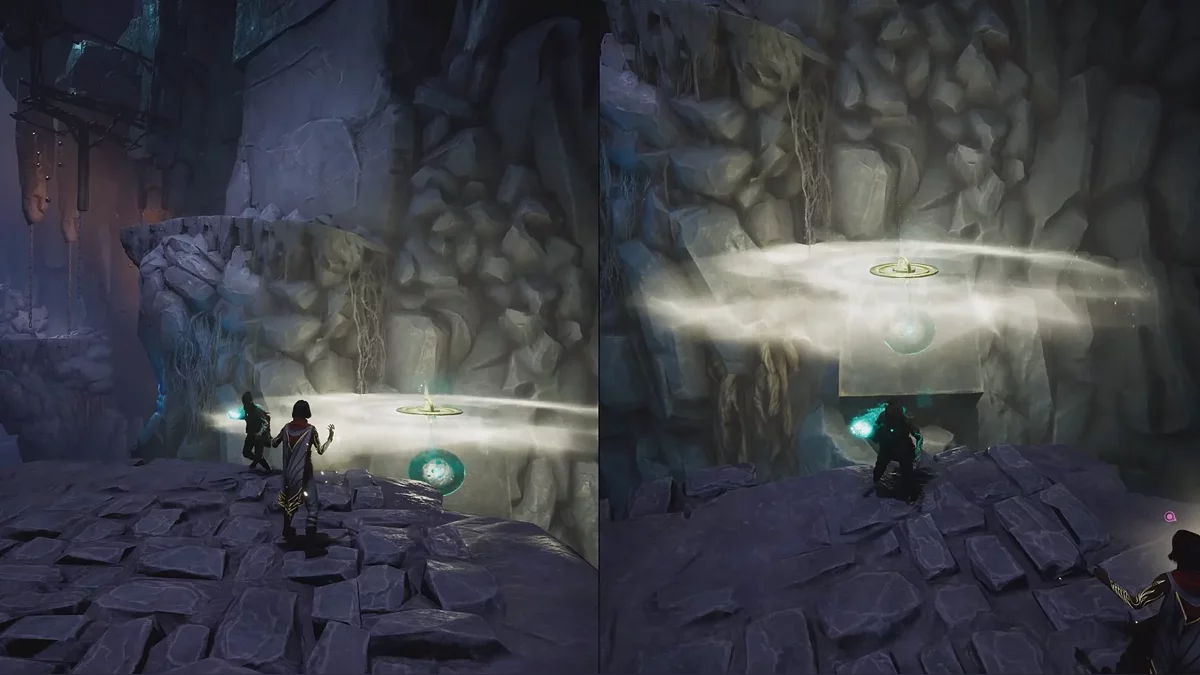 В большой штольне расположено несколько сфер. Сначала активируйте левую, чтобы Зои смогла пройти вперёд. Затем направьте свет на вторую сферу и удерживайте её, пока Мио не доберётся до цепи. Поднявшись на неё, он откроет путь напарнику.