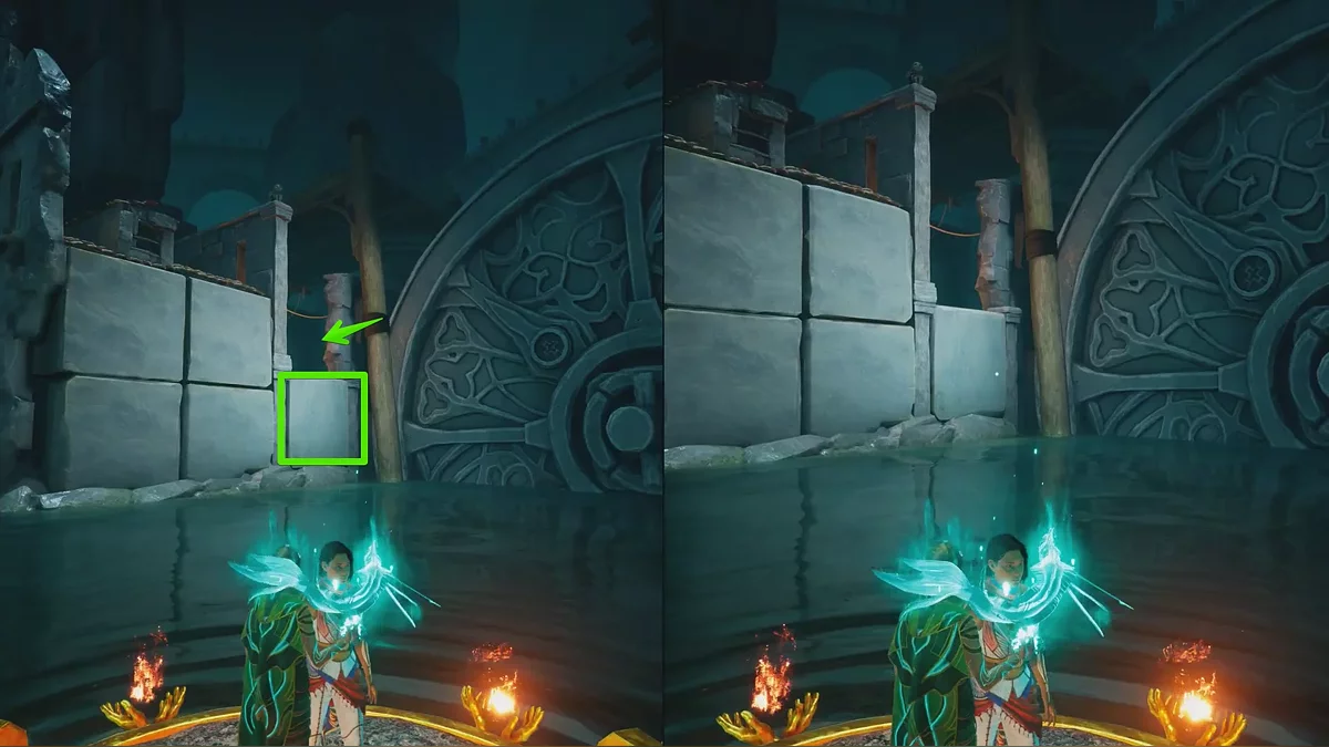 Используйте вращающиеся статуи и доберитесь до огромного колеса. С левой стороны от него есть платформа, на которую нужно забраться, чтобы открыть проход через крышу одного из затопленных домов.