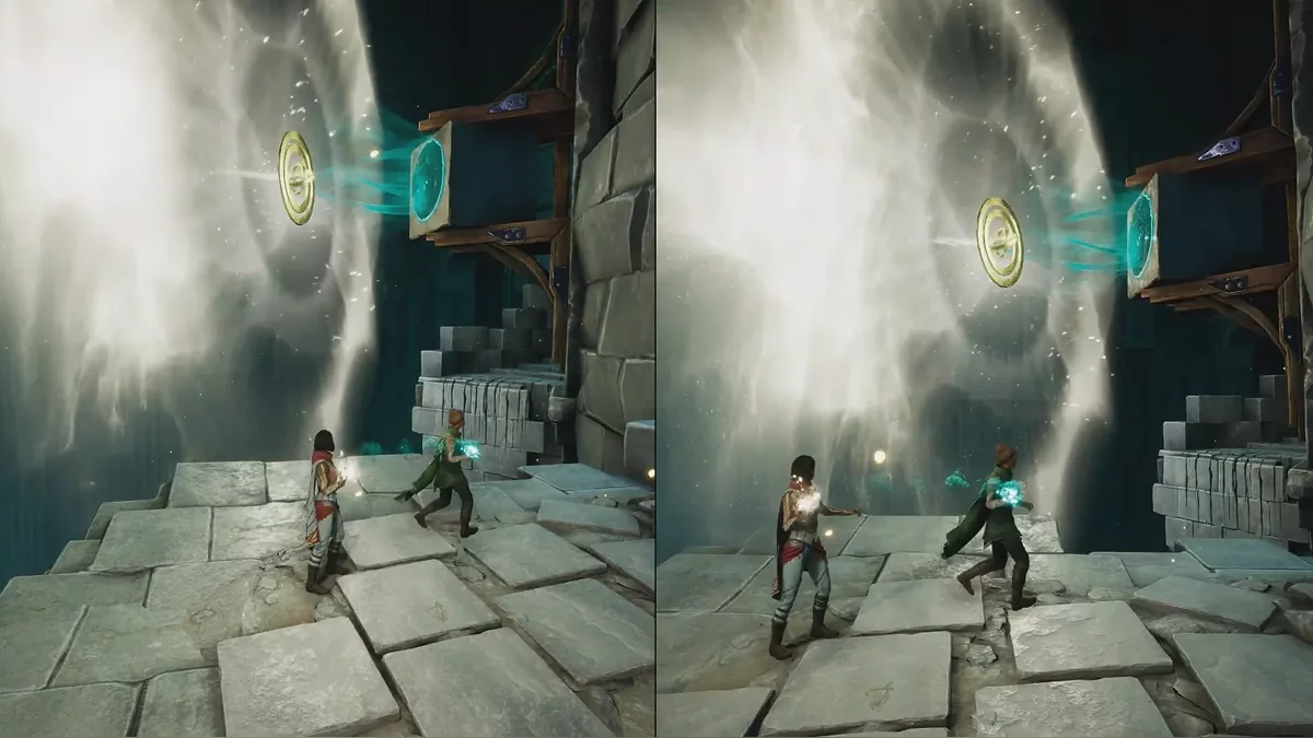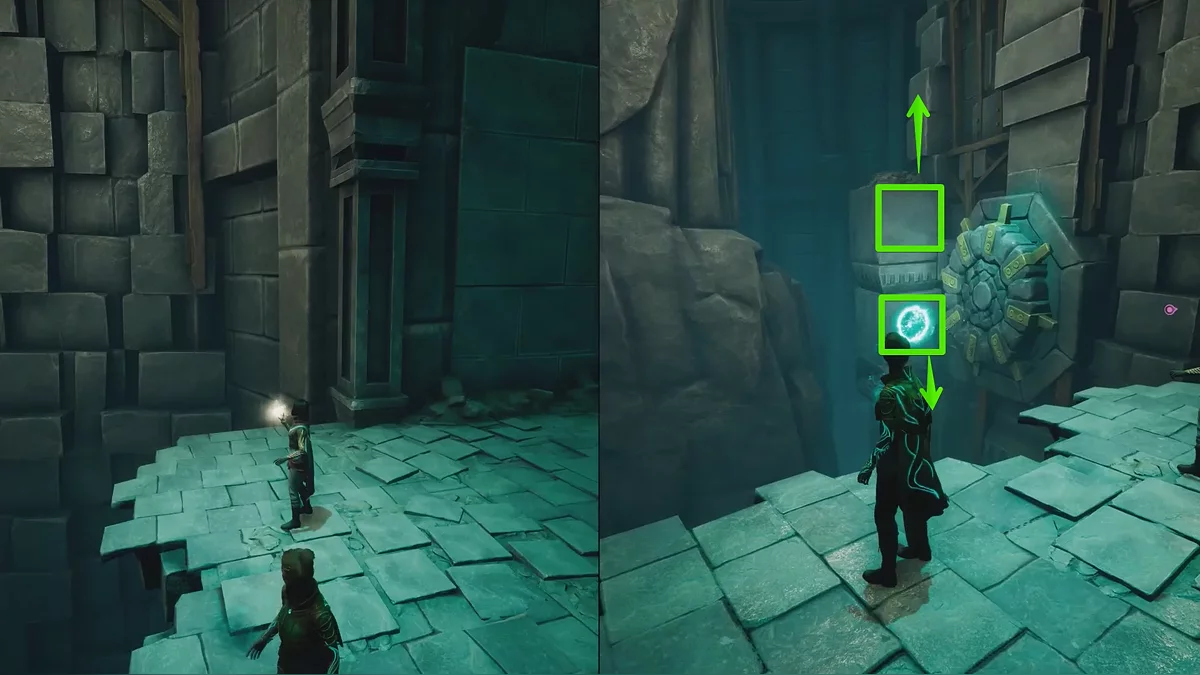 Следуйте далее. Справа на стене есть каменное колесо, с помощью которого можно менять положение золотой сферы для Мио. Если направить способность Зои ниже, сфера опустится; если выше — поднимется.