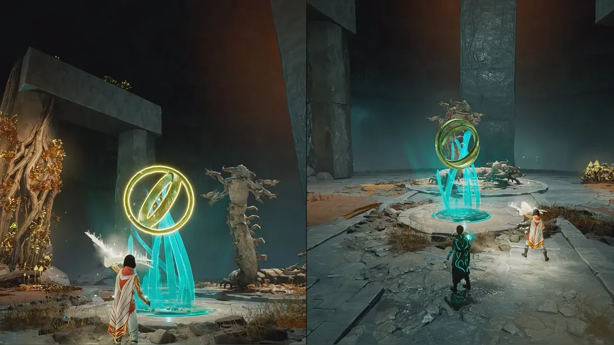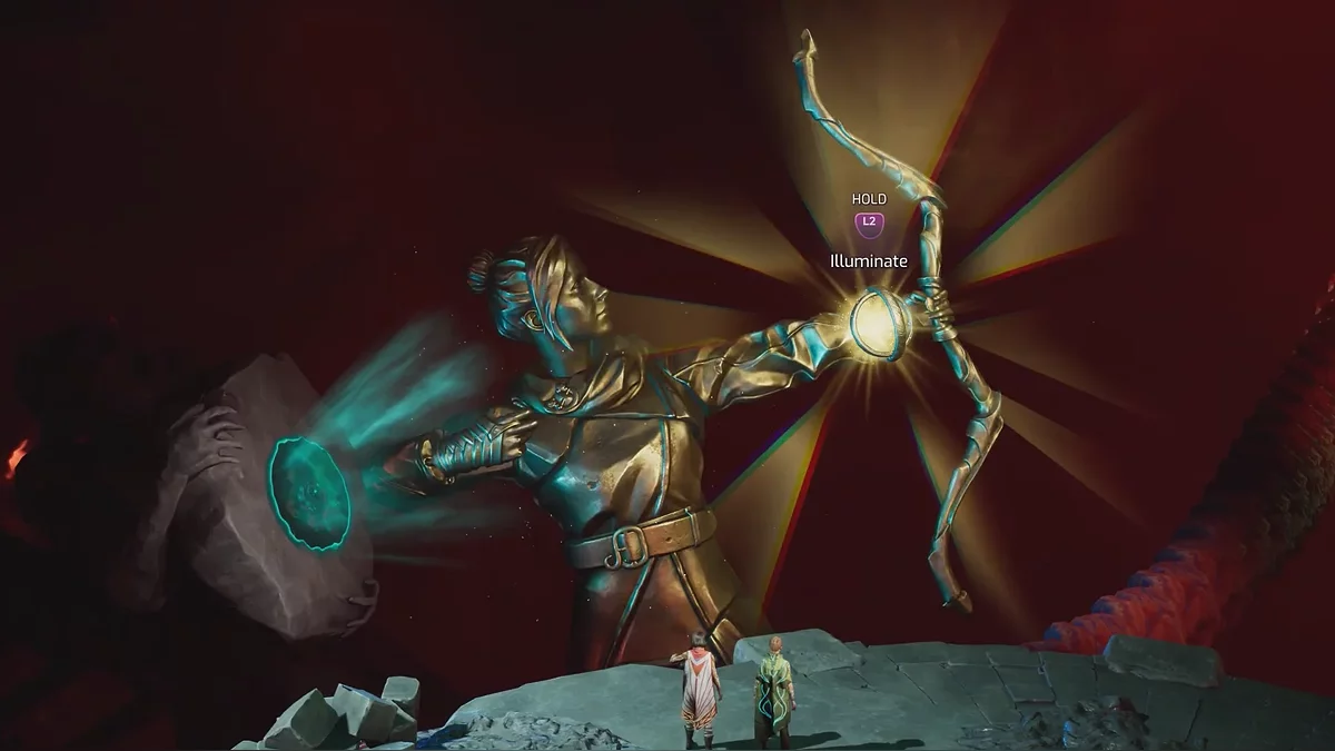Далее начинается небольшой платформерный сегмент. Поднимайтесь по длинной цепи на верхние уровни разрушенной башни и справа у обрыва увидите золотую сферу. Если активировать её в стандартном положении, до световых платформ вы не достанете. Напарник должен передвигать сферу с помощью своей способности. Учтите, что платформы будут двигаться вместе с ней, поэтому придётся действовать быстро.
