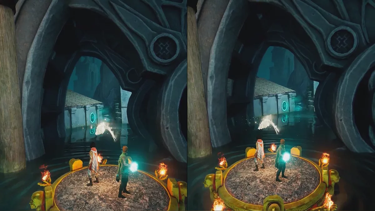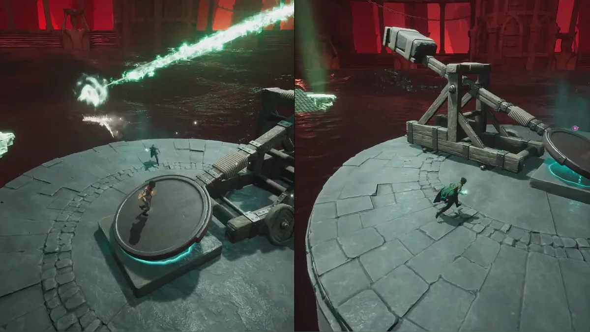Избавившись от всех врагов, откройте ворота и проходите вперёд. Справа можно увидеть статую ящерицы — потяните за неё, чтобы разблокировать струю воды. Один игрок взаимодействует со струёй, а второй начинает поливать магму перед собой. Повторите действие на другой стороне и поднимайтесь на стену.