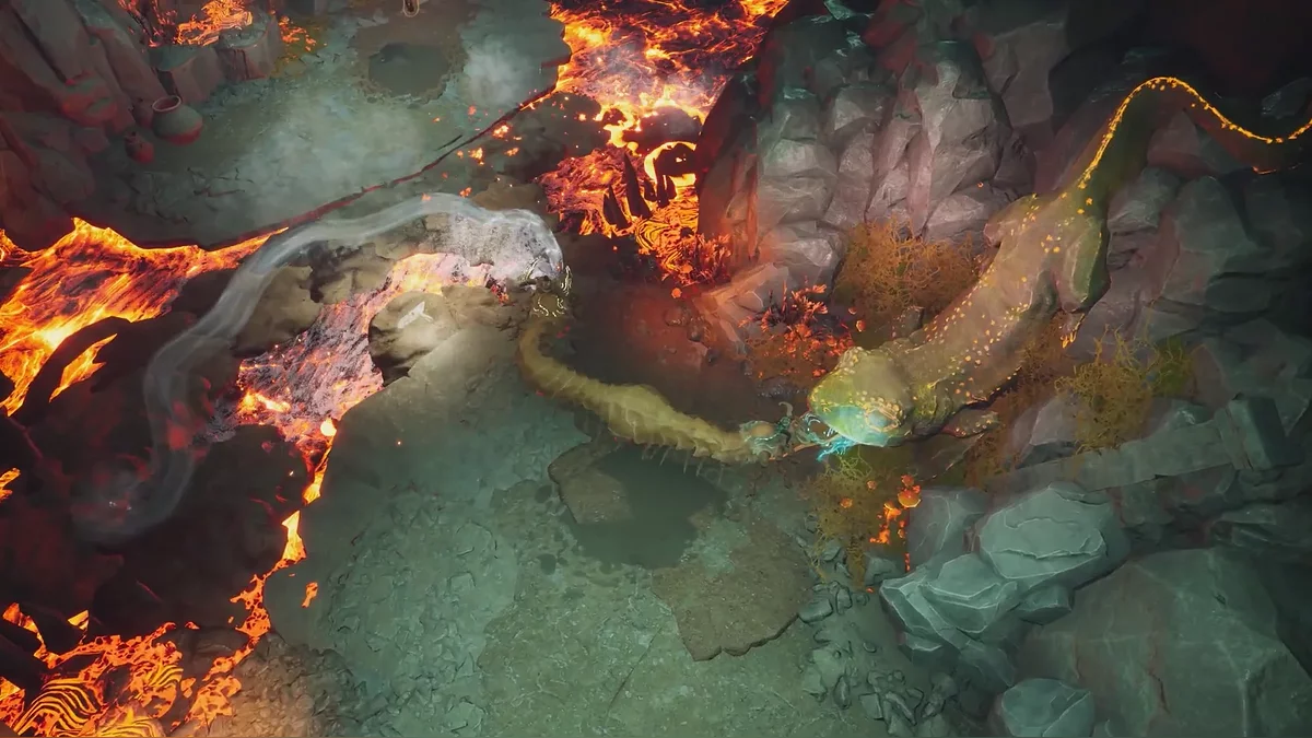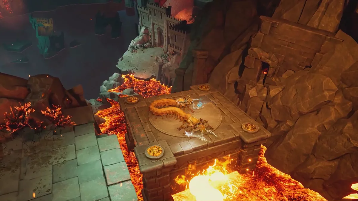 В следующем сегменте начнутся более интересные препятствия. Игрокам необходимо синхронно преодолеть склон, по которому стекает магма, продвигаясь выше.