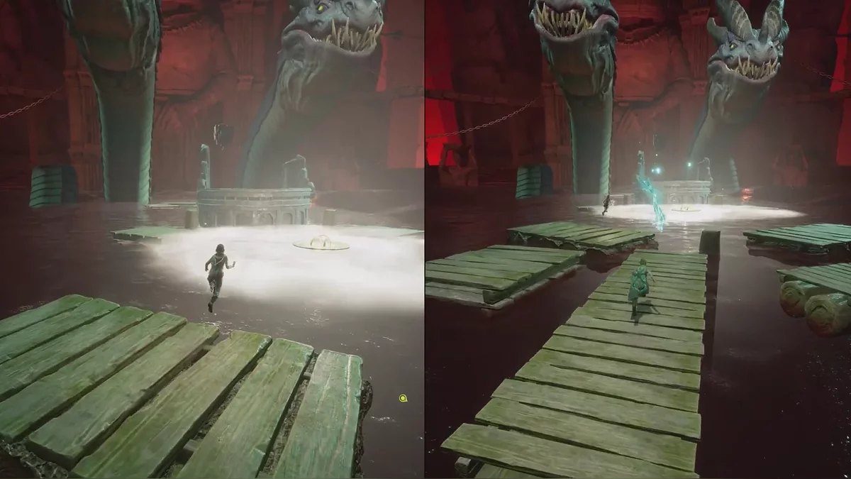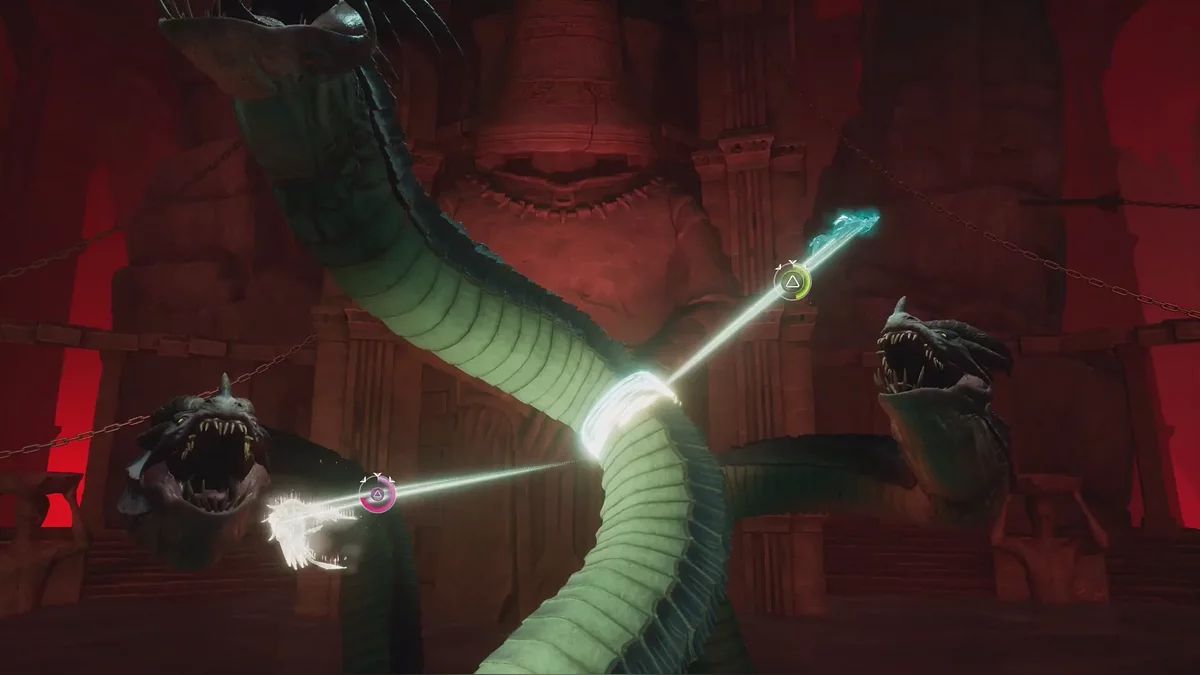 В начале этого сегмента вам нужно лишь уворачиваться от атак босса и двигаться в одном из направлений — мы выбрали путь влево. Когда два игрока объединятся, они смогут соединить кулоны и отрезать одну из голов гидры. Повторите действия со второй головой, чтобы завершить сегмент с 2D-платформером.