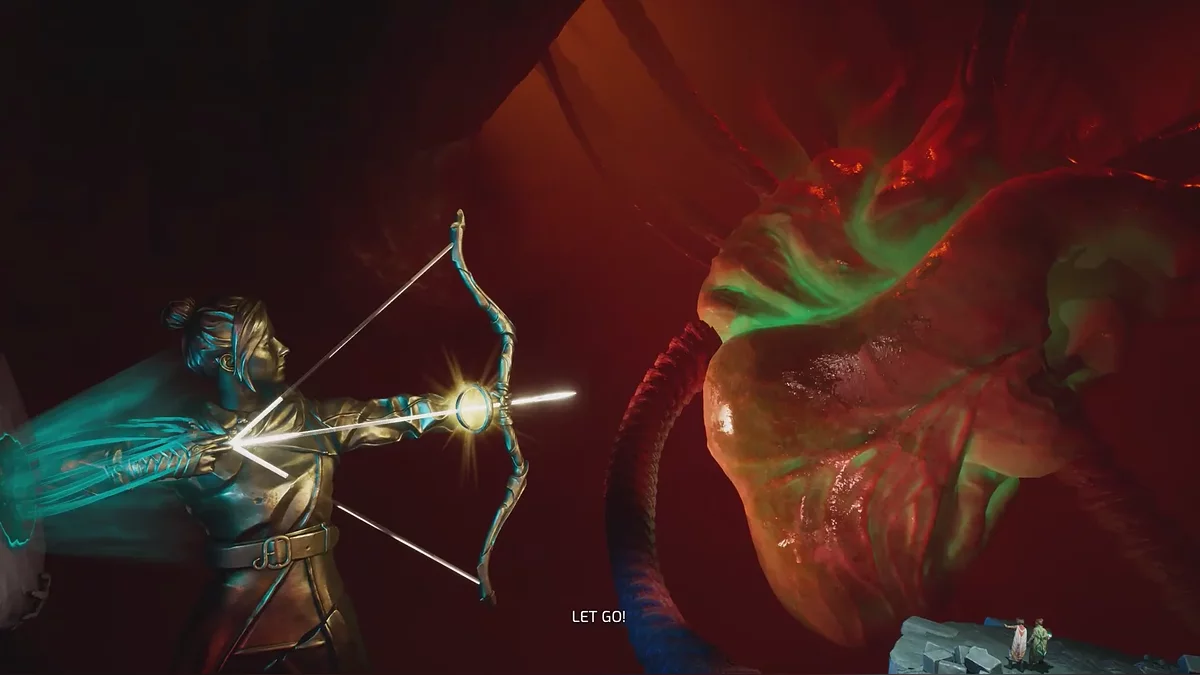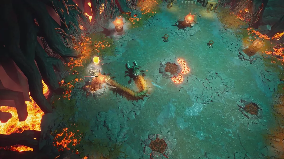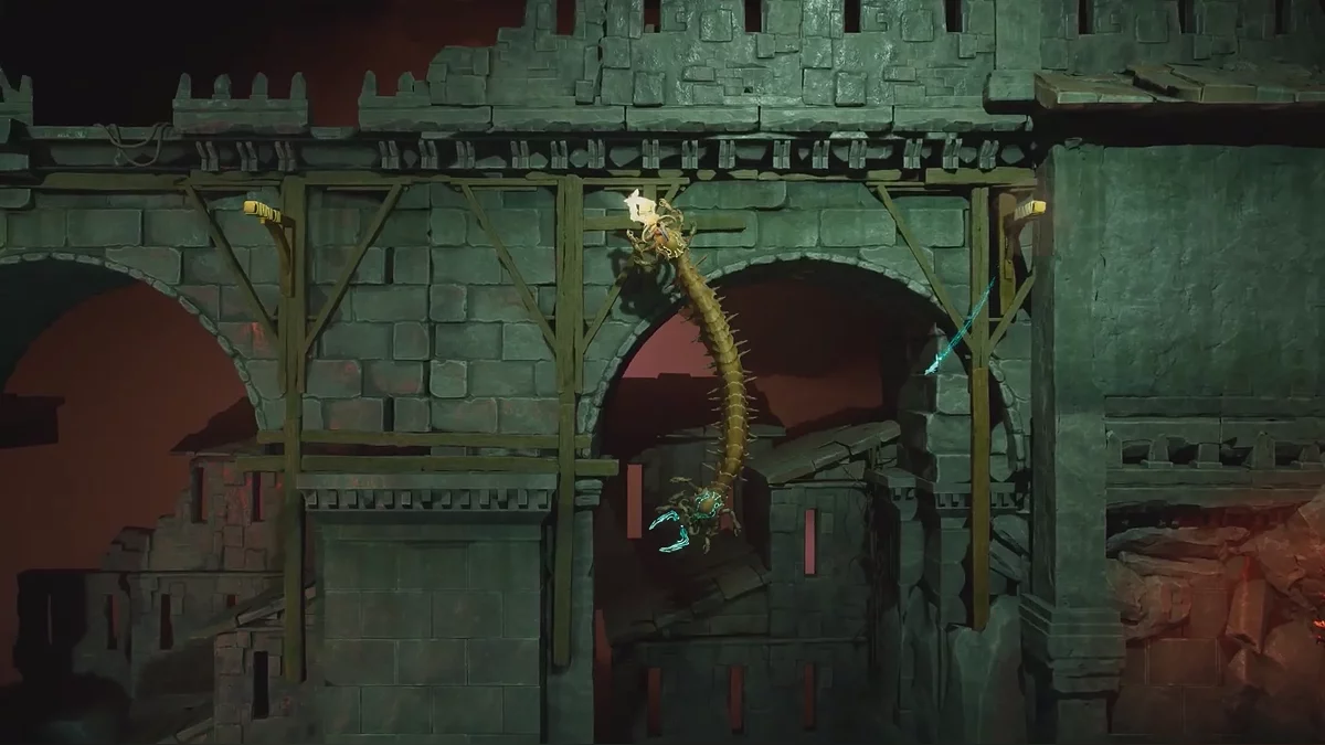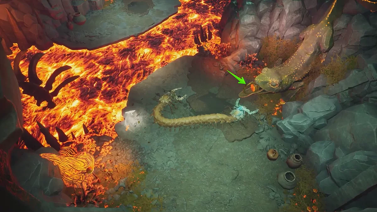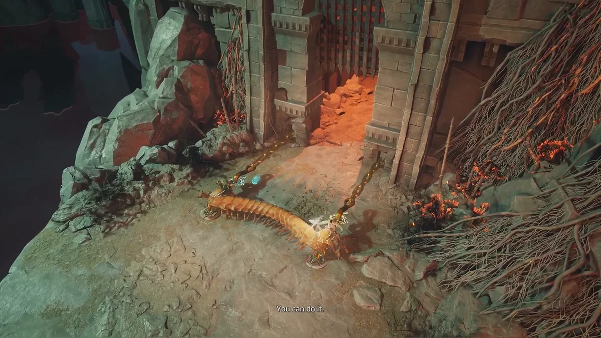 Оказавшись на импровизированной арене, схватитесь за крюки цепей от ворот — в этот момент начнут появляться черви и атаковать расплавленной магмой. Рекомендуем отпустить цепи и сперва разобраться с угрозой. Благо противники здесь не бесконечные.