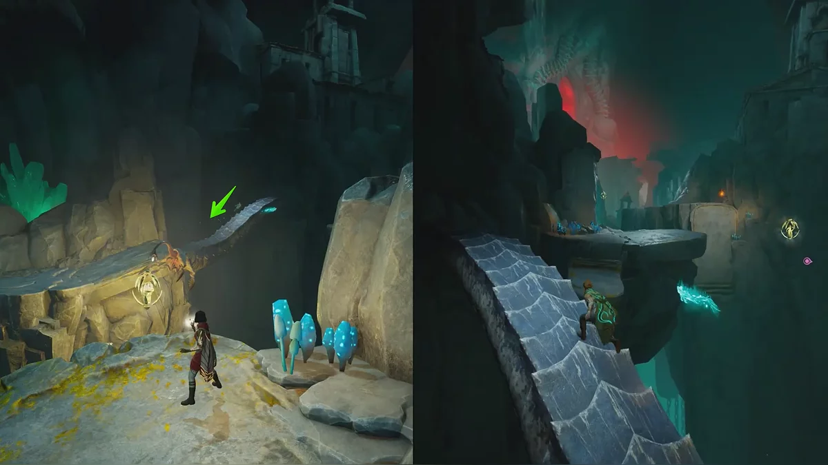 Добравшись до обрыва, поднимайтесь на большой подсвечник. Зои должна притянуть его к стене справа, чтобы создать раскачивание. Используйте двойной прыжок и рывок, чтобы перебраться на другую сторону.