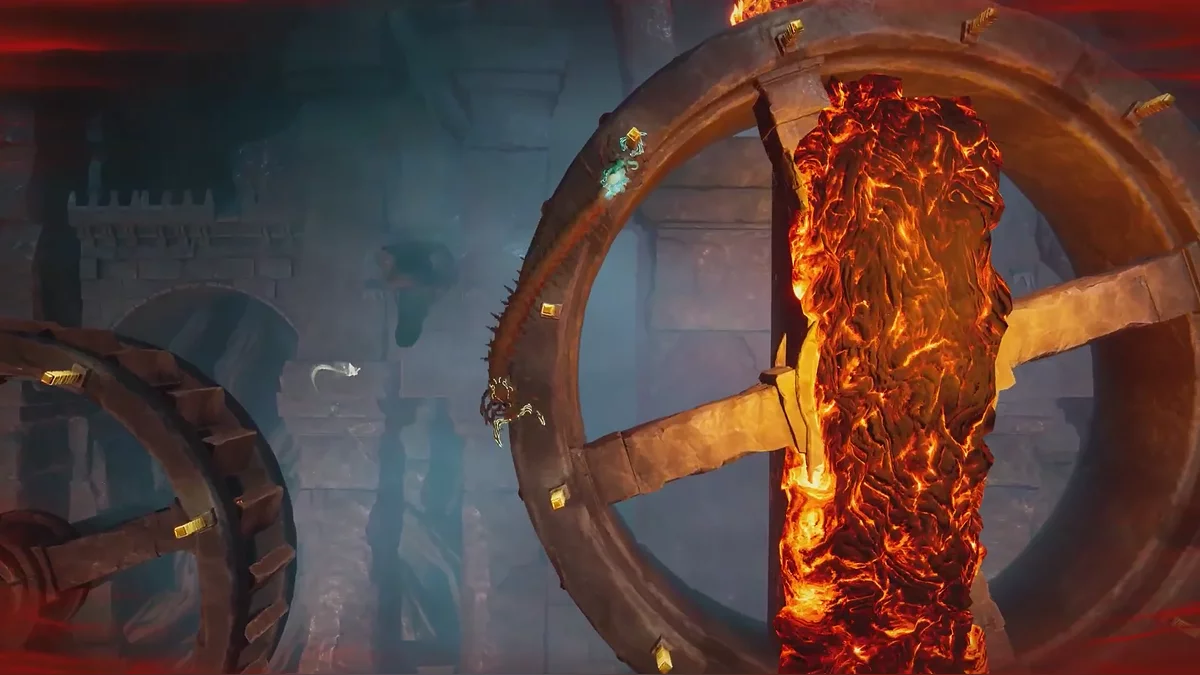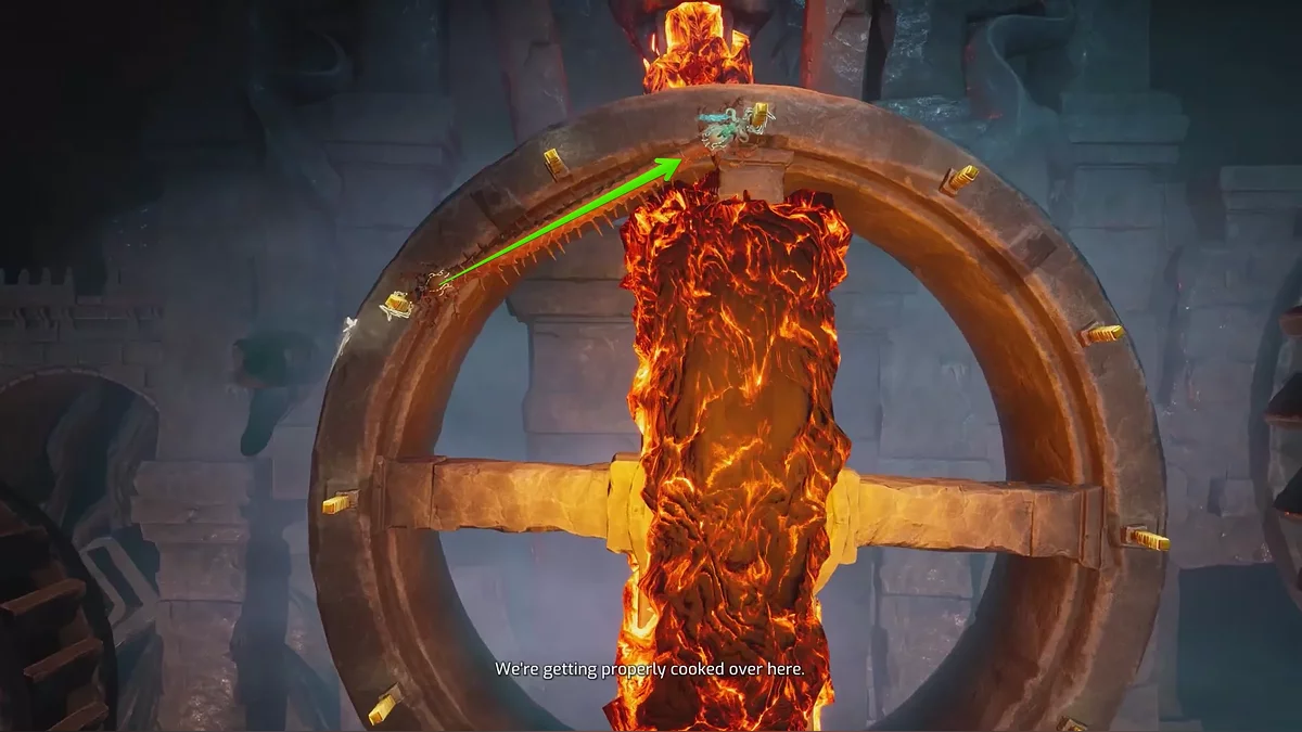Справа вы увидите вращающиеся деревянные колёса с балками, за которые нужно цепляться. Сложность в том, что над или под каждым из колёс расположен источник огня. Первые два преодолеть будет несложно, а вот с третьим могут возникнуть трудности. Зацепитесь за балки через одну и держитесь, пока не окажетесь на противоположной стороне.