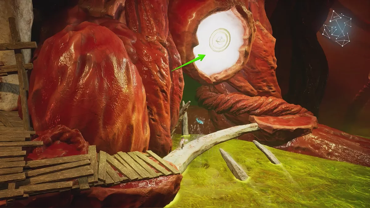 По центру локации будет ядовитая слизь — избегайте её. Забирайтесь на плавающую платформу и притяните её влево. Потом двигайтесь по левой стороне и активируйте свет на золотой сфере.