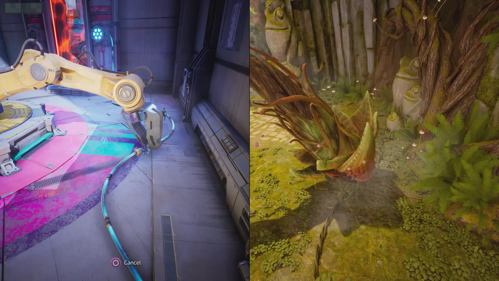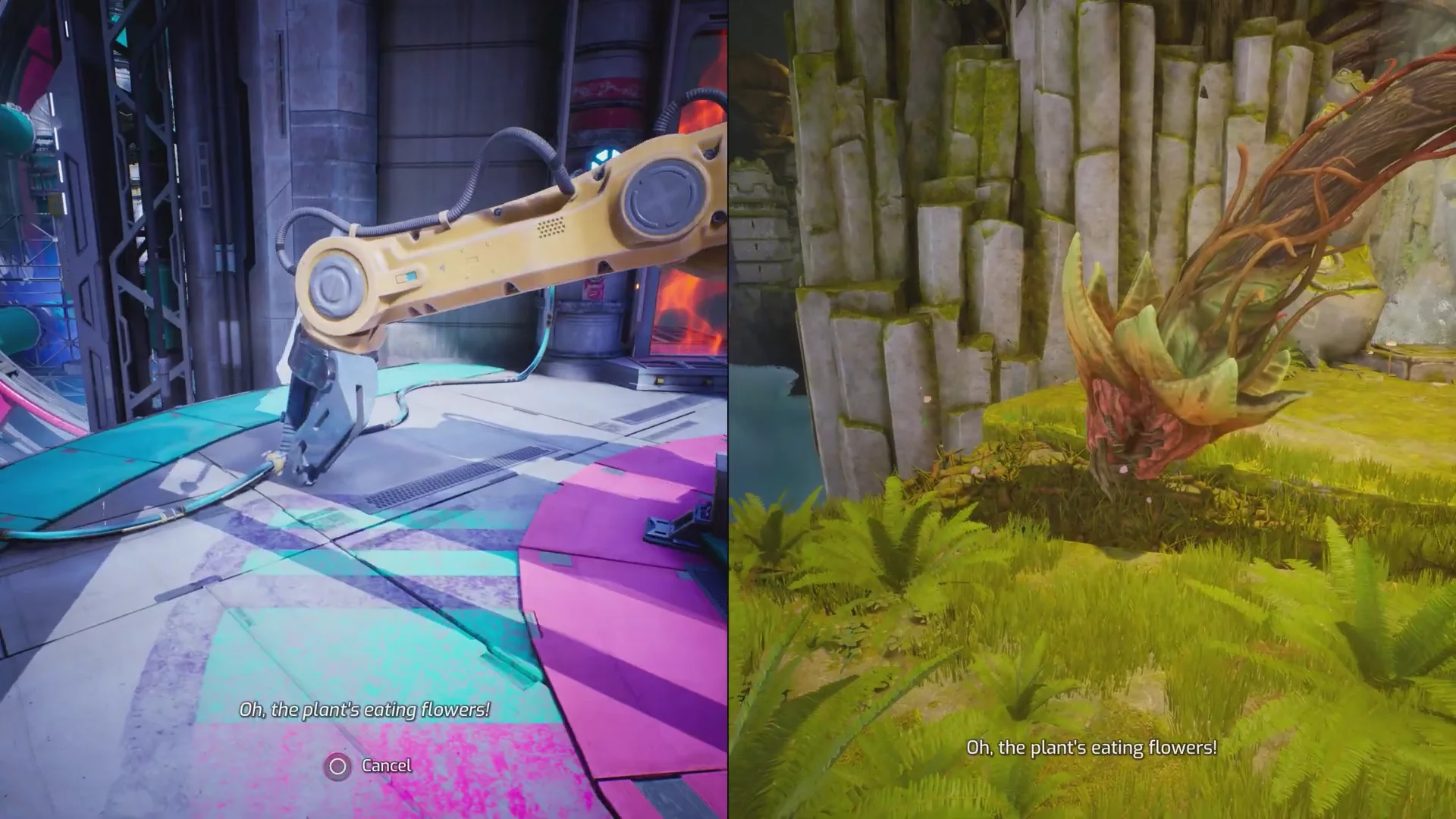 Мио управляет рукой через панель, а Зои должна стоять рядом с узлом питания. В мире Мио это крупный кабельный модуль, а у Зои — просто маленький оранжевый цветок. Мио атакует узел рукой/растением — узел взрывается, открывая путь вперёд.
