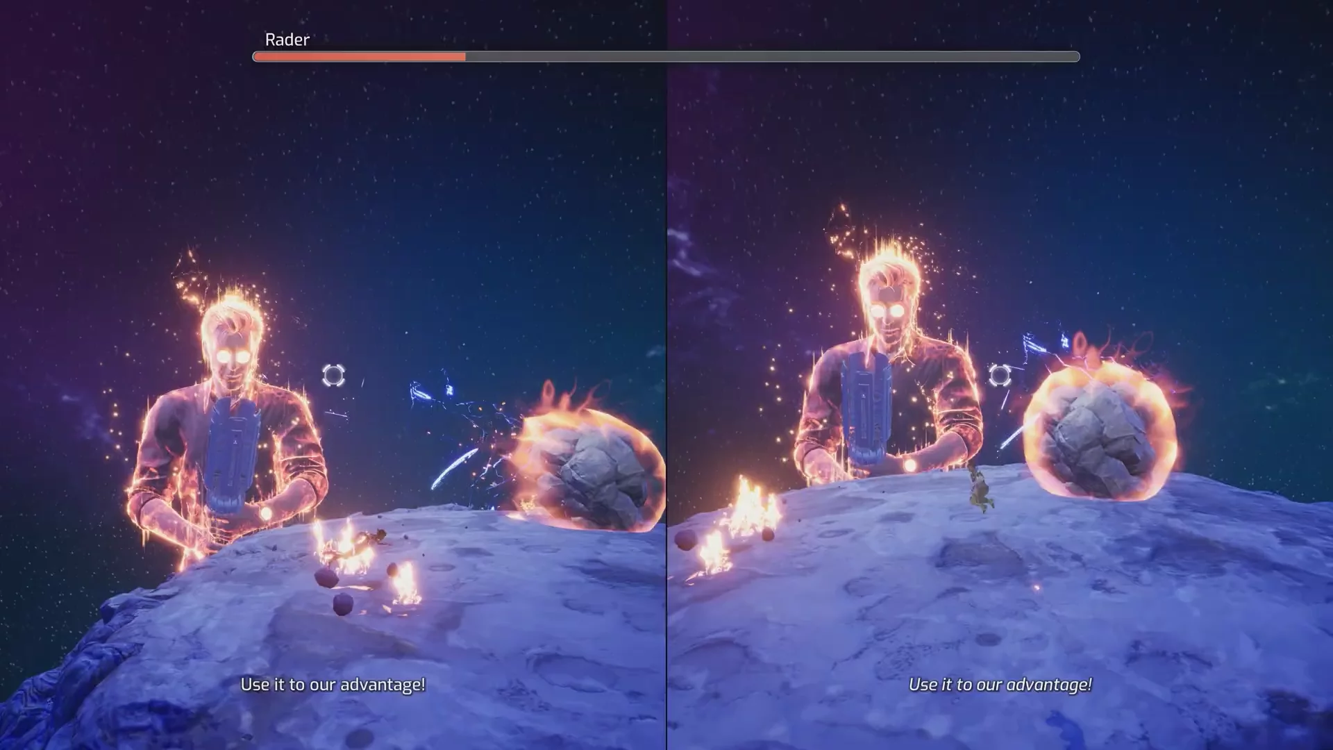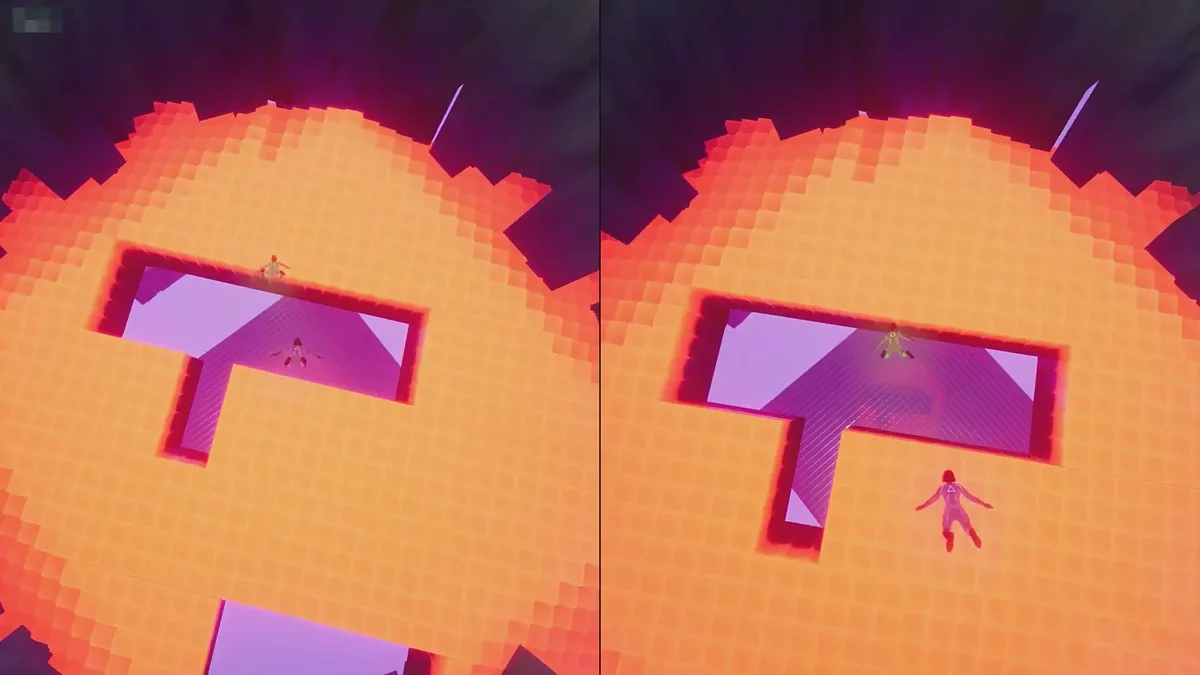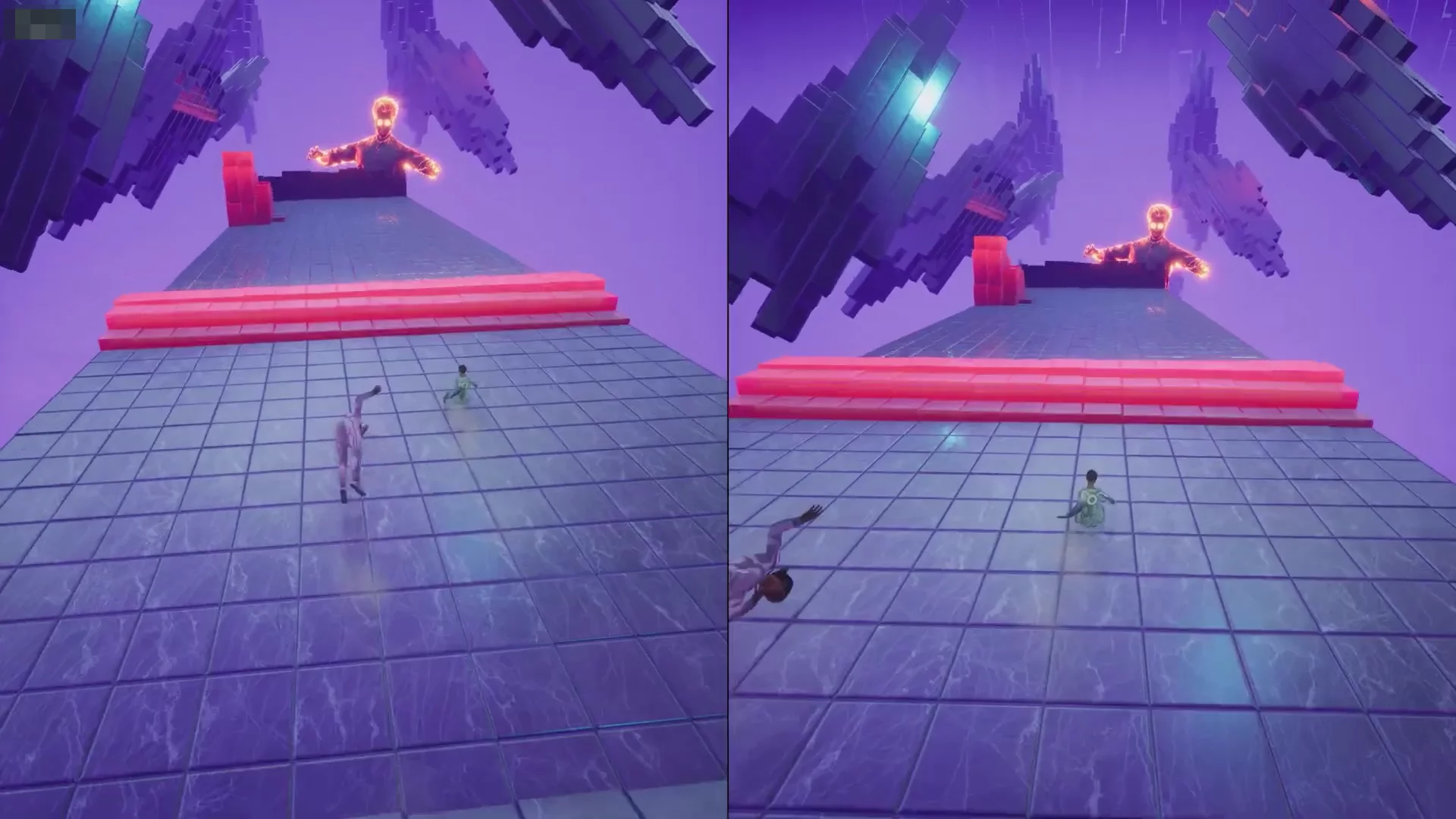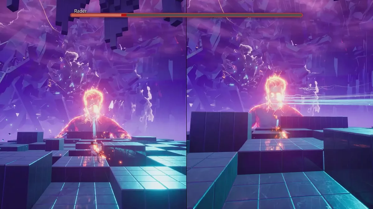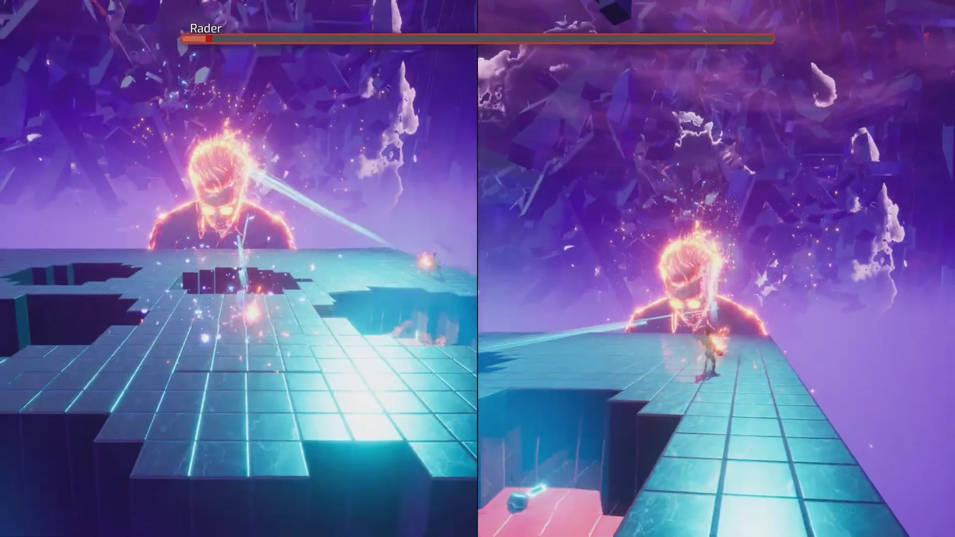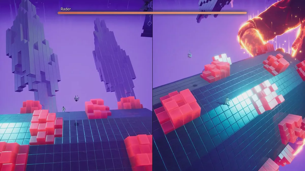 Дальше начинается настоящее безумие: на вас накатывают ударные волны, одна за другой, и среди всего этого появляются блестящие осколки с подсказками кнопок. Это — фрагменты глитча, ваш единственный способ нанести Рейдеру урон. Собирайте их вдвоём, маневрируя между волнами.