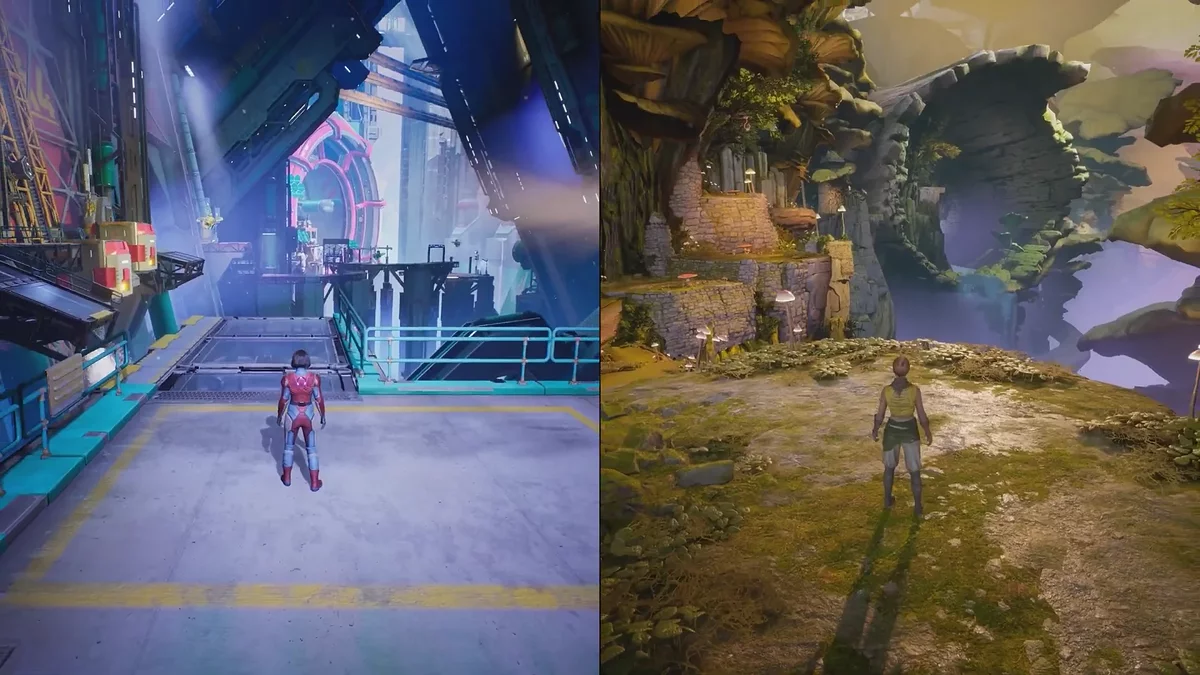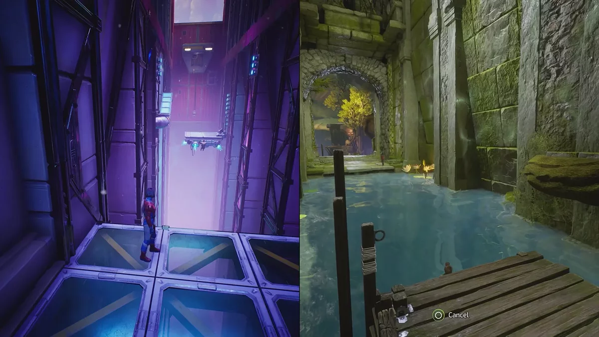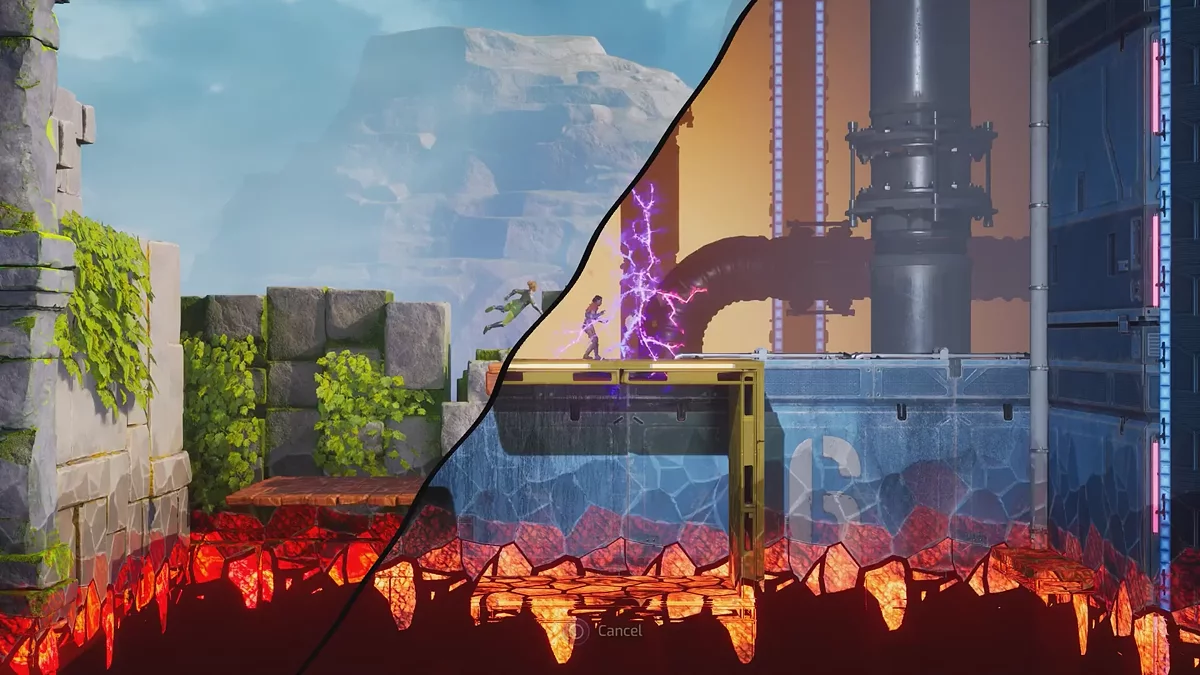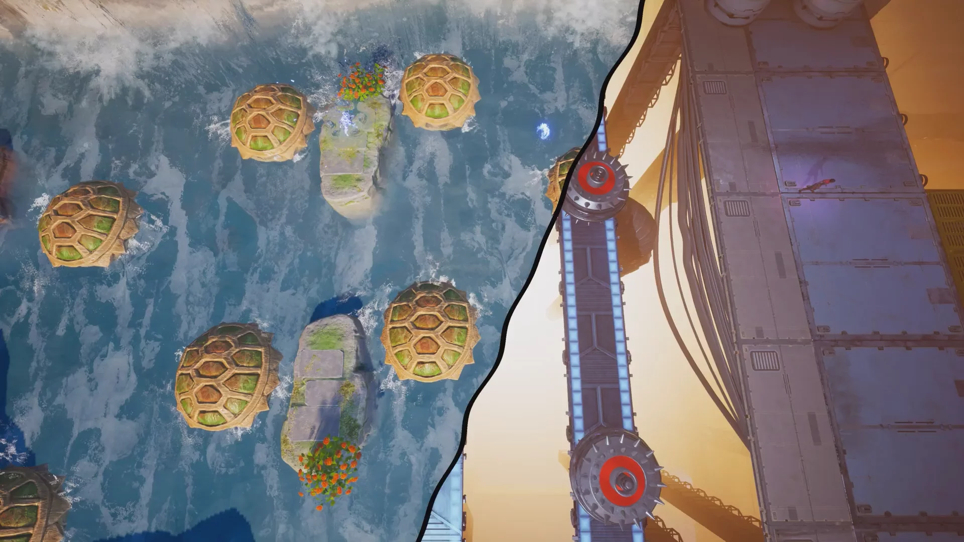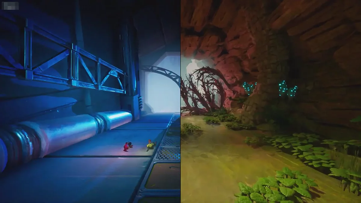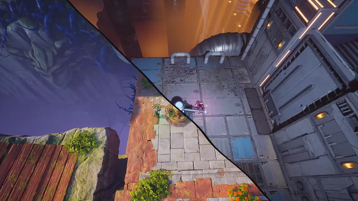 Пройдя через массивные двойные двери, сделайте короткую передышку — дальше механика начинает меняться. Экран по-прежнему разделён надвое, но теперь Мио и Зои могут свободно пересекать центральную линию и буквально «перешагивать» между мирами. Попробуйте сразу: перейдите к Зои и уклонитесь от группы лазеров, используя новую возможность перемещаться между реальностями.