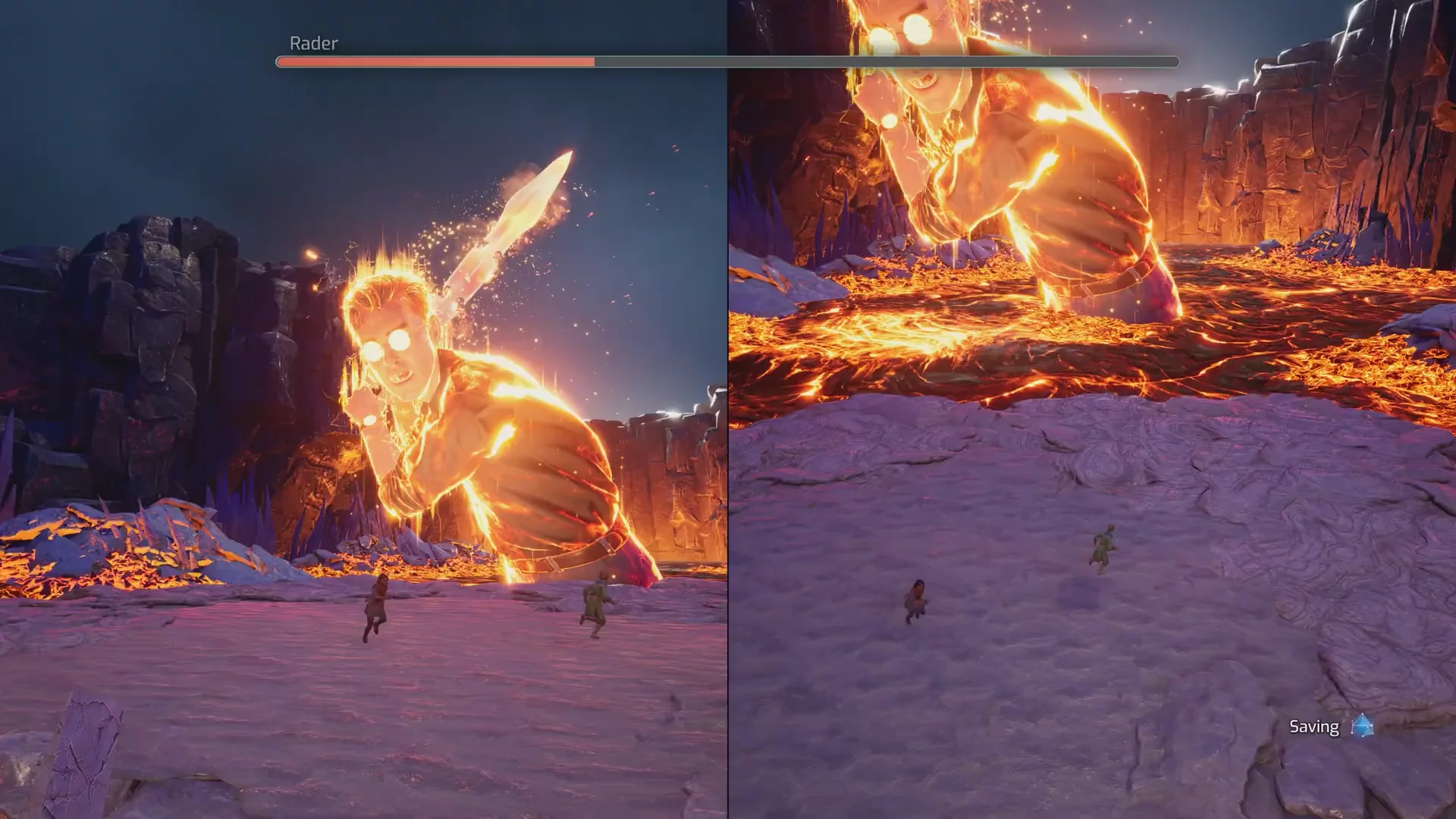 Оказавшись внутри вулкана, вы увидите, что Рейдер обзавёлся новым оружием — гигантским огненным мечом, которым он абсолютно не стесняется размахивать. Первое, что он делает: наносит три широких горизонтальных удара. Просто перепрыгивайте через каждый взмах — тайминги щадящие, главное не залипать на месте.