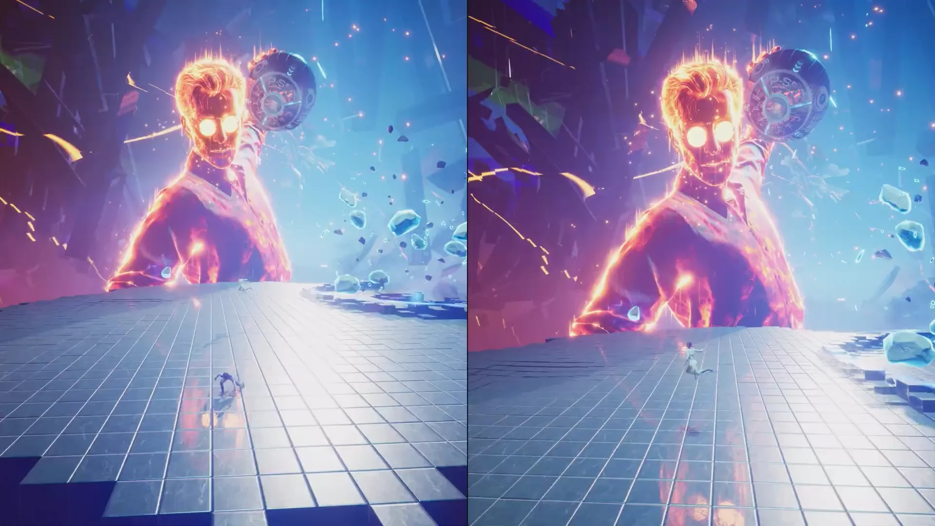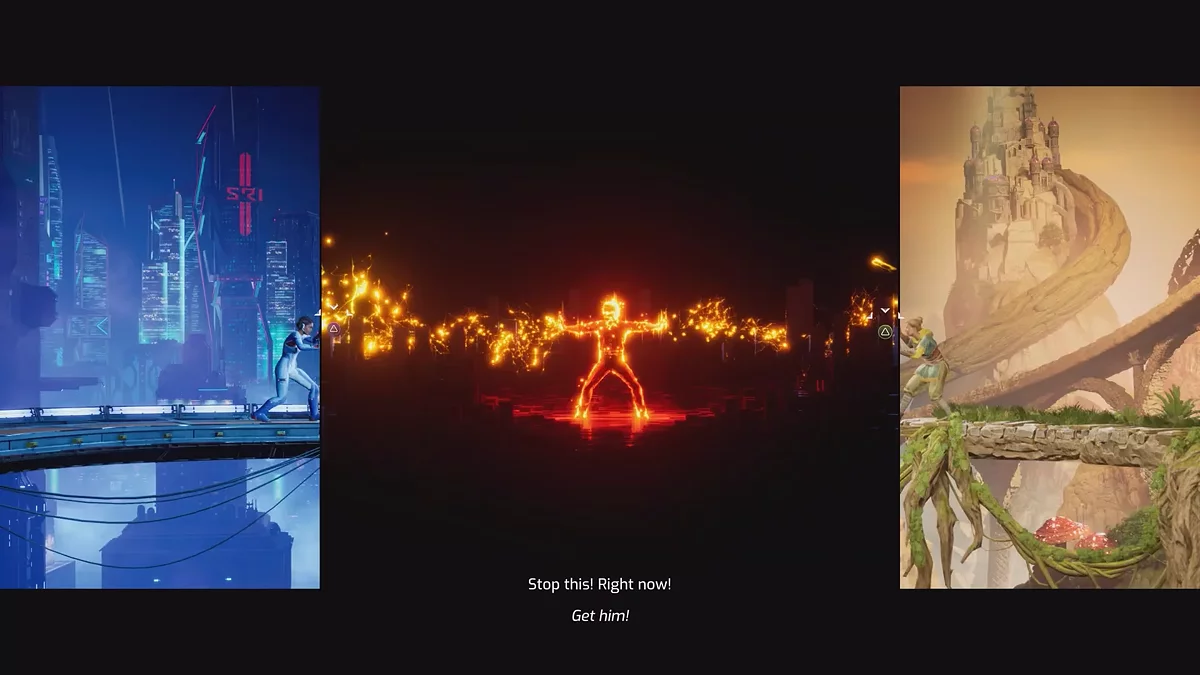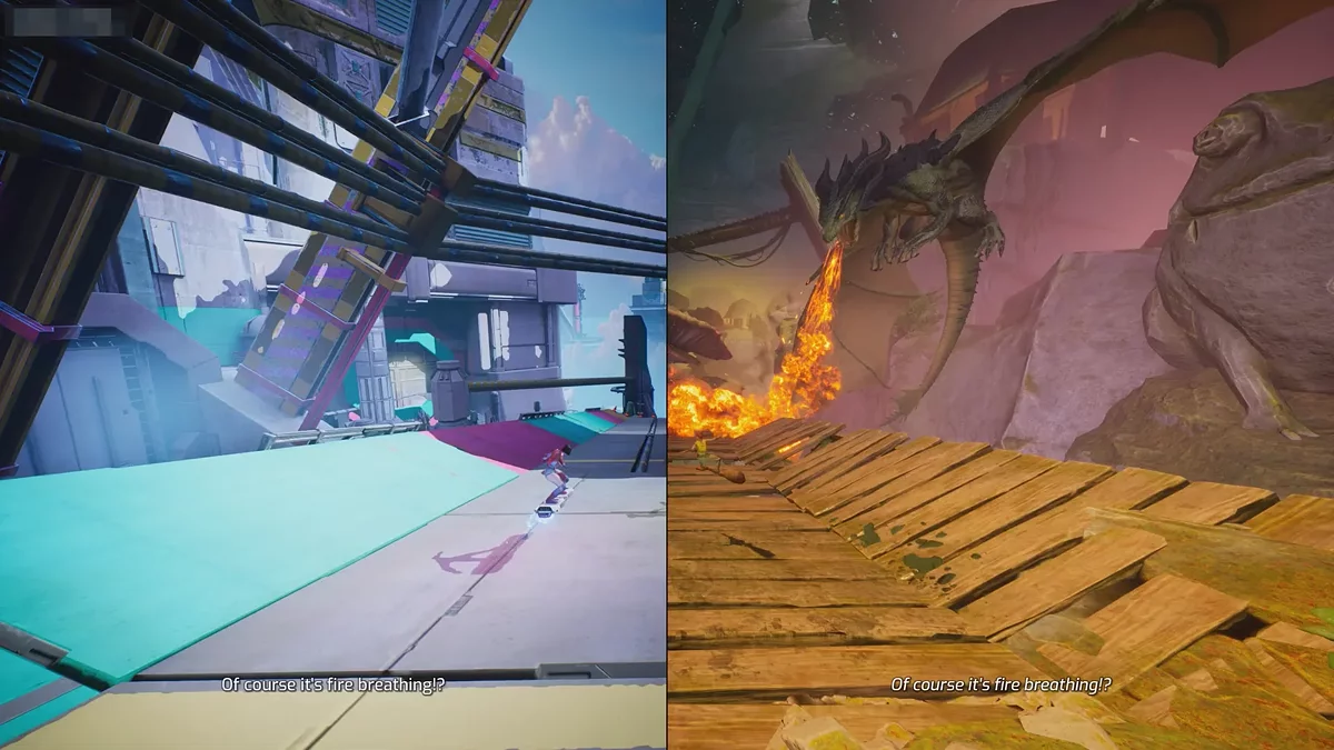 Следом начинается скоростной участок. В зависимости от мира Мио мчится на ховерборде, а Зои на метле. Здесь снова работает чередование реальностей — петляйте между мирами, чтобы обходить препятствия, уходить от струй драконьего огня и избегать провалов. После серии уклонений Рейдер появляется снова и мощным ударом отправляет вас в следующую подглаву.