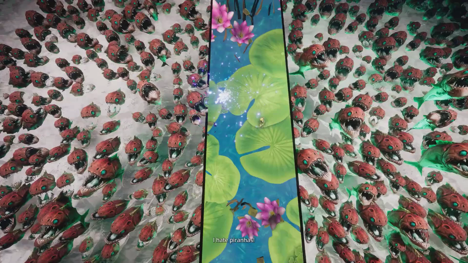 Не успеете отдышаться, как сцена резко сменится на мягкую лесную подстилку. Всё выглядит умиротворённо, но расслабляться рано — линия, разделяющая экраны, начинает вращаться против часовой стрелки, открывая новые смертельные зоны по очереди в каждом квадранте. Единственное безопасное место — верхний левый сектор, держитесь там.