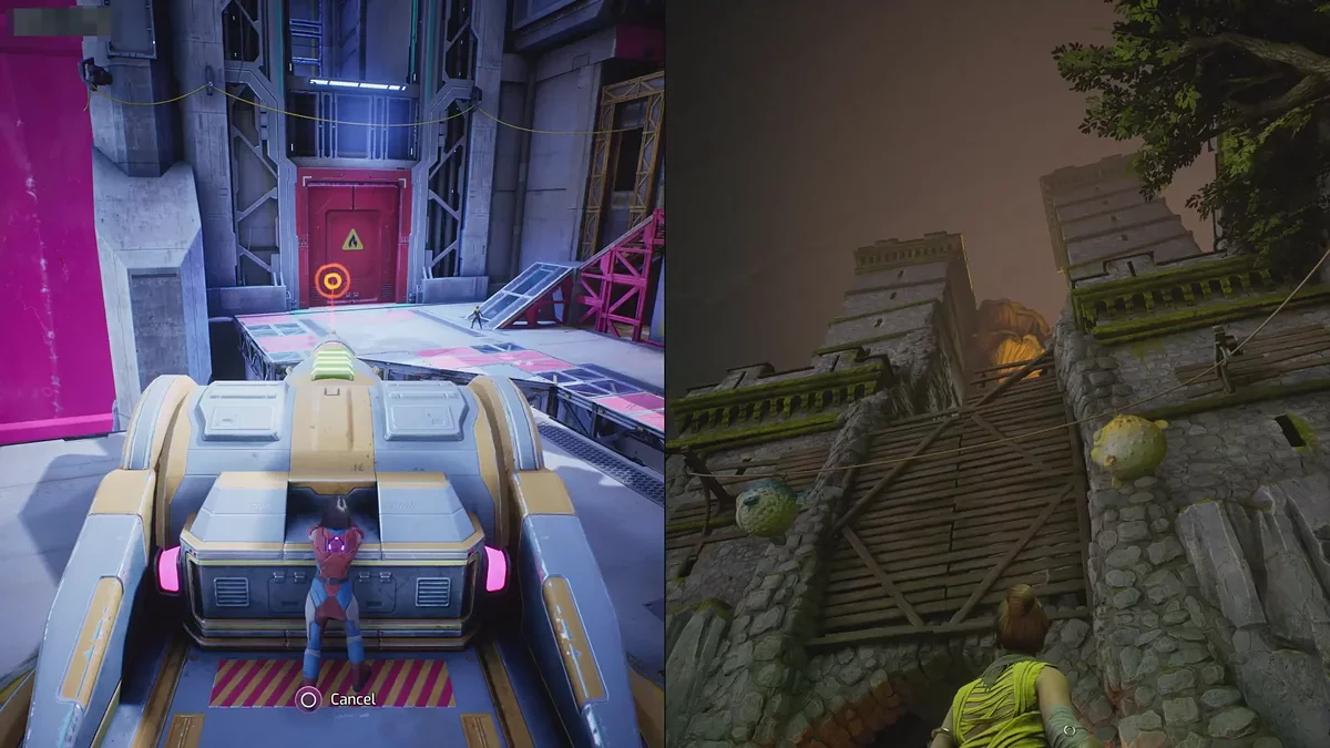Дальше у Мио появятся два розовых квадрата, соединённых кабелями. Ей нужно встать на один, а Зои — найти второй, ориентируясь по экрану Мио. Когда обе встанут на свои точки, поднимется платформа и откроет путь дальше.