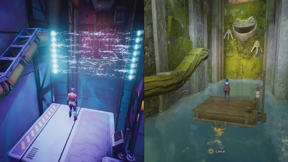 Чуть дальше Зои нажимает кнопку, открывая пасти трёх змеиных статуй. Мио в это время активирует переключатель и выпускает лазеры. В мире Зои эти лазеры выглядят как каменные столбы, которые застревают прямо в раскрытых пастях. Зои остаётся лишь перепрыгнуть через оранжевые концы этих столбов, и путь дальше открыт для обеих героинь.