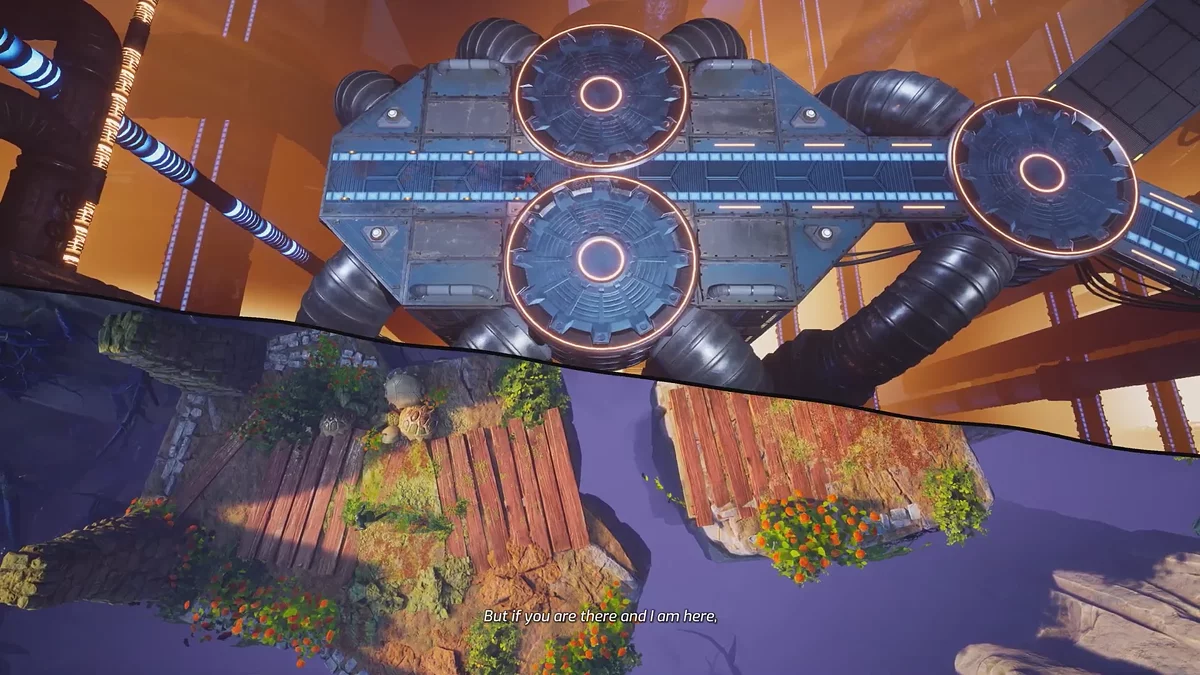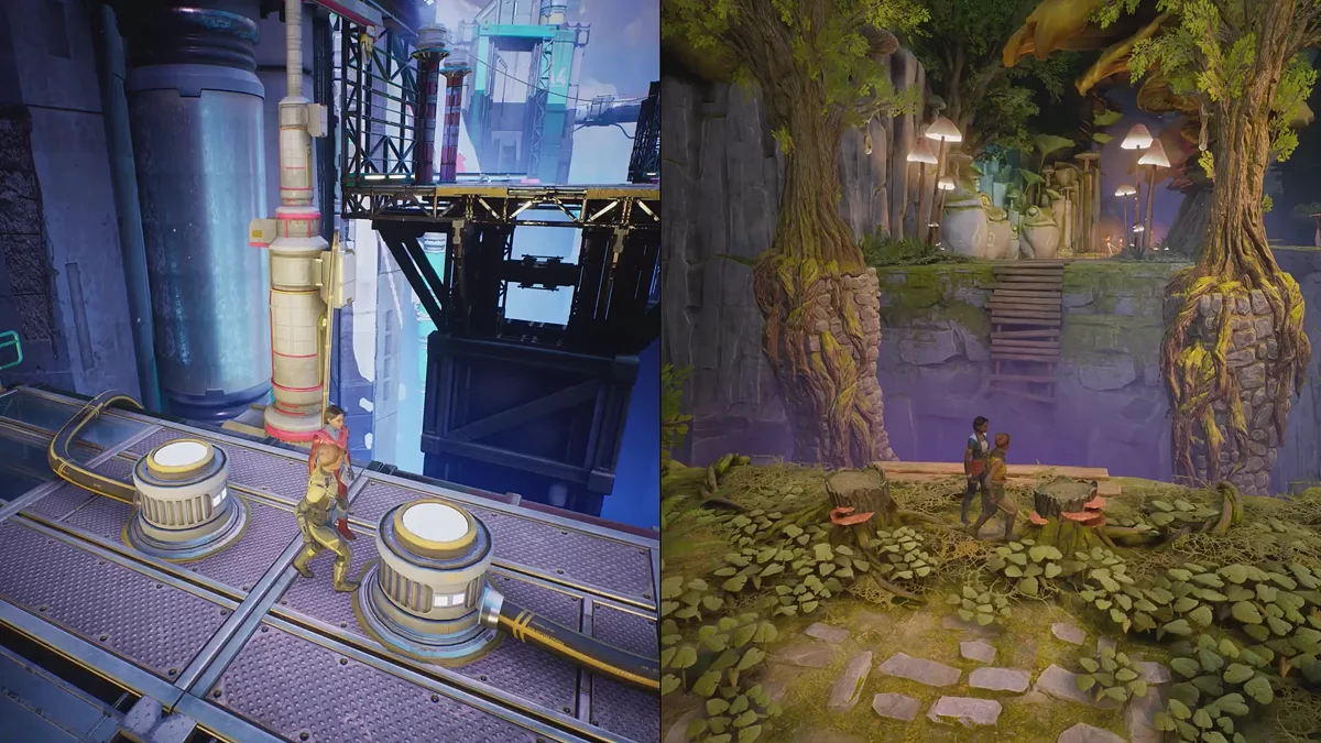 С самого начала вы заметите, что Мио и Зои как-будто идут рядом, но существуют в разных плоскостях. Миры параллельные, странные и перекрученные — разберёмся с этим позже. Пока просто выполняйте лёгкие платформенные прыжки, пока пути обеих героинь наконец не пересекутся. Интересная деталь: девушки могут взаимодействовать друг с другом, но каждая видит напарницу только «в своём» мире. Встаньте на кнопки или пни — в ответ краны или деревья позади вас начнут раскачиваться, создавая точки, через которые можно перебраться на другую сторону пропасти.