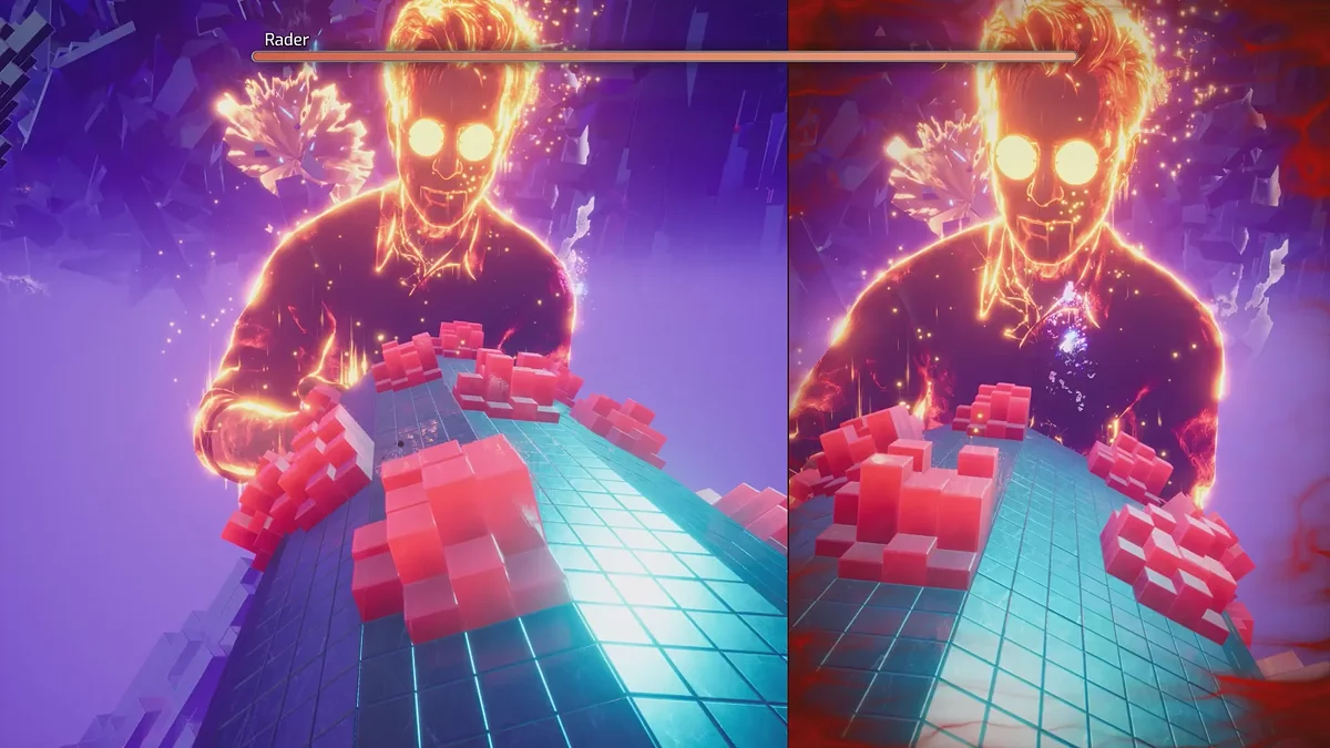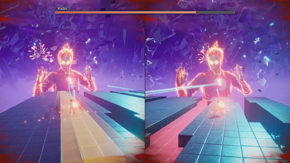 Лицом к лицу с Рейдером — вас ждёт первая из трёх больших стычек. Для начала нужно просто догнать его. Пока вы несётесь по новой платформе, Рейдер швыряет в вас розовые ударные волны и целые стены, которые летят прямо по траектории прыжка. Любое касание — мгновенная смерть, так что прыгайте, лавируйте и держите ритм, будто завтра вылезать в рейд уже не придётся. Пройдите комбинации стены и ударной волны, чтобы остаться в живых и продолжать движение.