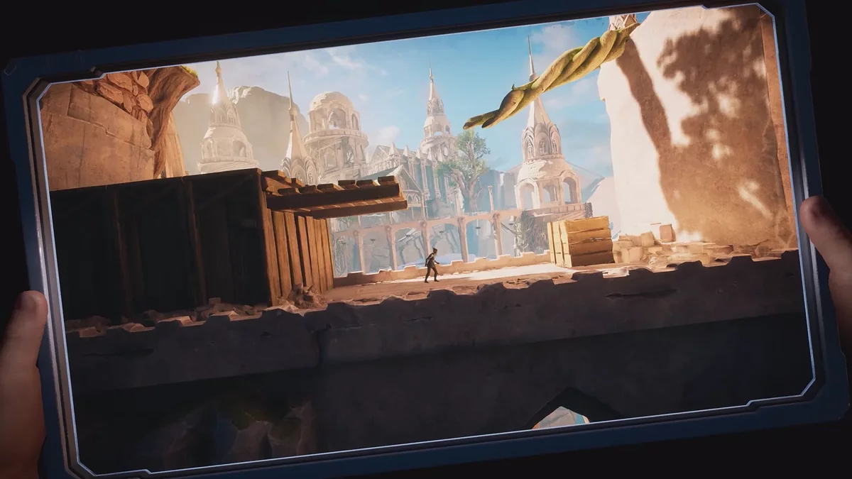 Теперь ситуация снова переворачивается: Зои оказывается запертой внутри планшета, а Мио — снаружи, и именно ей приходится буквально «перекатывать» мир под ногами Зои. Вся механика здесь строится на том, что Мио может физически наклонять планшет влево и вправо, заставляя внутренние объекты смещаться.