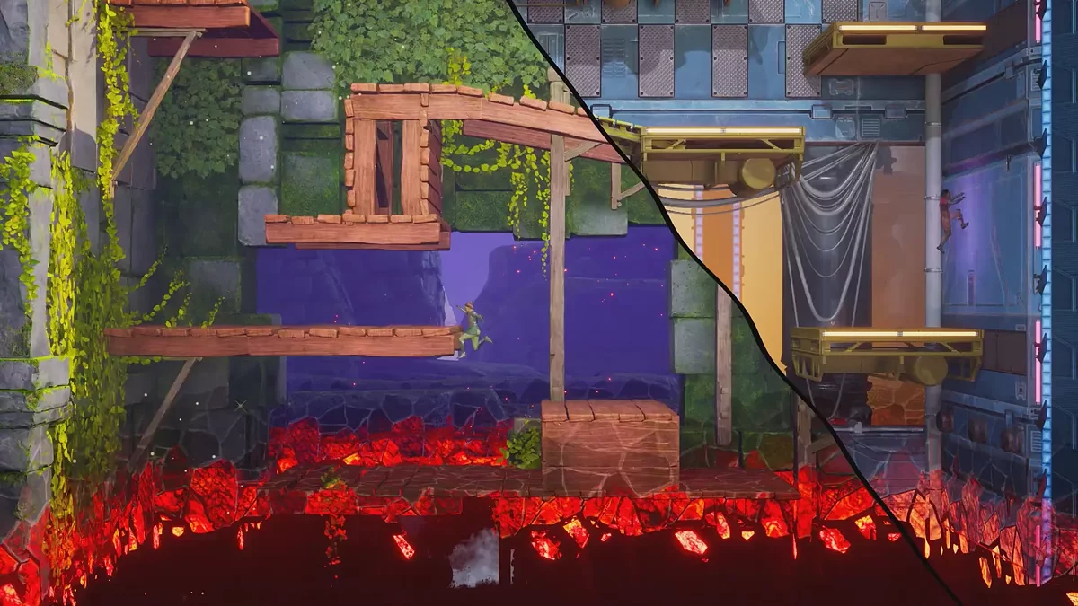 Через пару кнопочных платформ перспектива снова меняется. Теперь нужно подняться вверх по своеобразному псевдо-вертикальному уровню в духе Ice Climbers, пока снизу медленно поднимается смертельная пустота, вызванная Рейдером. Здесь скорость — главный фактор. Центральная линия начинает狂но скакать между научно-фантастической эстетикой Мио и сказочным фэнтези у Зои, пытаясь сбить вас с толку. Но главное помнить: несмотря на разный визуальный стиль, обе стороны — это один и тот же платформинг, один к одному. То, что выглядит иначе, механически полностью совпадает.