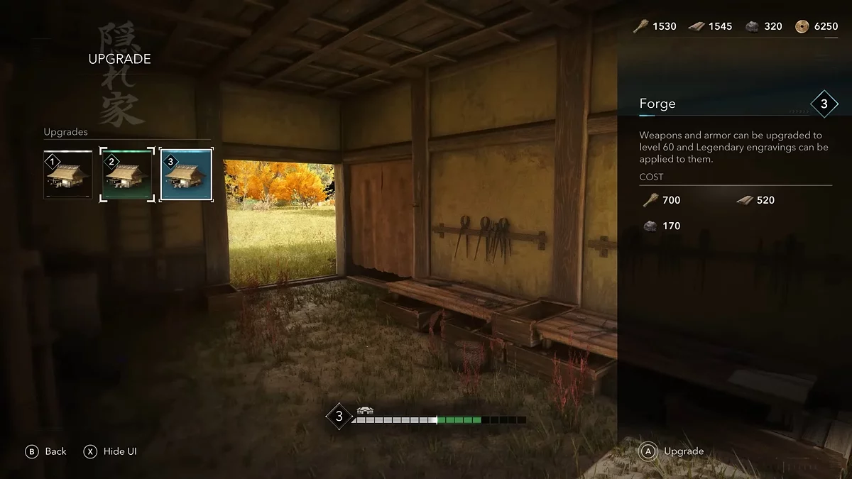 - Дуб (повышает уровень стрелкового снаряжения Ясукэ);