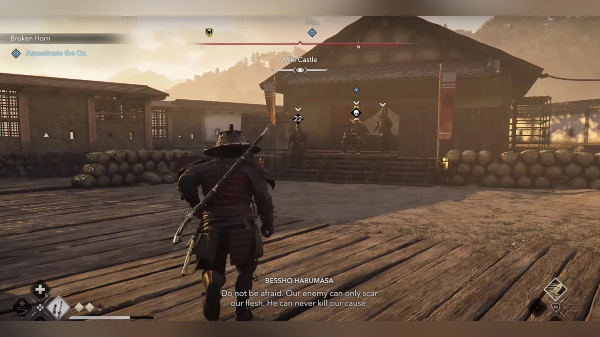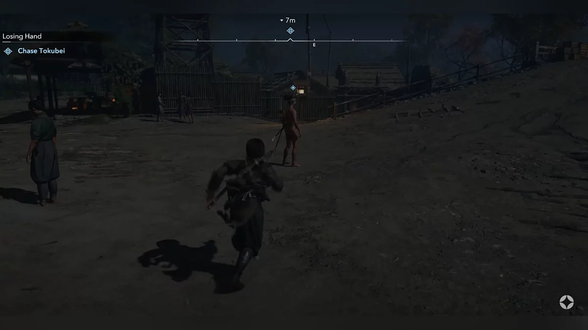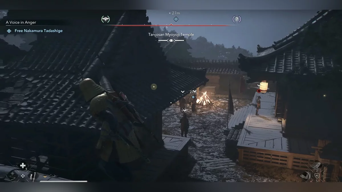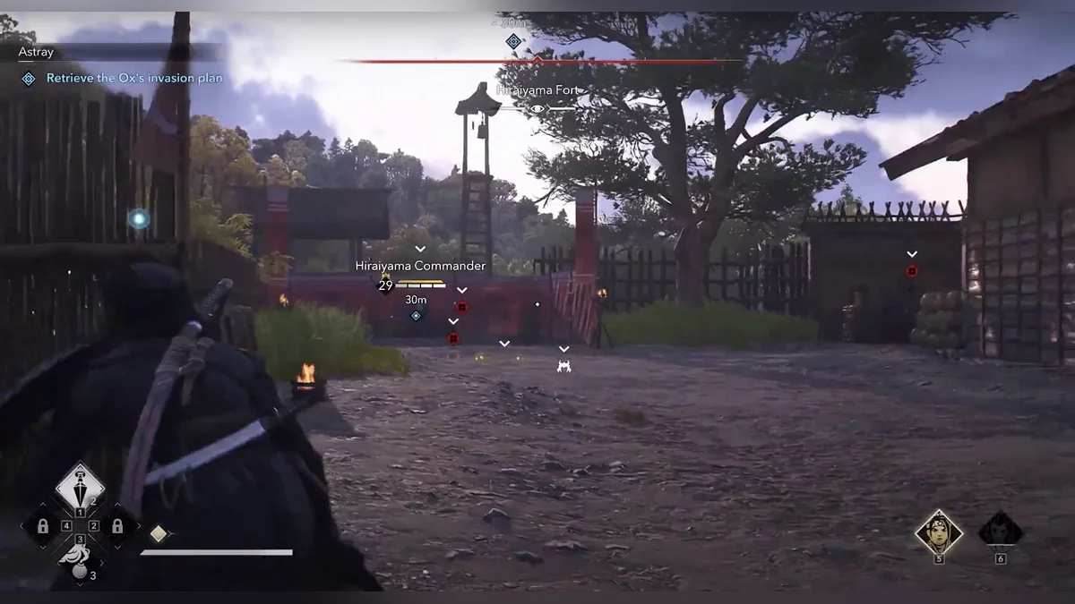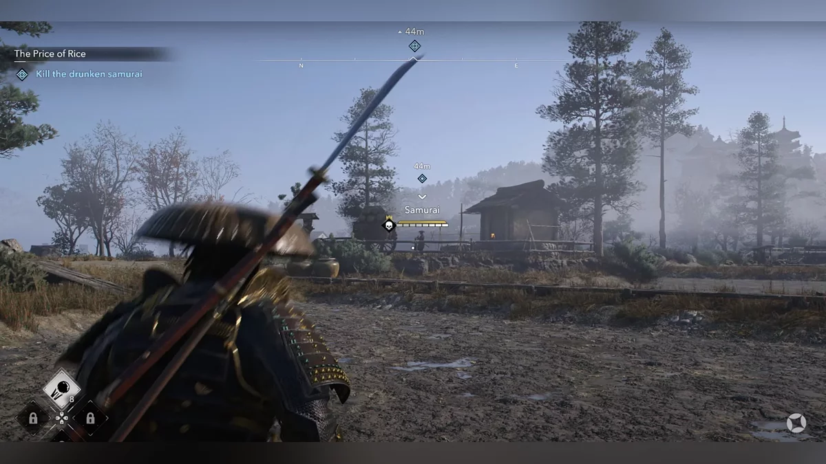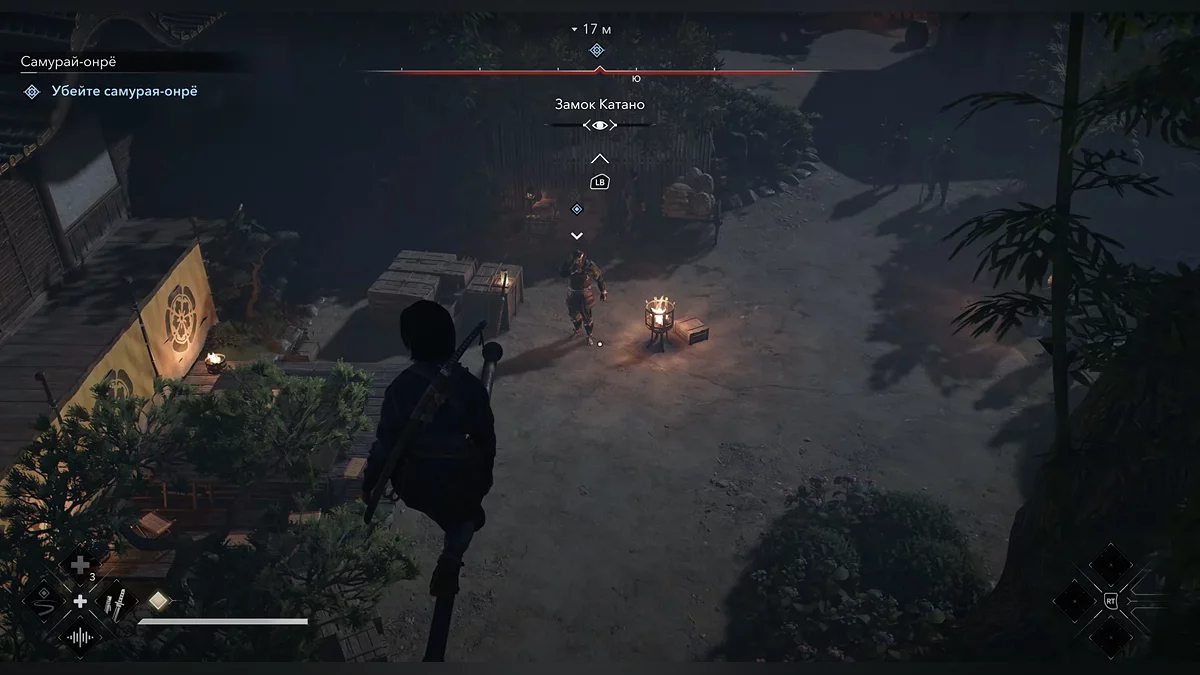 Доберитесь до возвышенности и наблюдайте за самураем Онрё. Продвигайтесь на юг к зданию перед вами, чтобы вычислить самурая Онрё.