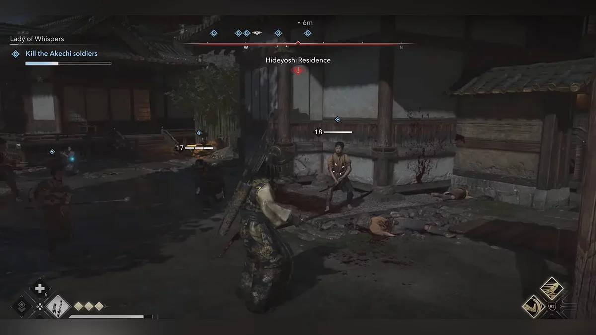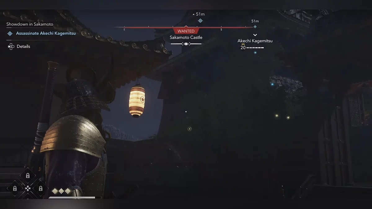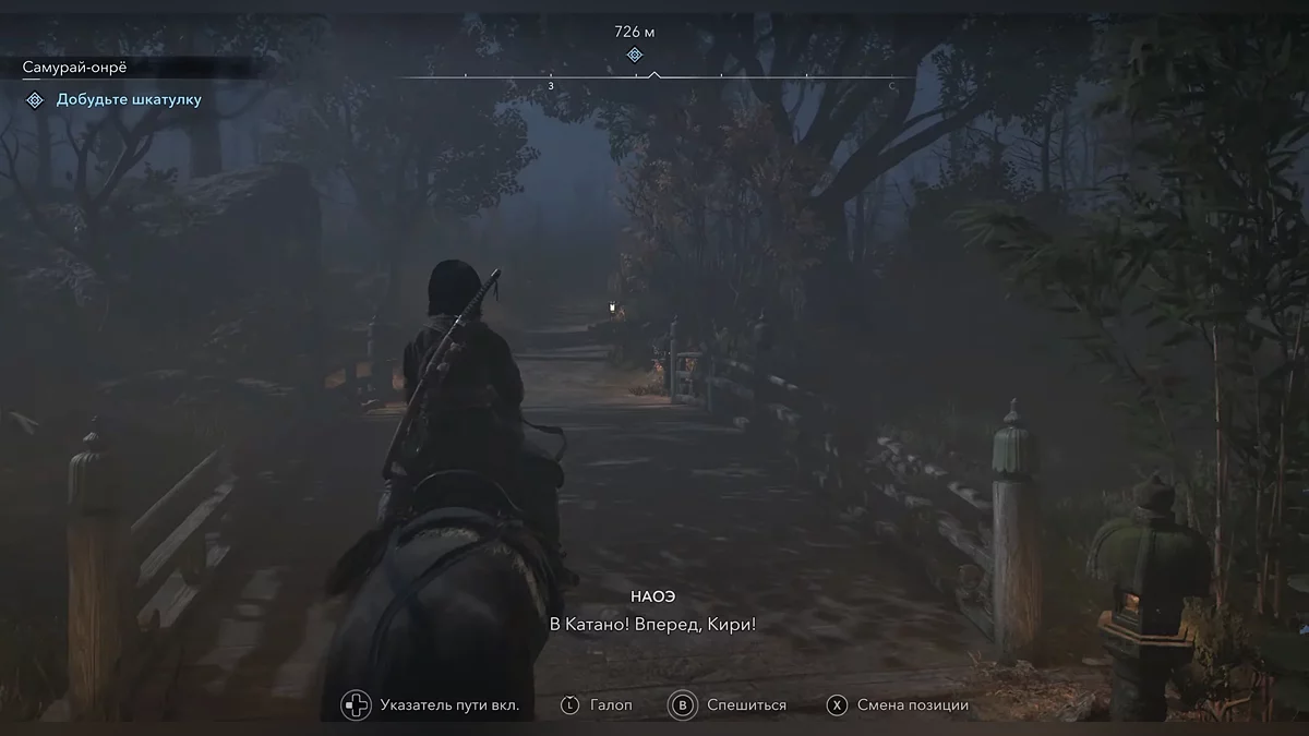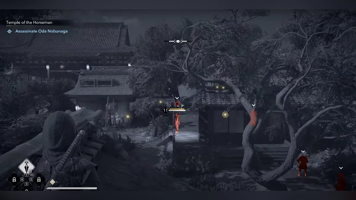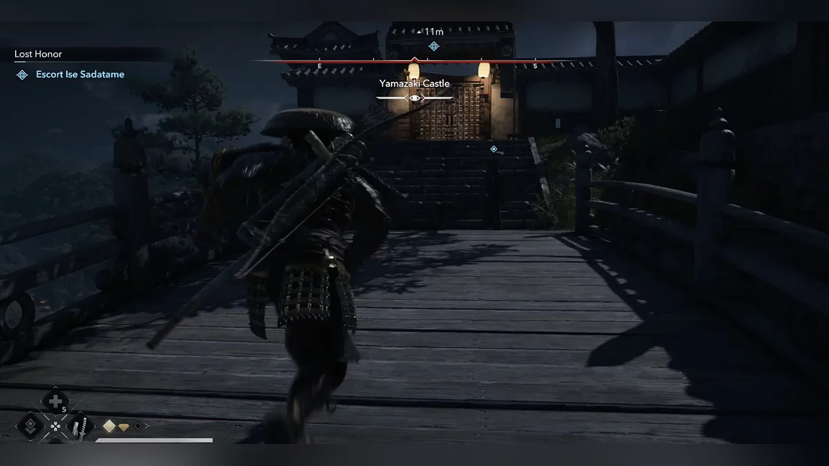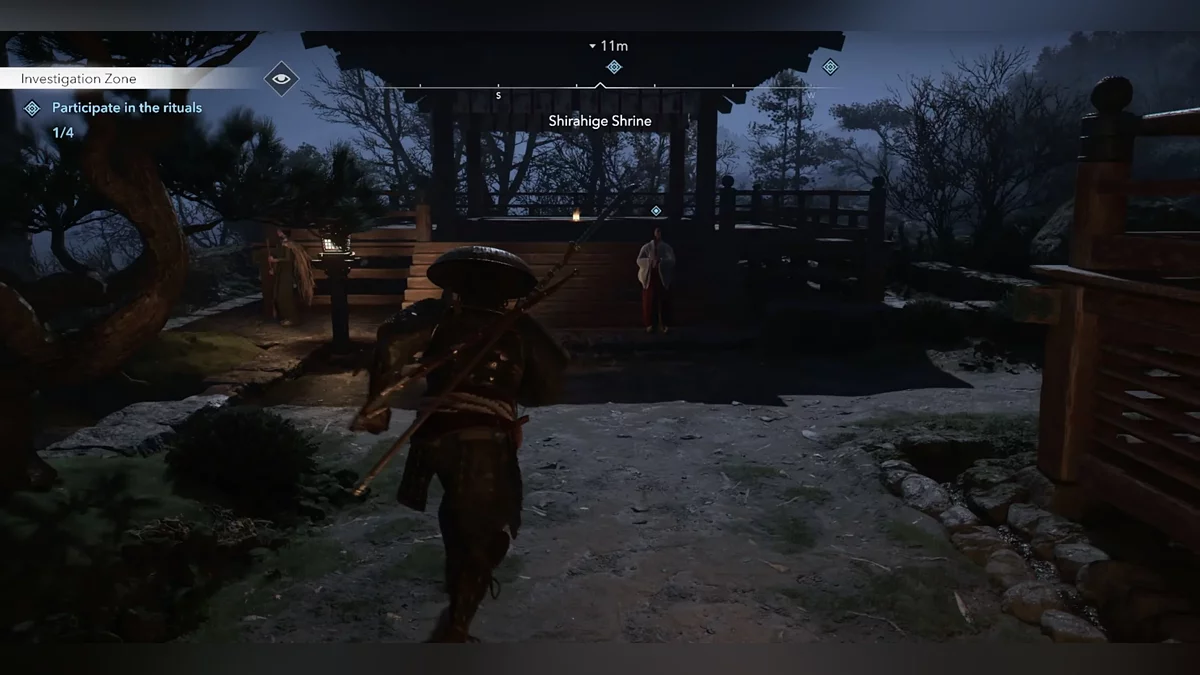 Доберитесь до возвышенности и наблюдайте за самураем Онрё. Продвигайтесь на юг к зданию перед вами, чтобы вычислить самурая Онрё.