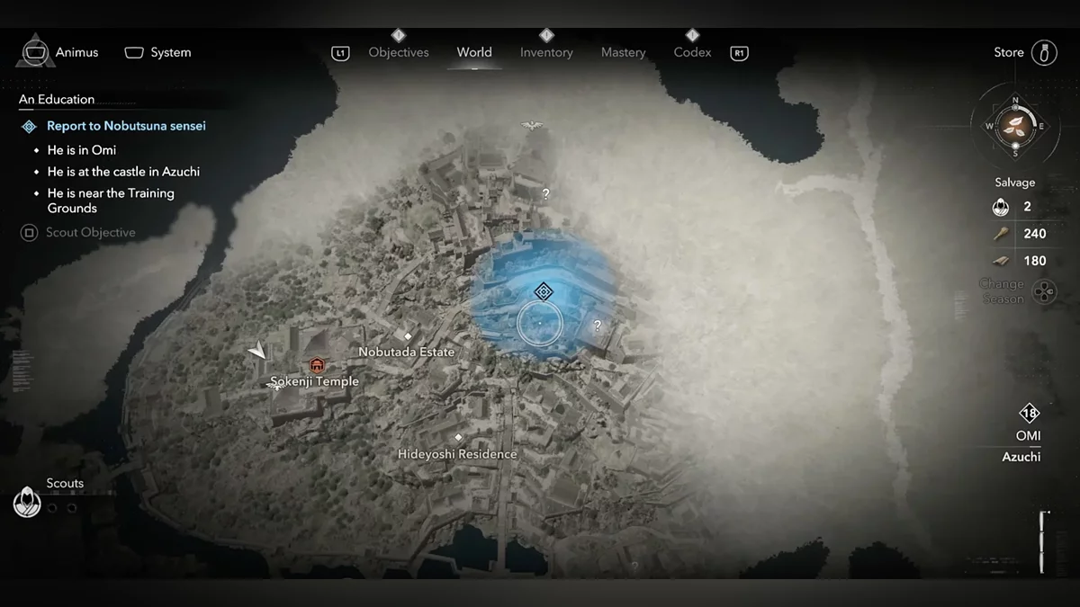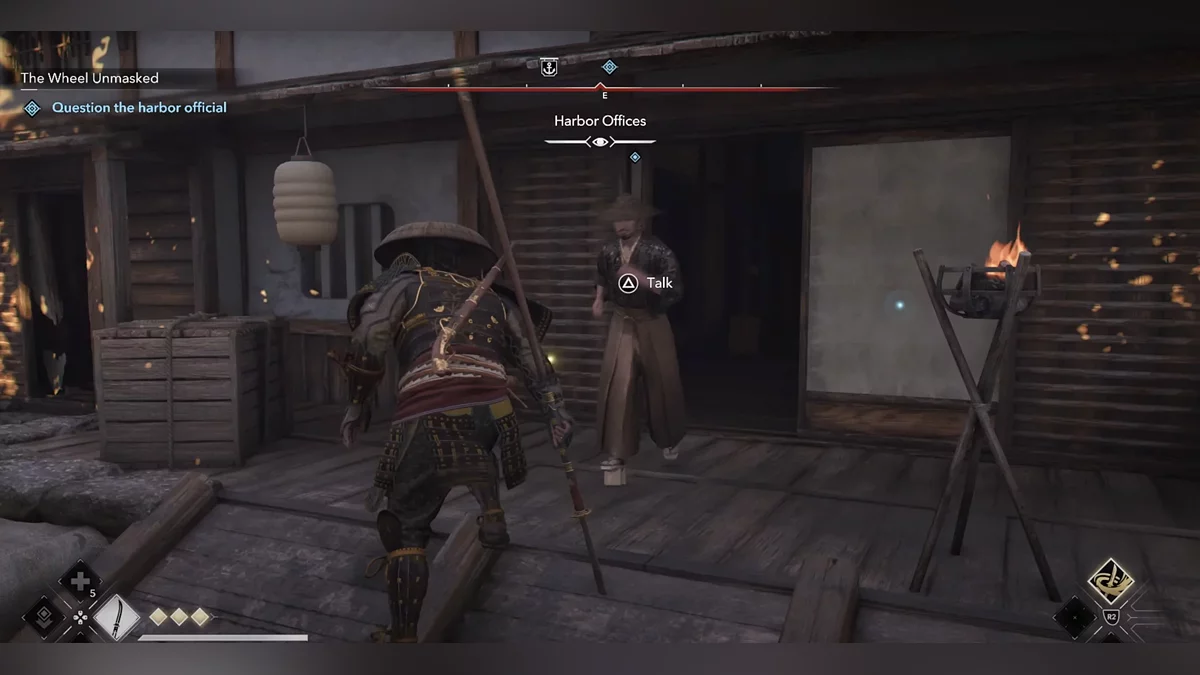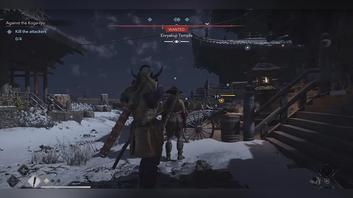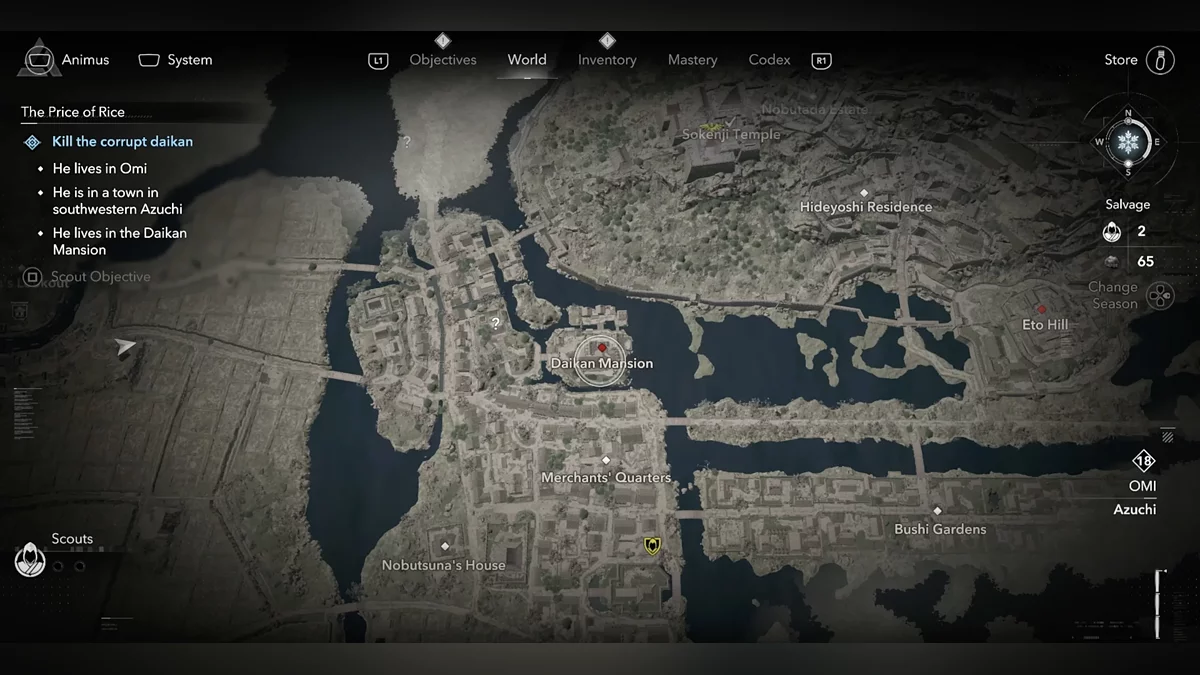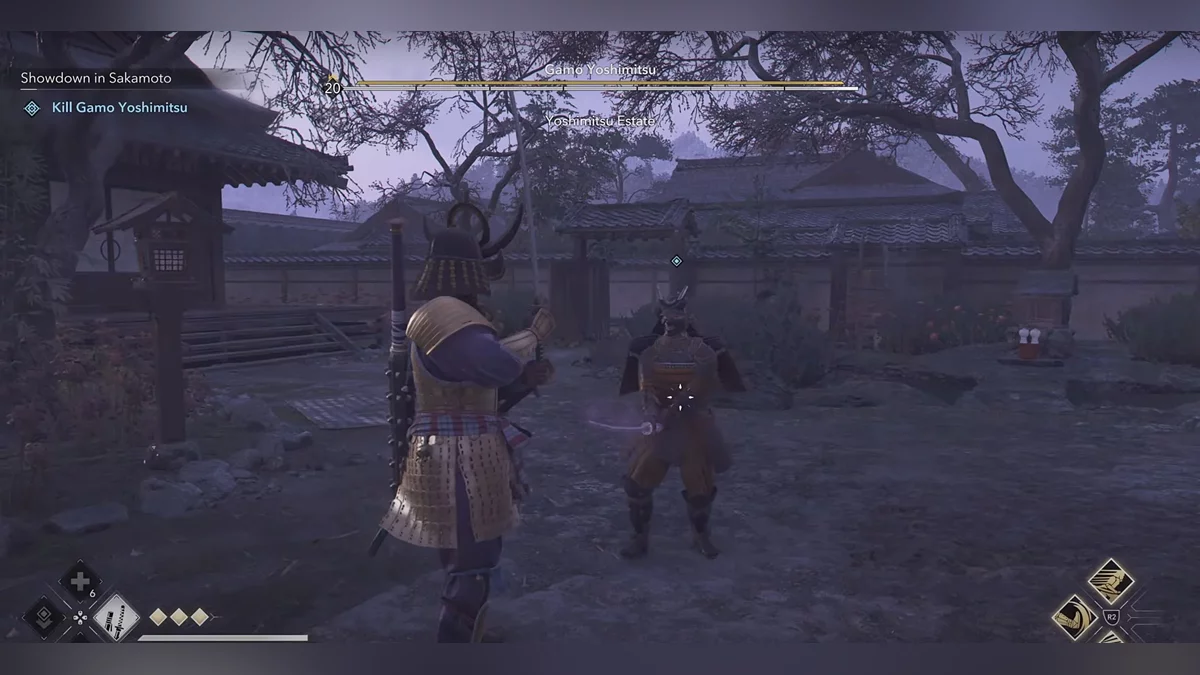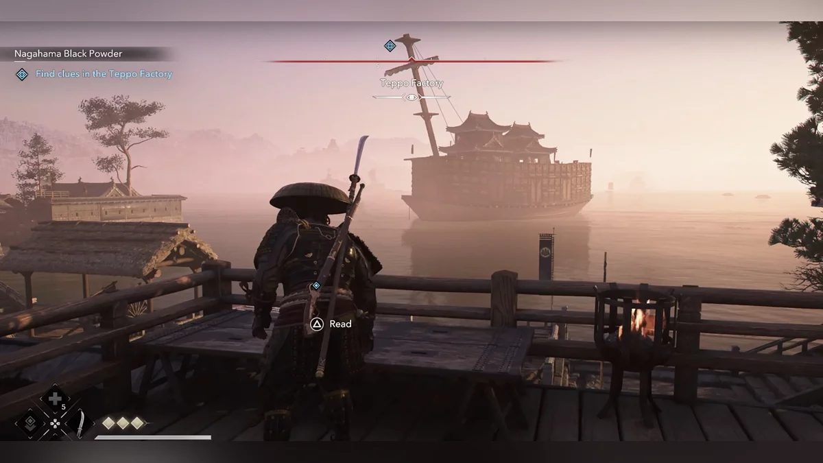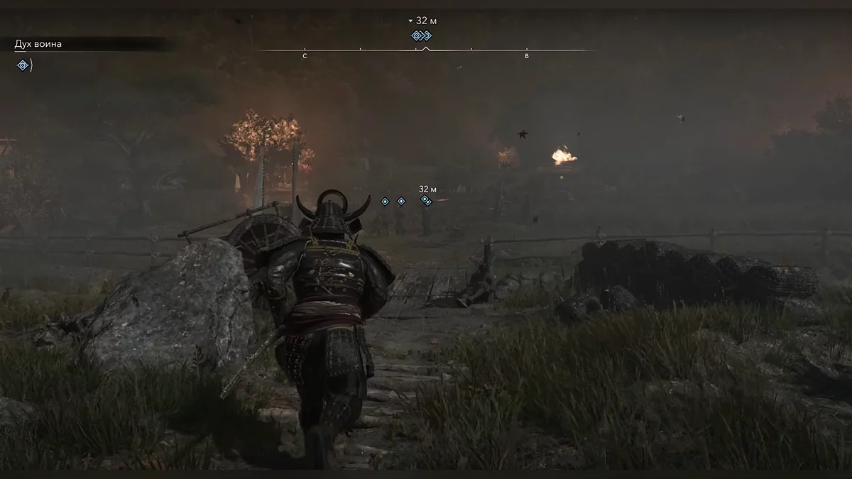 Доберитесь до возвышенности и наблюдайте за самураем Онрё. Продвигайтесь на юг к зданию перед вами, чтобы вычислить самурая Онрё.