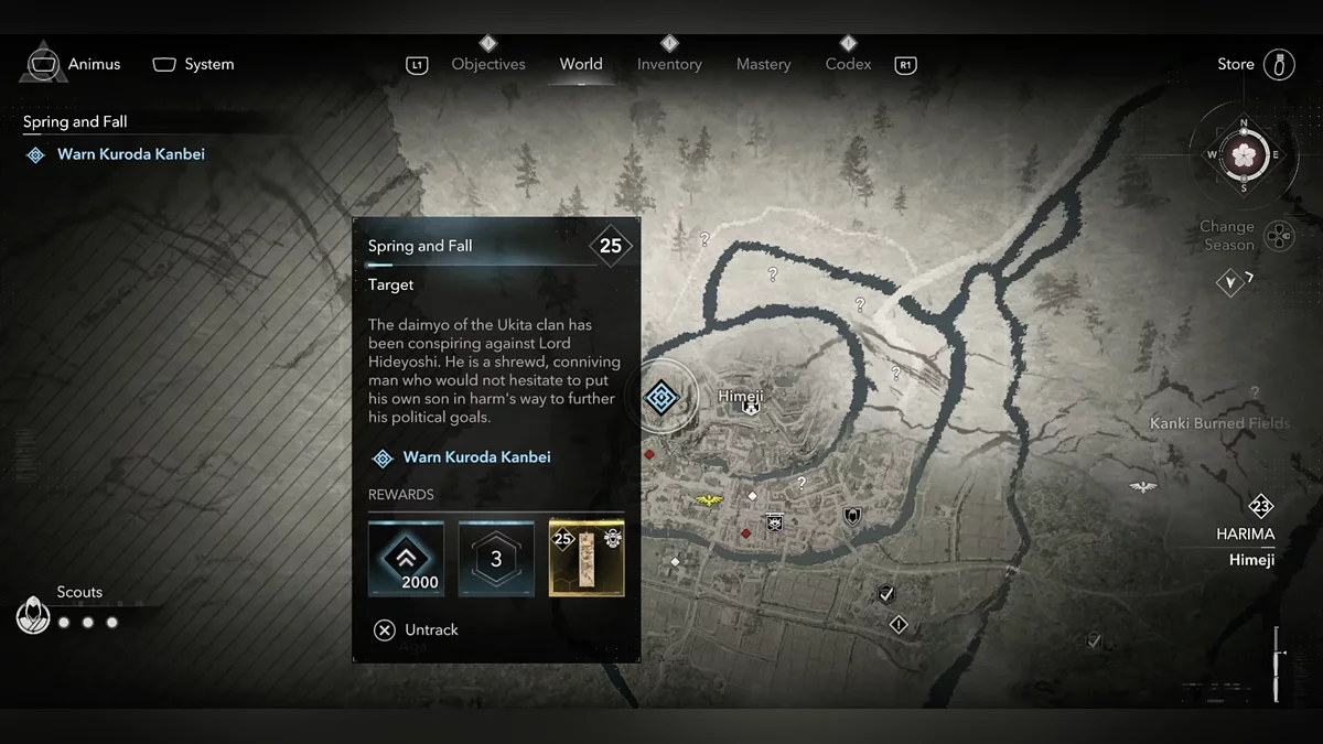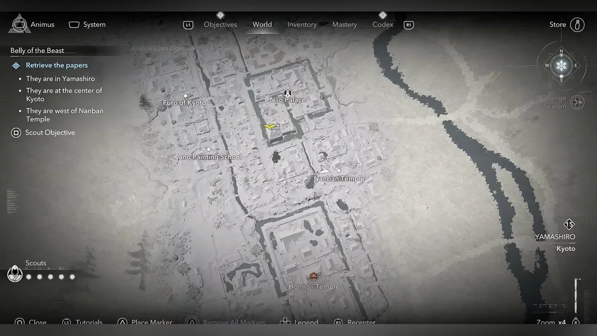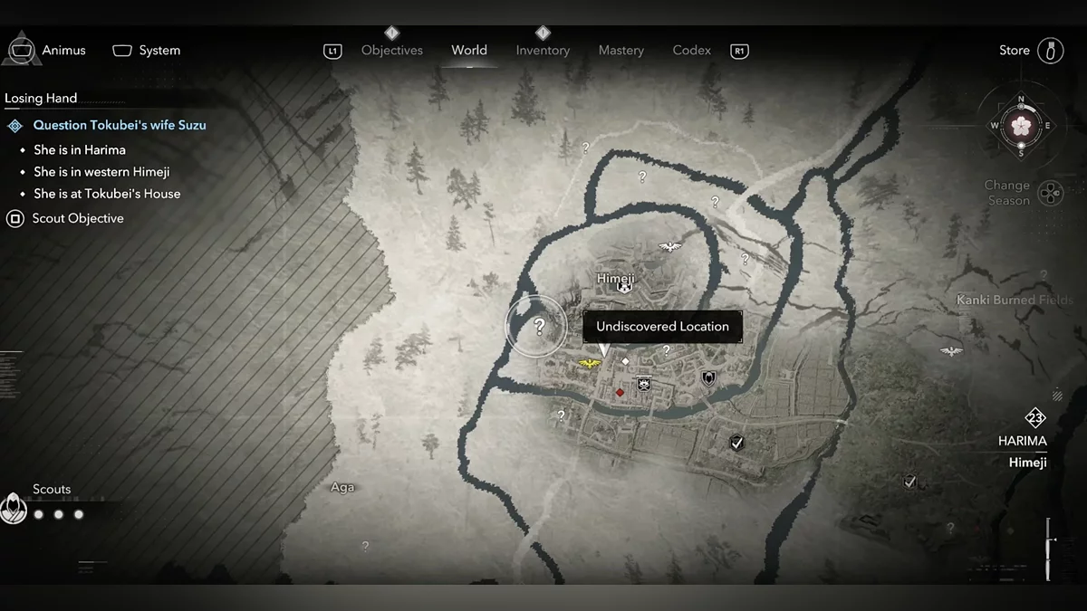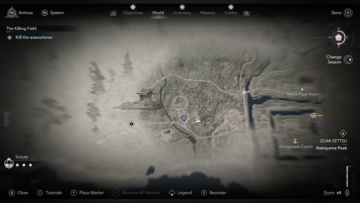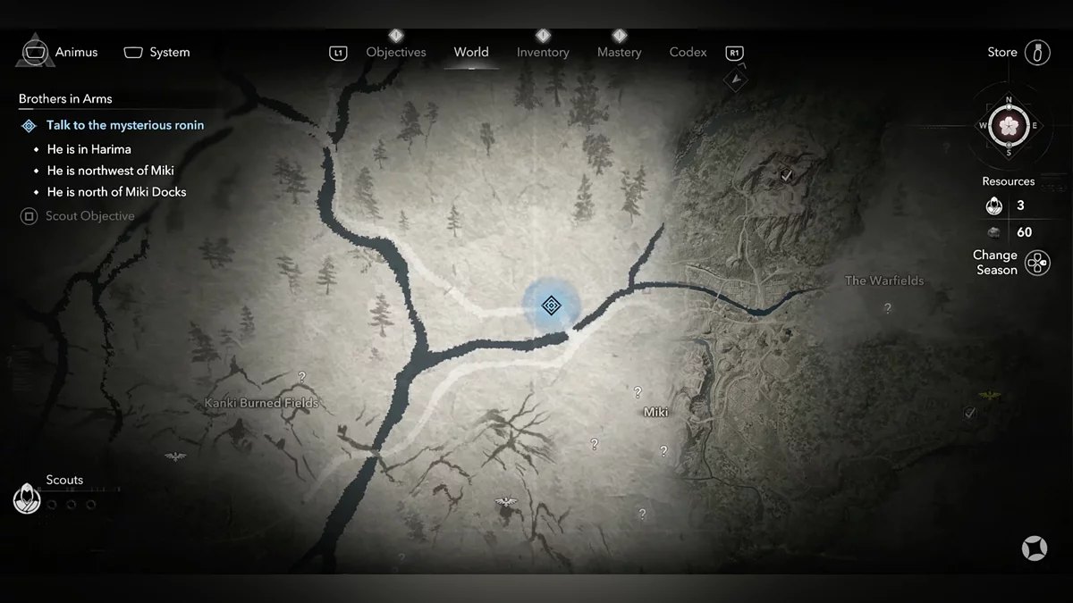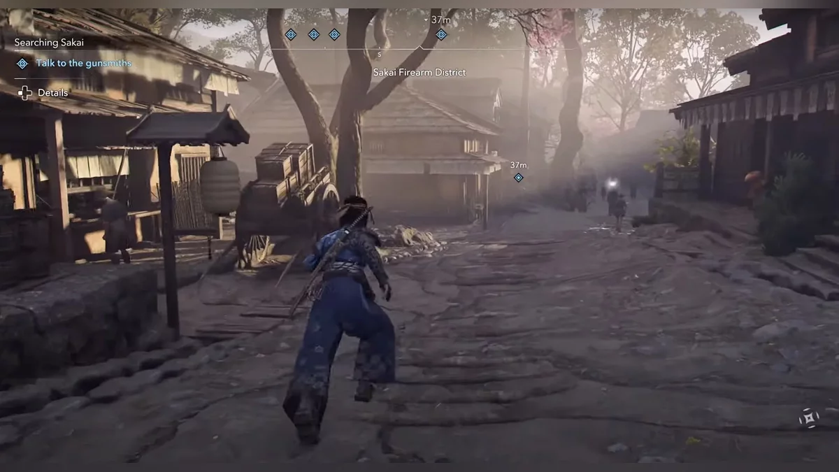 Доберитесь до возвышенности и наблюдайте за самураем Онрё. Продвигайтесь на юг к зданию перед вами, чтобы вычислить самурая Онрё.