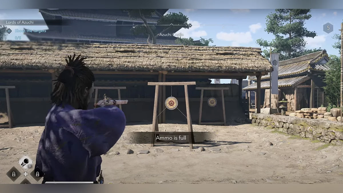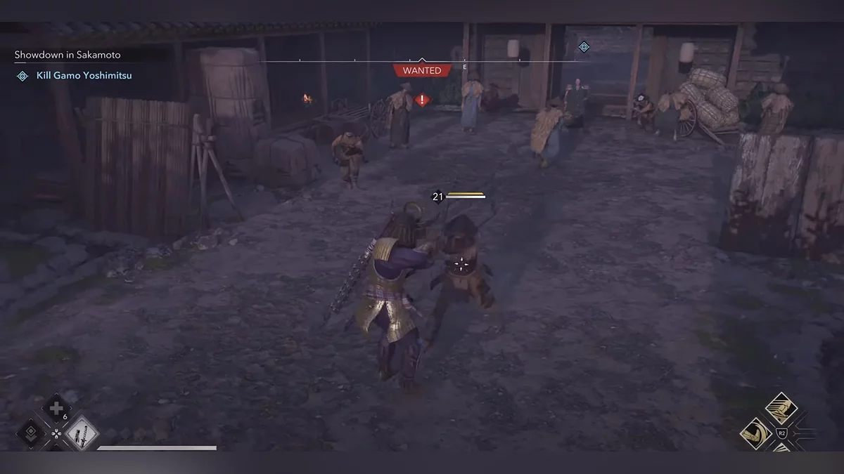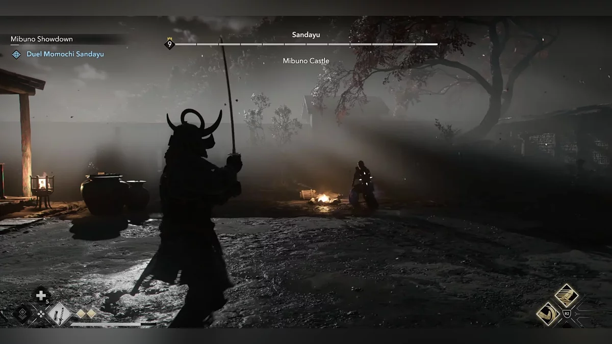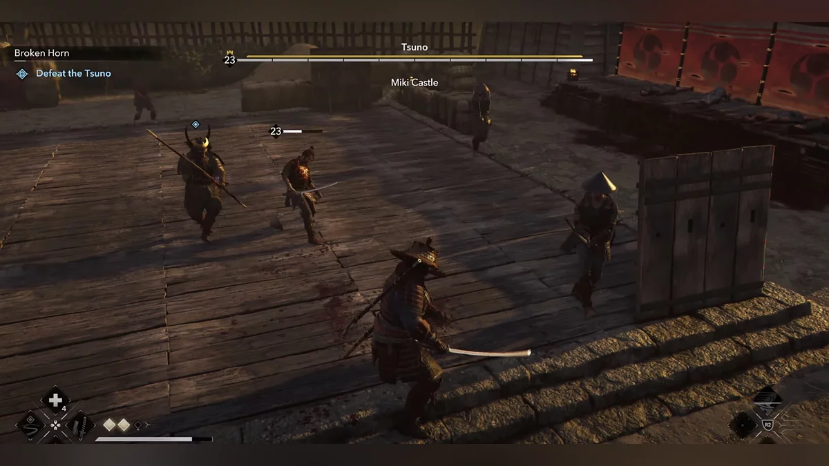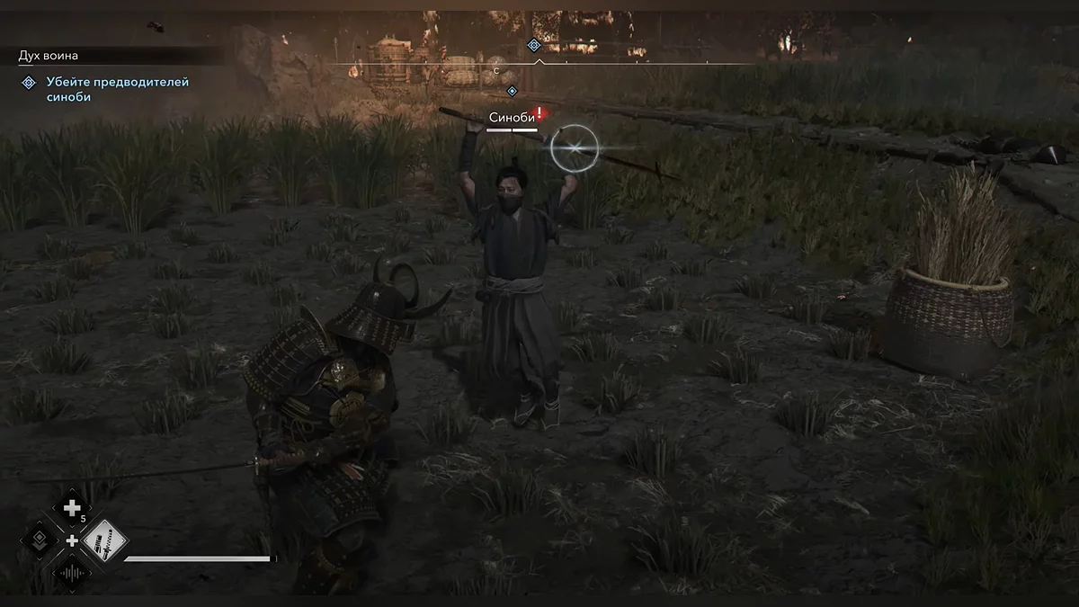 Ваш первый противник — мечник-асигару. Он использует сильные атаки, обозначенные красными кругами вокруг его рук. Эти атаки нельзя заблокировать. Вместо этого используйте уклонение или парирования.