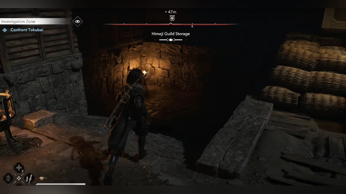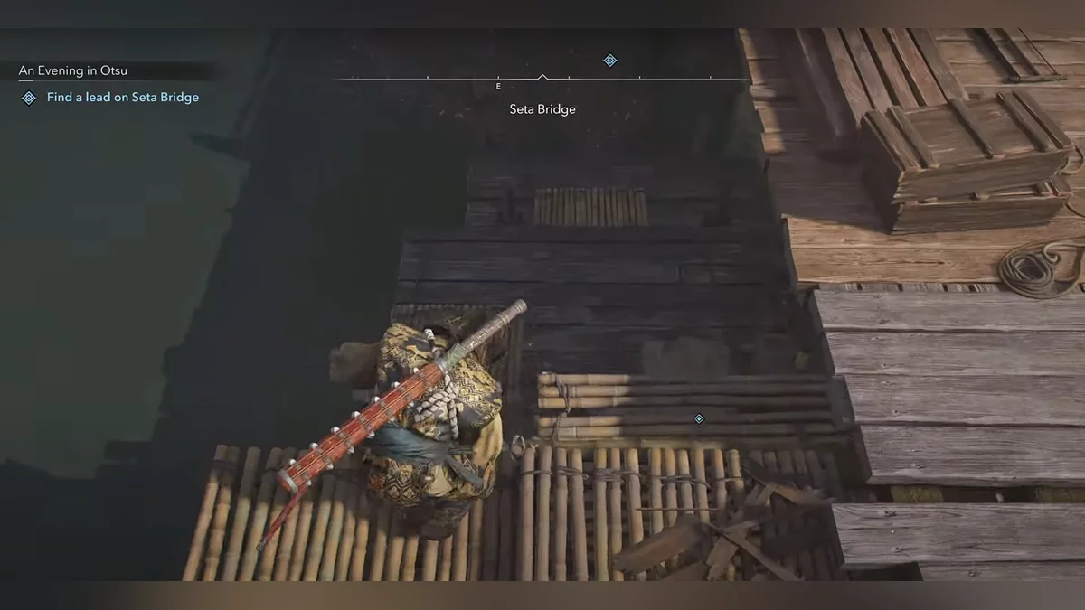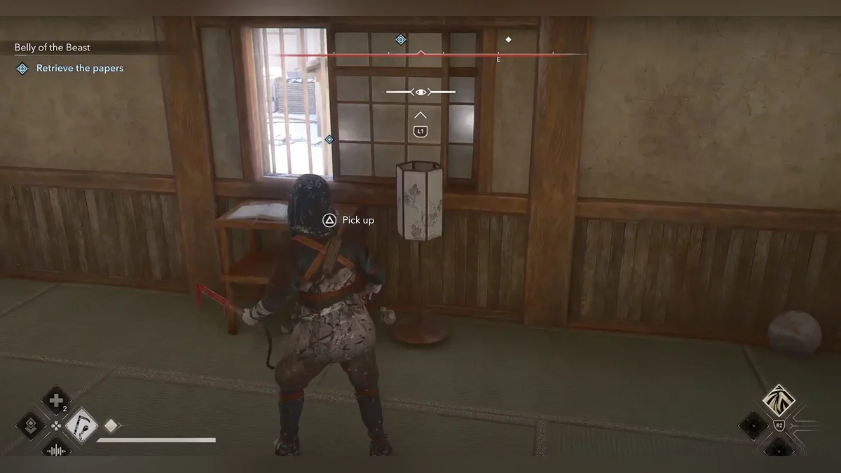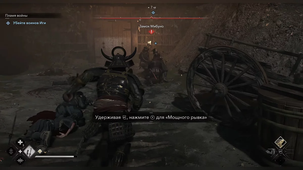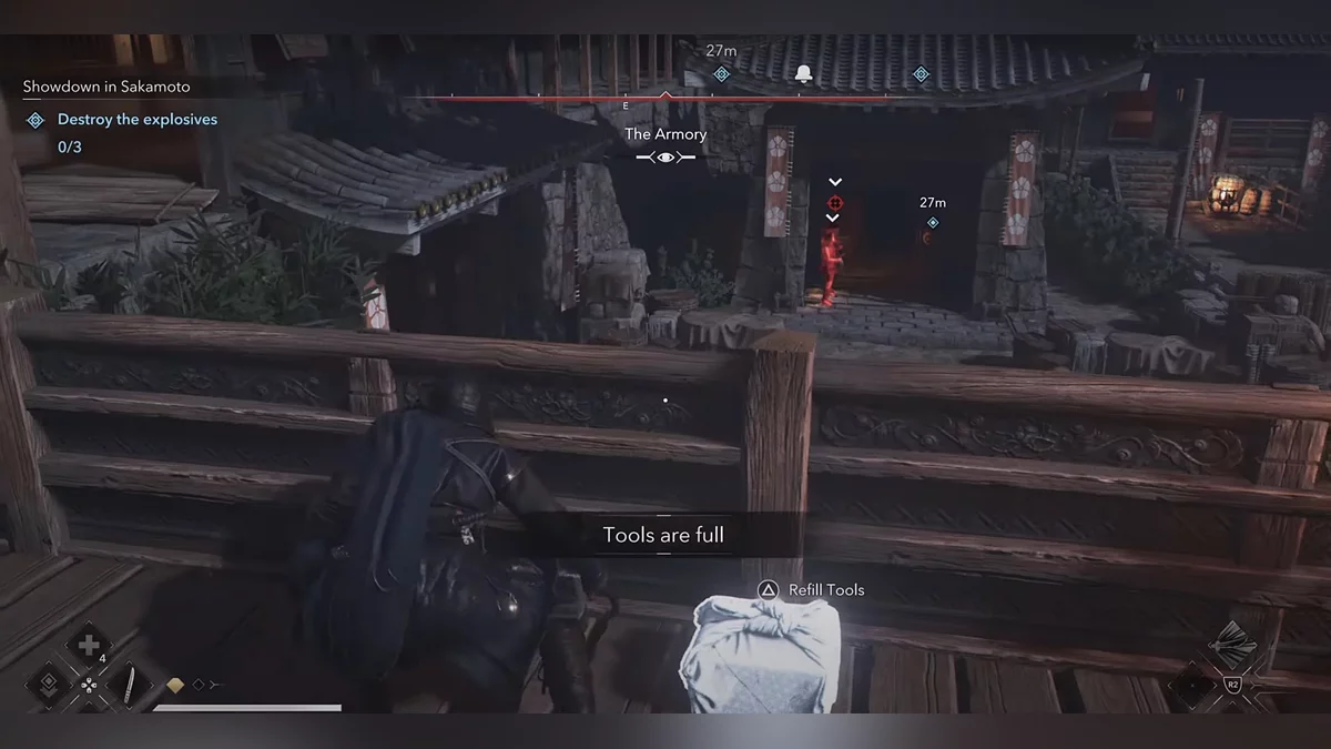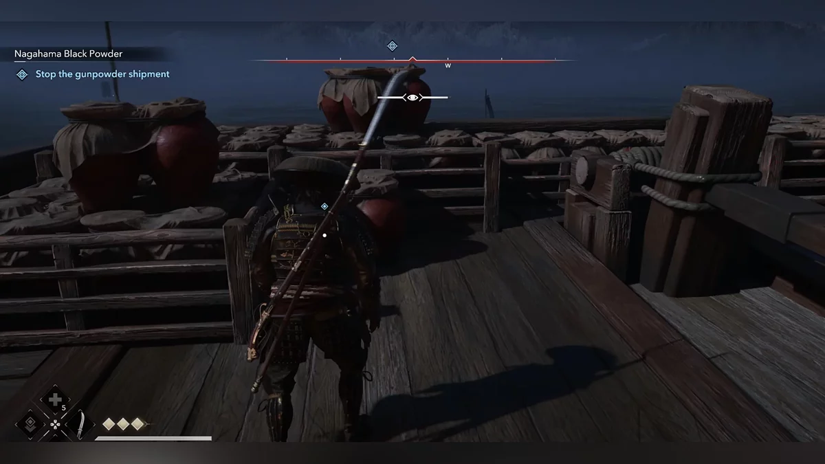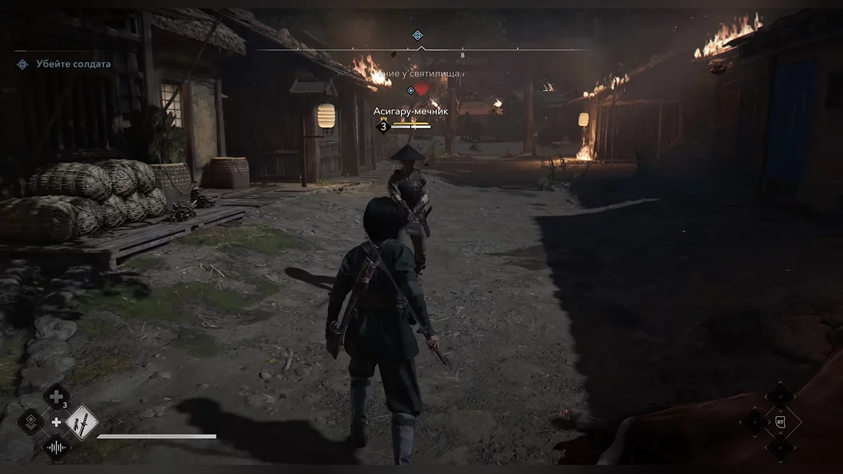Когда выберетесь из сена, пригнитесь, а затем убейте лучника прямо перед вами. Убейте следующего врага рядом с бревнами. Пополните запасы инструментов (там есть кунаи). Используйте их, чтобы убить врага бесшумно. Осторожно приближайтесь к недостроенному зданию — его охраняет синоби. Внутри находится ящик, но это не тот, который вам нужен. Всё же обыщите его.