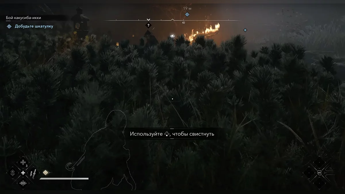 Выйдите на юг из города-святилища. На пути вас ждут несколько врагов. Пригнитесь и подкрадитесь к противникам, чтобы убить их скрытно. Используйте кусты для укрытия. Для второго врага свистните, чтобы выманить его, затем убейте. Пересеките деревянный мостик, чтобы встретить ещё одного врага. Лягте на землю и проползите через траву. Поднимитесь вверх по грязному склону, затем поверните налево, используя упавшее бревно.