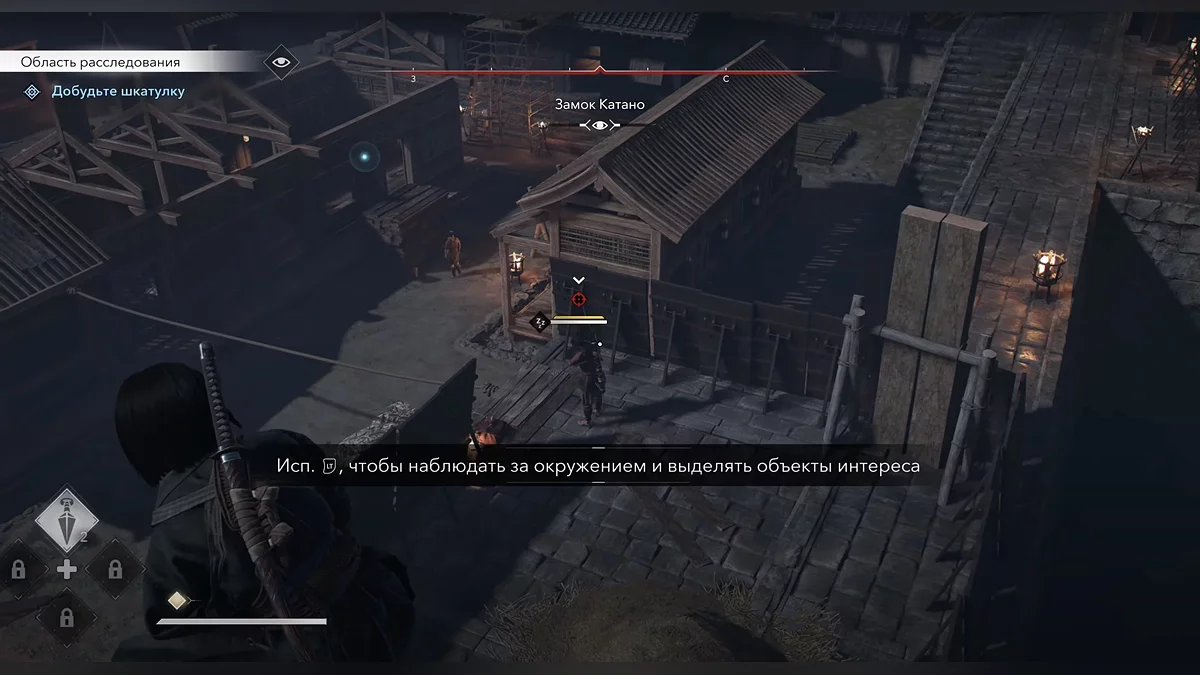 С башни осмотрите окрестности и пометьте врагов. Ящик находится в центре замка Катано, в недостроенном здании. Прыгните вниз, совершая Прыжок Веры в стог сена.