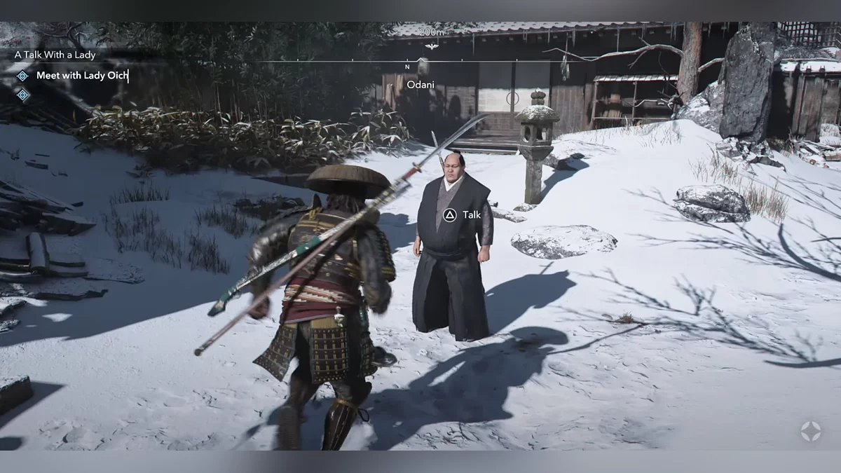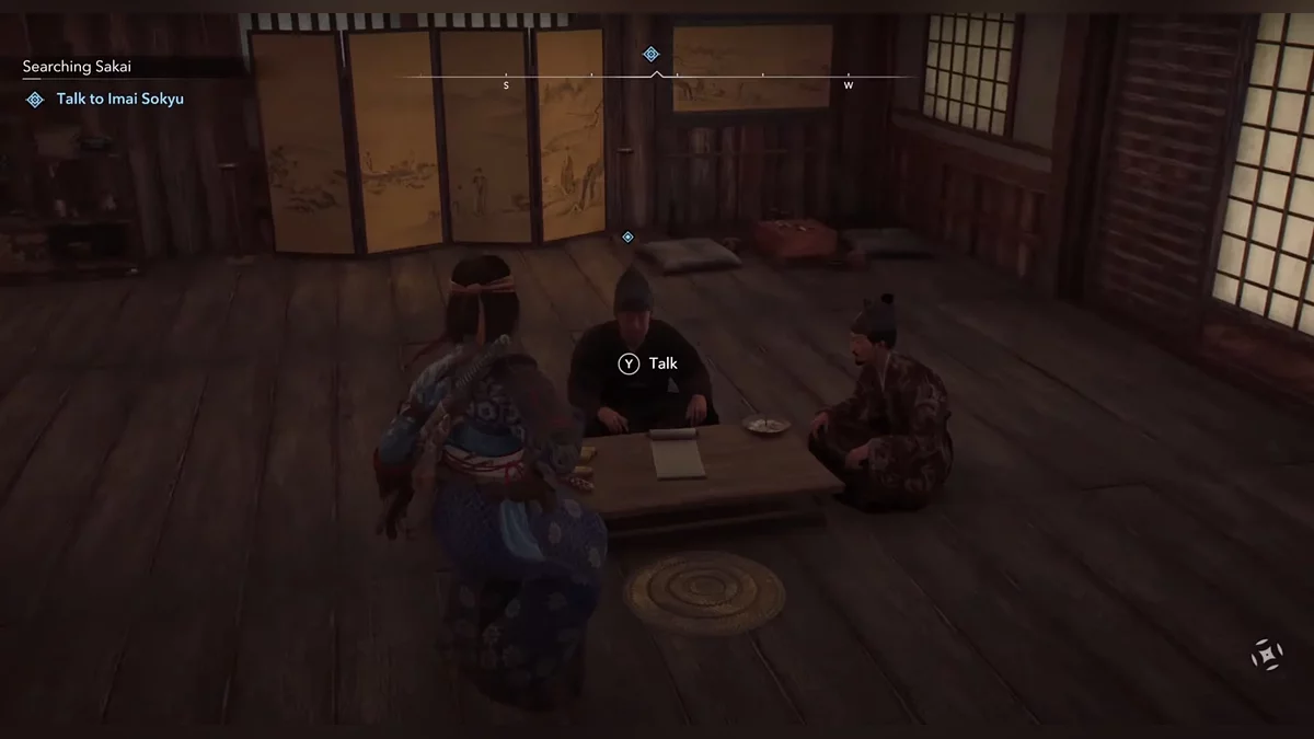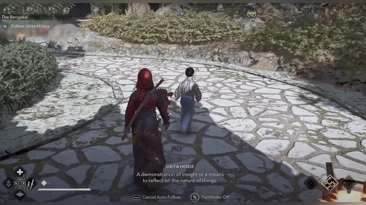 Следуйте за Хаттори Хандзо. Вы можете включить автоматическое сопровождение, если хотите. Когда он остановится, поговорите с ним. Вы получите несколько вариантов диалога: