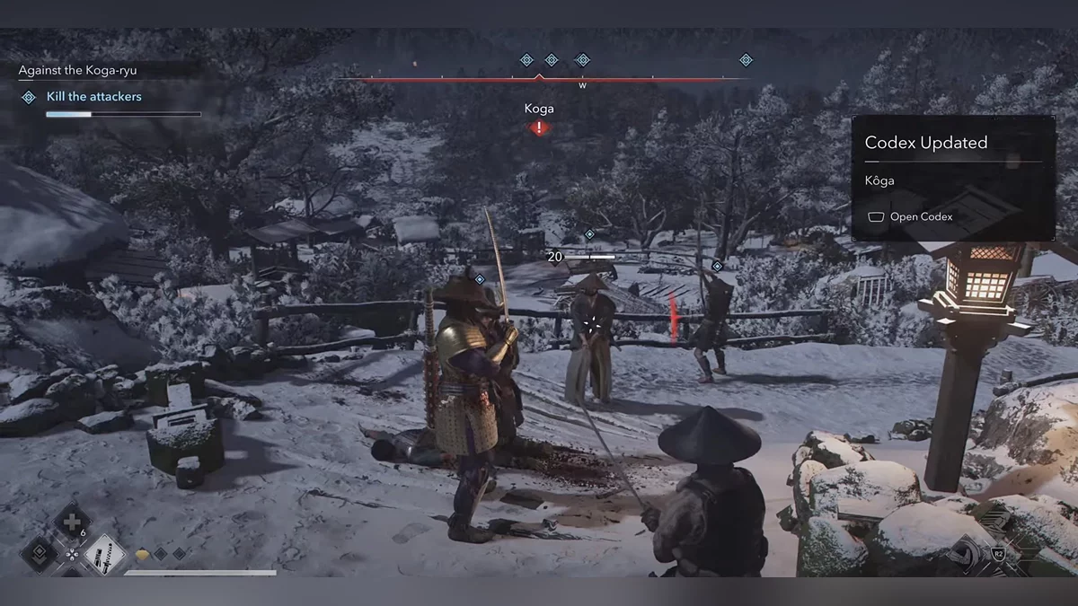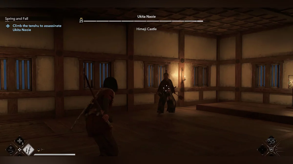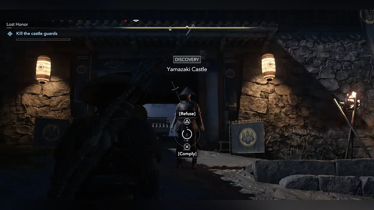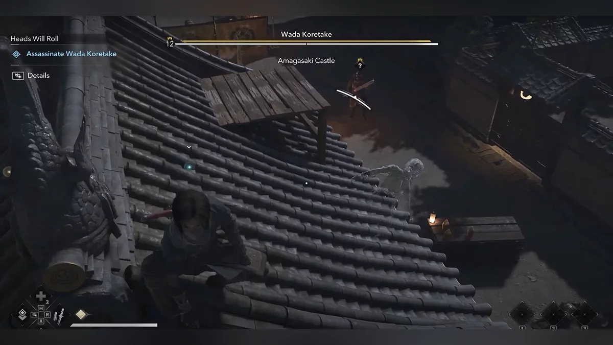 После убийства вас обнаружат самураи. У вас два варианта: сражаться с ними или сбежать — заберитесь на внешние стены замка, прыгните в ров и бегите, пока не запустится катсцена.