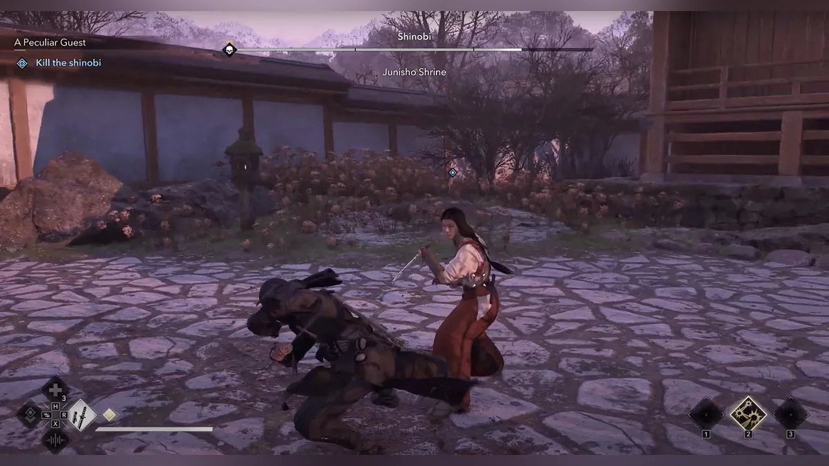 После победы пересеките длинный мост и уничтожьте троих противников. Затем следуйте на север, чтобы найти синоби. Он умеет блокировать атаки, поэтому ломайте его стойку, удерживая соответствующую комбинацию кнопок.