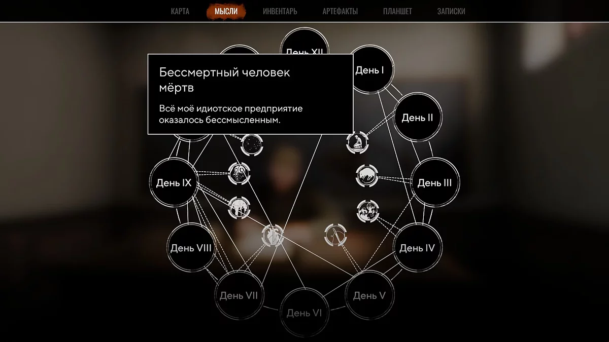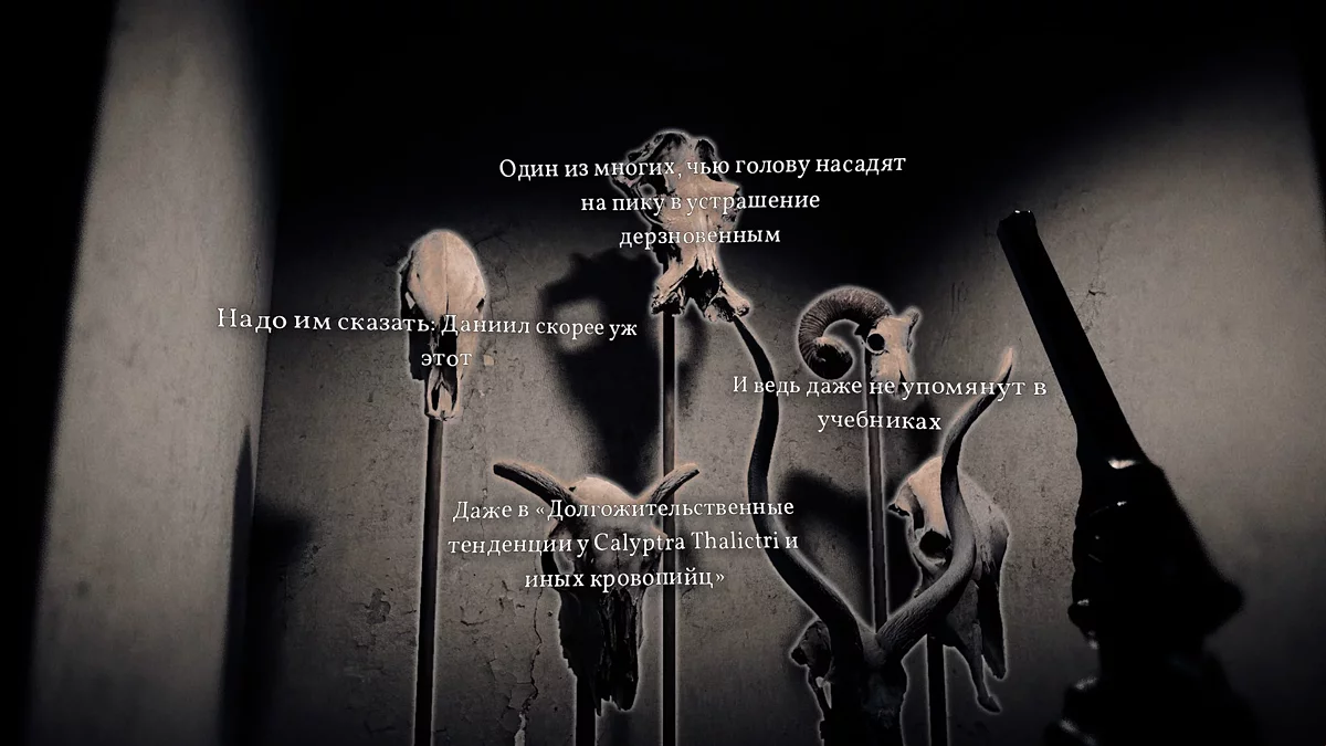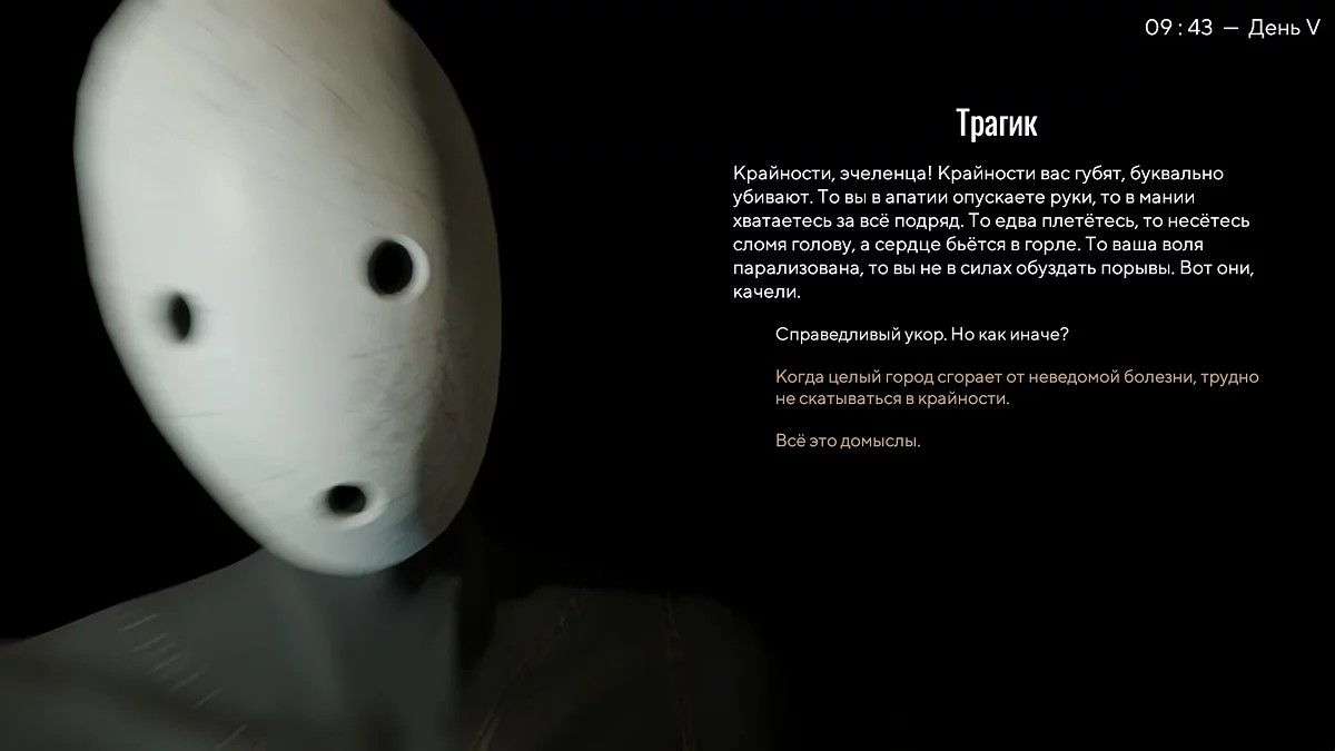 После поговорите с внезапно появившимся Ханом и выйдите на улицу. Здесь вас ждет встреча с Чумой. Когда диалог завершится, вернитесь внутрь и используйте часы справа от доски — они позволят переместиться в прошлое. На этом Pathologic 3: Quarantine завершится, а вы получите финальное достижение «Ток?..».