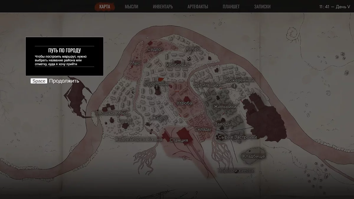 Следующий персонаж — Инспектор. Пообщайтесь с ним, ответы можно выбирать любые. Затем откройте карту мыслей (клавиша J). Чтобы продолжить игру, читать все необязательно.