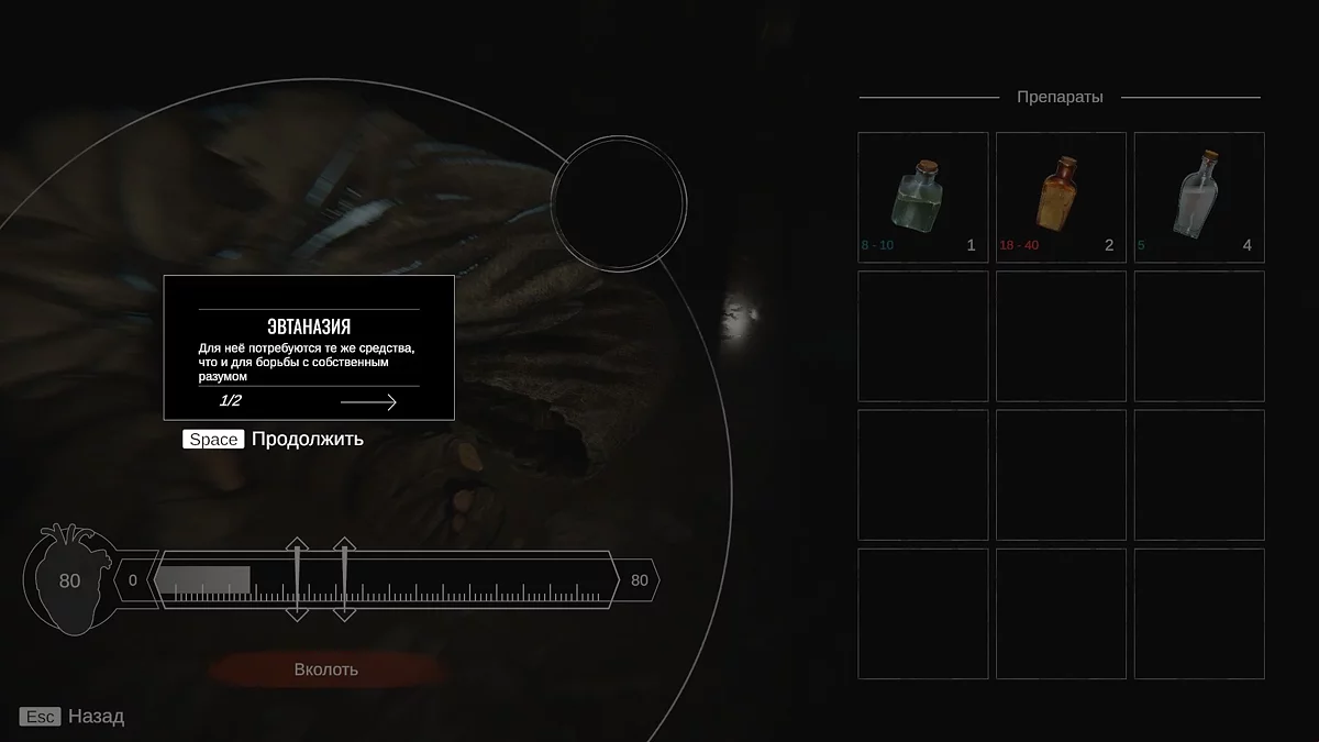 Двигаясь по охваченным чумой улицам, используйте специальное устройство — Прототип, чтобы удалить черный туман. По пути могут попадаться зараженные, лежащие на земле. Им нужно делать эвтаназию. Ваша задача правильно ввести лекарства, чтобы они умерли без боли. Морфий использовать не стоит, луше выбирать препараты послабее. Главное — держать шкалу в отмеченной зоне. Заниматься этим необязательно, но если облегчите участь хотя бы одного пациента, получите достижение «Мимолетные секунды».