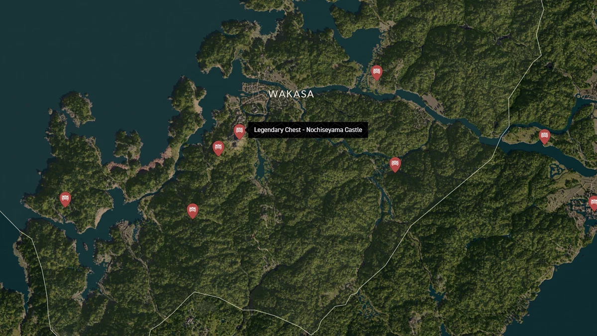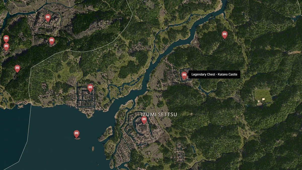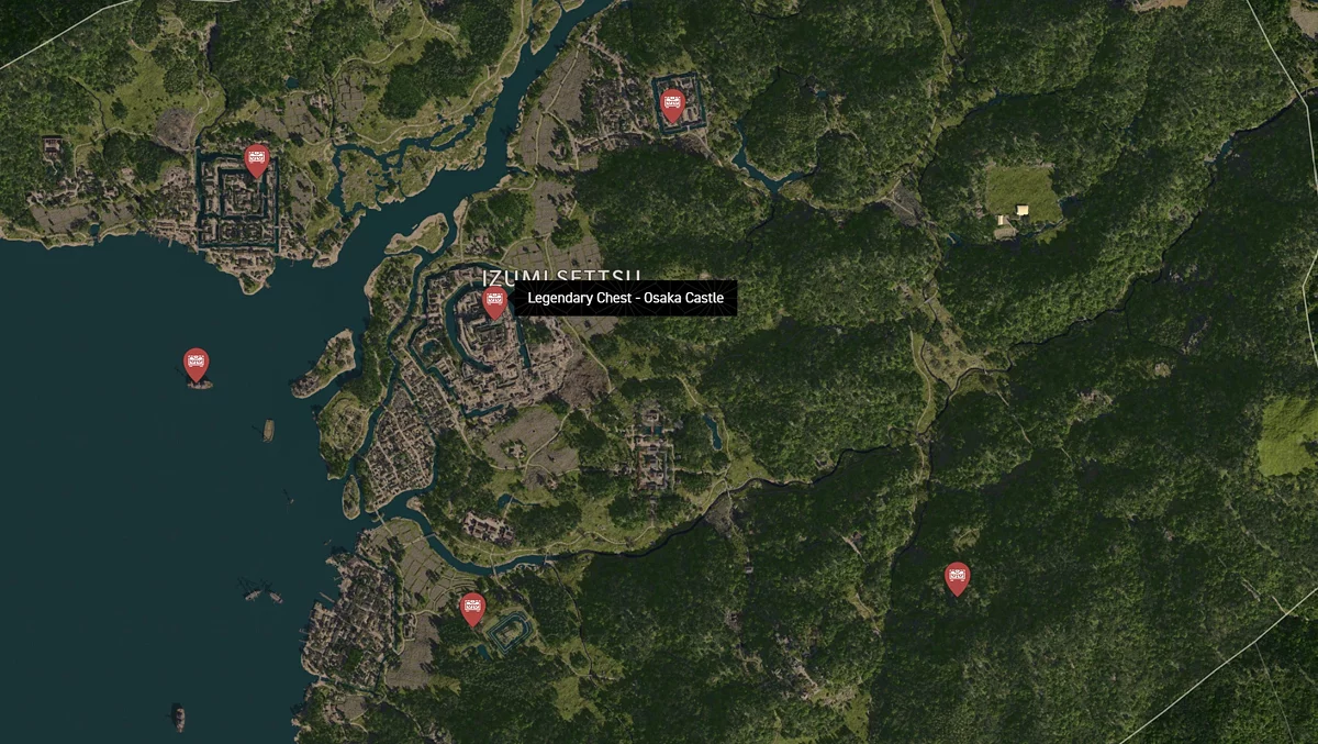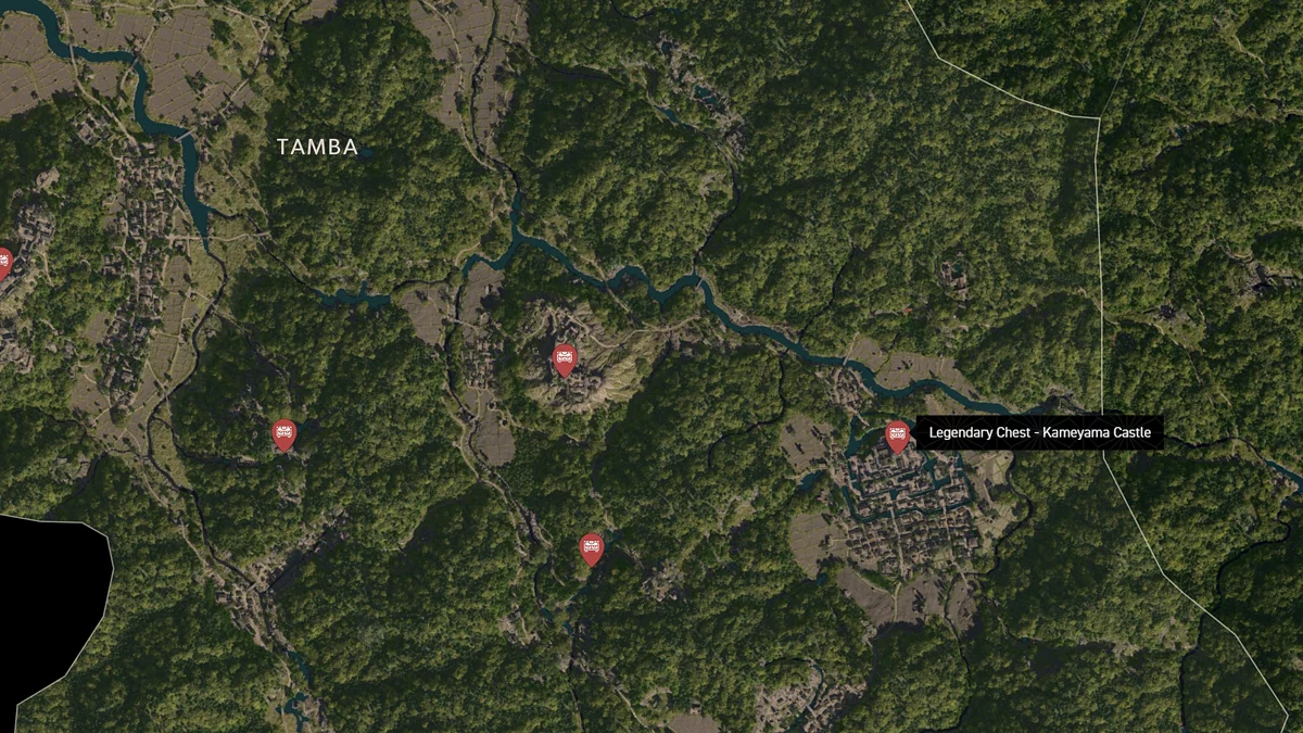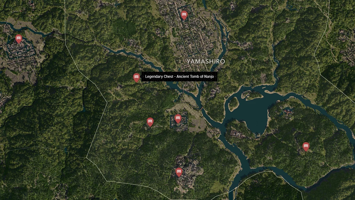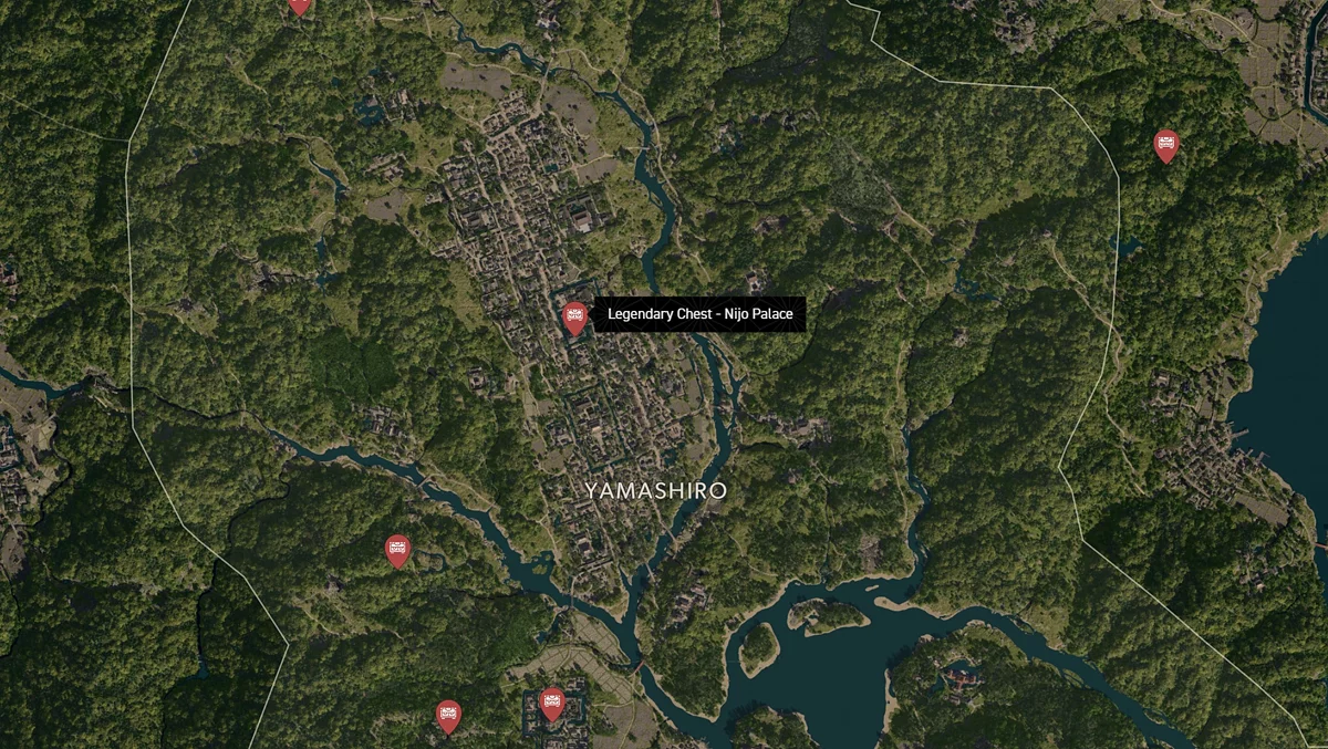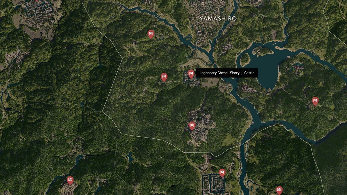 - Как найти: Крепость можно найти в центре округа. Чтобы открыть легендарный сундук, нужно победить двух самураев дайсё. Кейс можно найти в разрушенном здании на западной стороне территории замка.